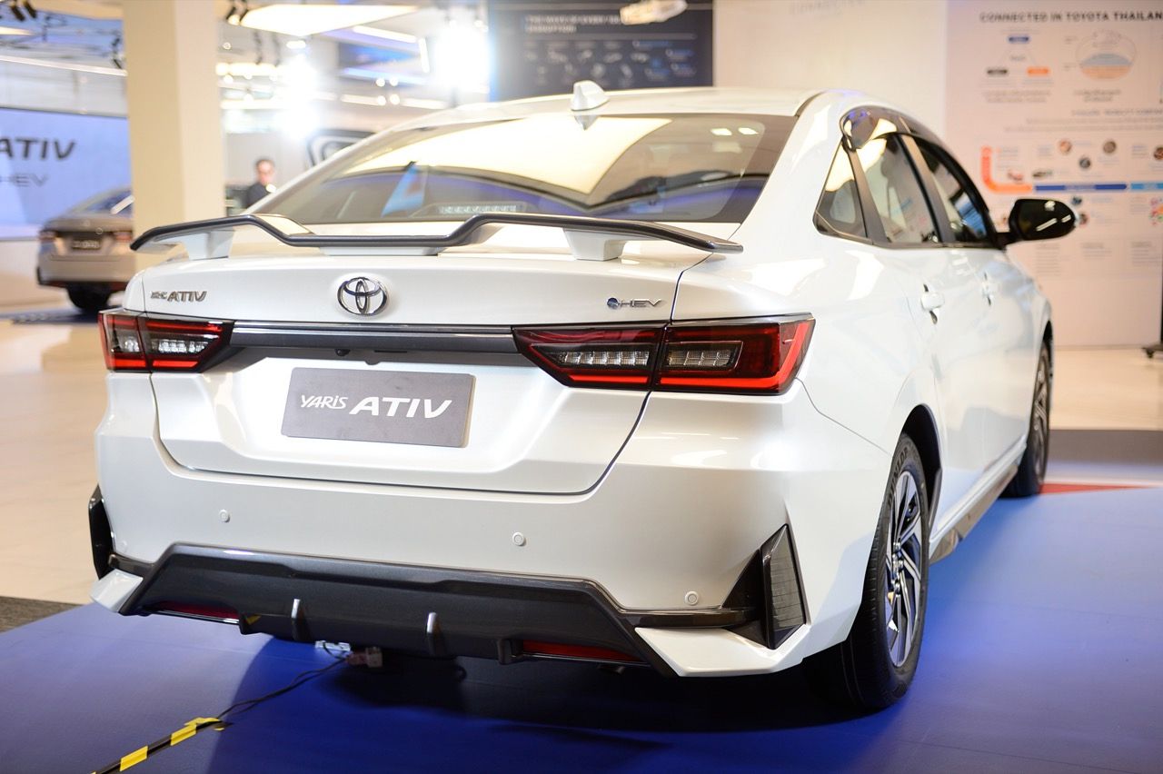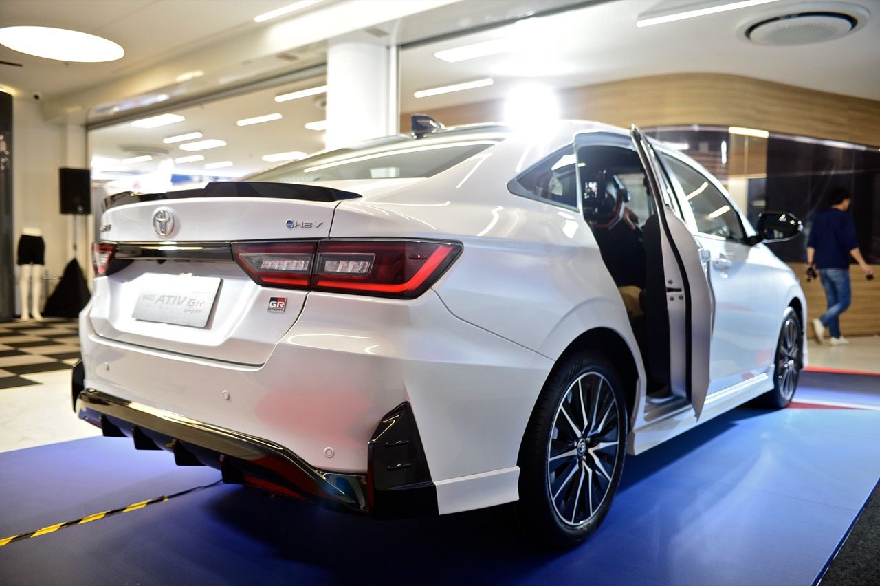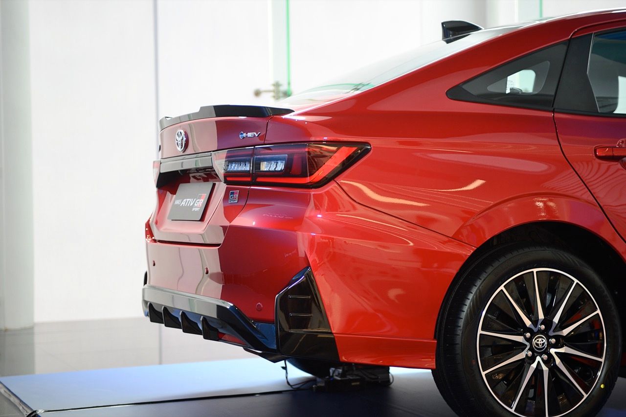 มาดูที่มิติตัวถังกันบ้าง ไม่มีอะไรเปลี่ยนแปลงสำหรับขนาดตัวถัง นอกจากรูน๊อตล้อที่เปลี่ยนจากสี่รู เป็นห้ารู เพื่อความแข็งแรง ขนาดความยาวของ Ativ HEV GR Sport อยู่ที่ 4440 มิลลิเมตร กว้าง 1740 มิลลิเมตร สูง 1480 มิลลิเมตร ความยาวฐานล้อ 2620 มิลลิเมตร ความสูงจากพื้นถึงใต้ท้องรถ 160 มิลลิเมตร รัศมีวงเลี้ยวแคบสุด 5.2 เมตร ความจุถังเชื้อเพลิง 36 ลิตร น้อยกว่ารุ่นเบนซินล้วน 4 ลิตร