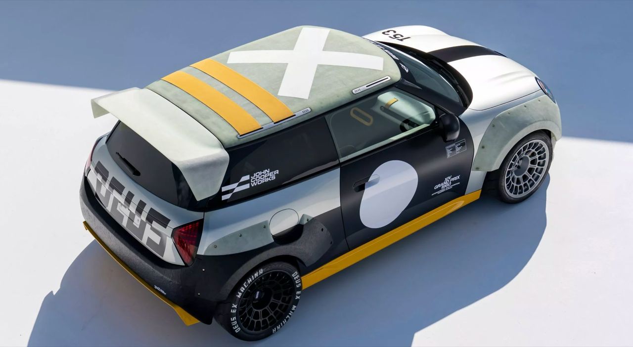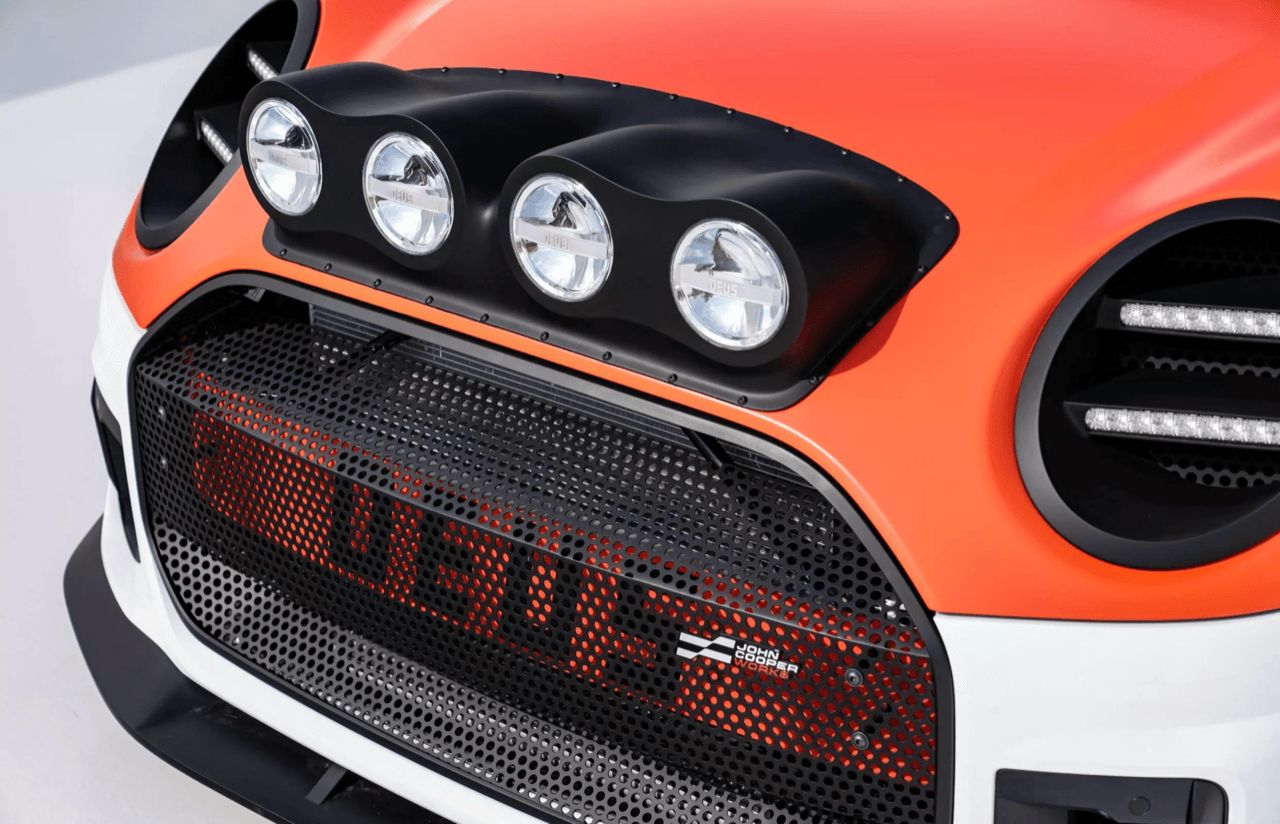 MINI Machina รถแฮทช์แบ็กรุ่นใหม่ คาดตัวถังด้วยสีแดง ขาว และดำ บังโคลนหน้าขยายใหญ่ขึ้น ไฟสปอร์ตไลท์สไตล์เรโทรบนฝากระโปรง กระจังหน้าสั่งทำพิเศษ ปีกหลังแบบรถแข่ง Can-Am และดิฟฟิวเซอร์ที่ใหญ่ขึ้น ไฟหน้ายังใช้แถบไฟ LED แทนกราฟิกปกติ ทำให้มีพื้นที่สำหรับติดตั้งช่องรับอากาศ