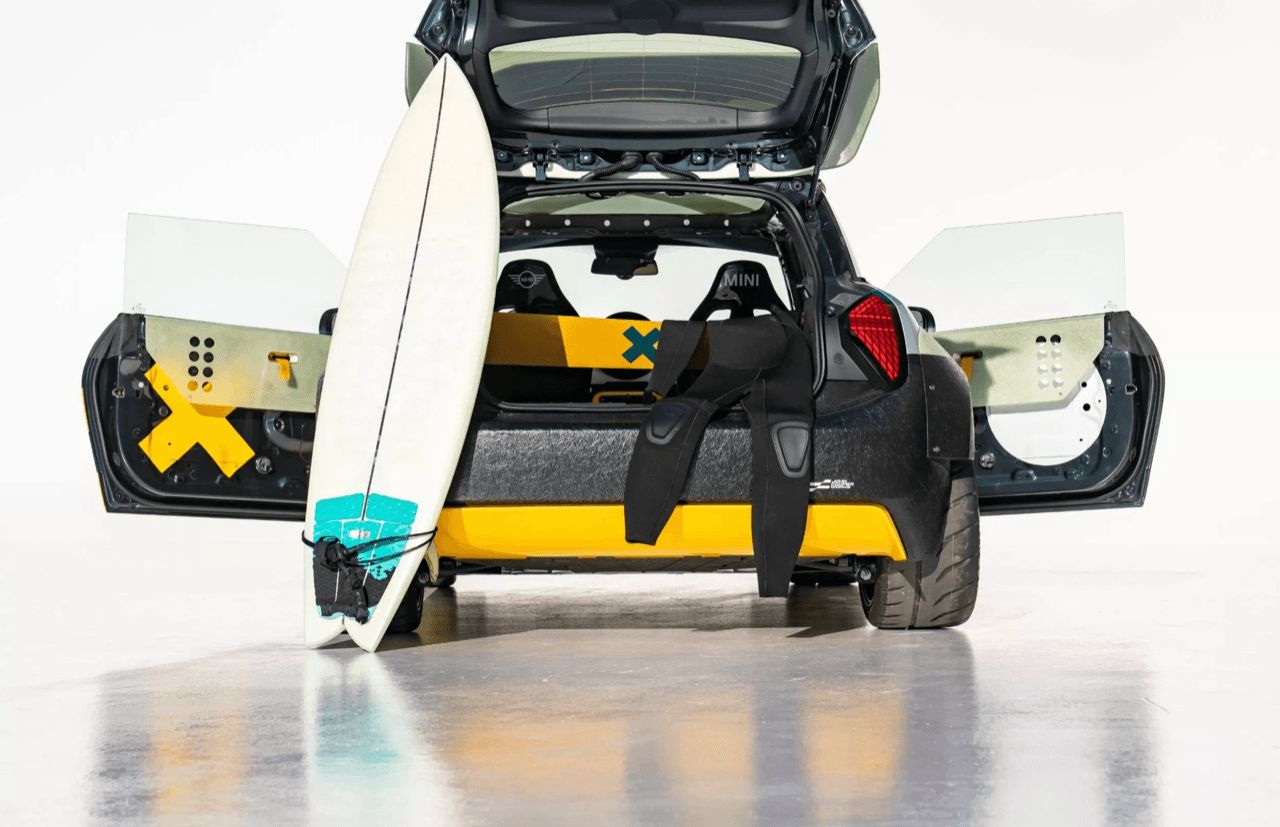 งานตกแต่งภายในของ MINI Skeg จัดแผงไฟเบอร์กลาสแบบกึ่งโปร่งแสง ถังน้ำสำหรับรถแข่งสองใบที่หุ้มด้วยวัสดุนีโอพรีน, สายรัดแทนมือจับที่เปิดประตู บอร์ดโต้คลื่นด้านหลังบนหลังคาไฟเบอร์กลาส ยึดด้วยสายรัดสีเหลืองสองเส้น มีการเพิ่มถาดไฟเบอร์กลาสสำหรับใส่ชุดเว็ทสูทเข้าไปด้วยเพื่อให้มันดูเท่และสมจริง