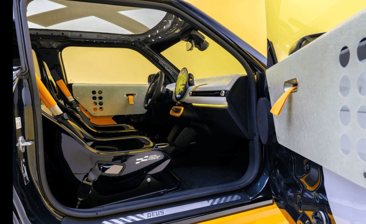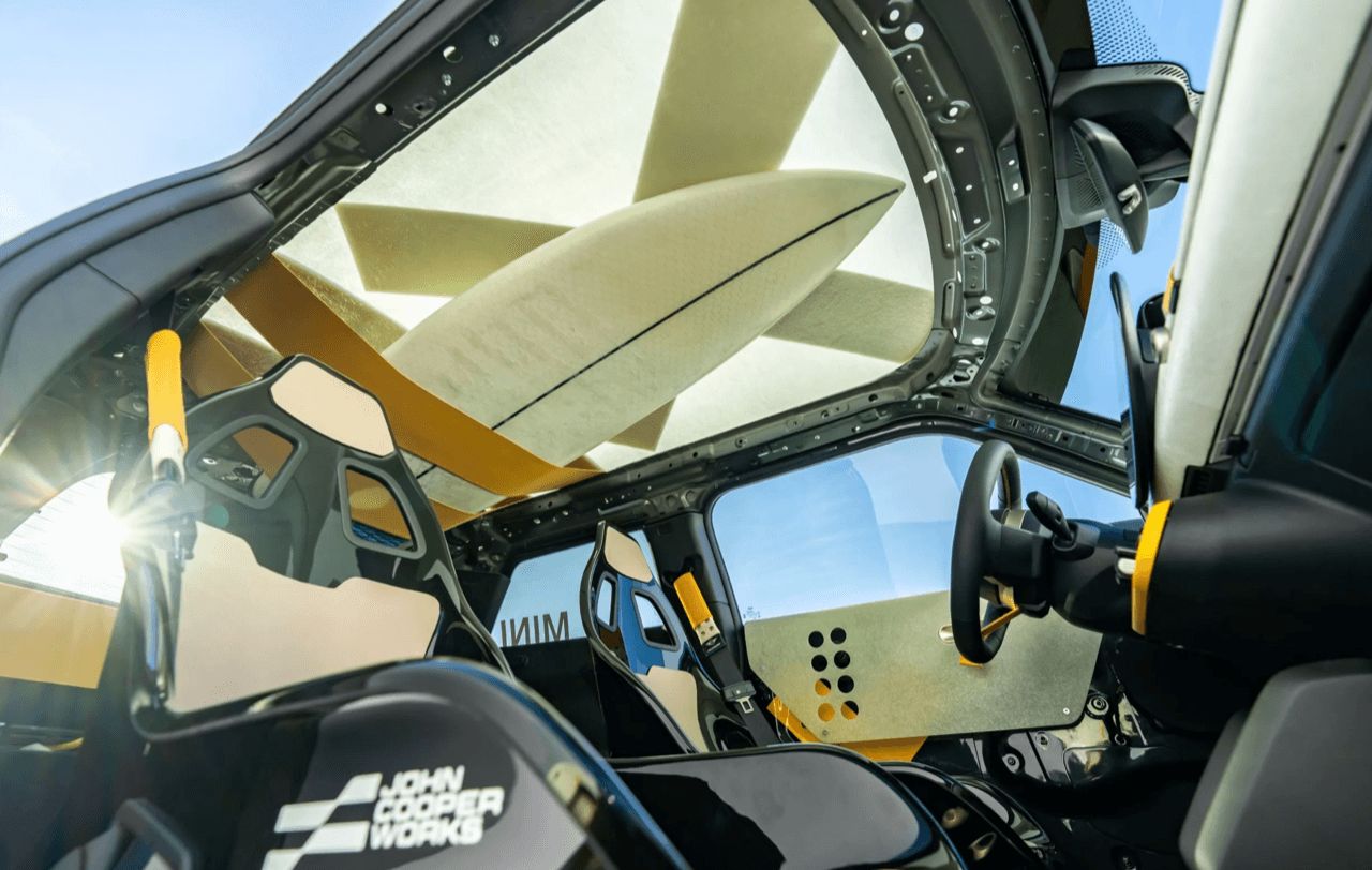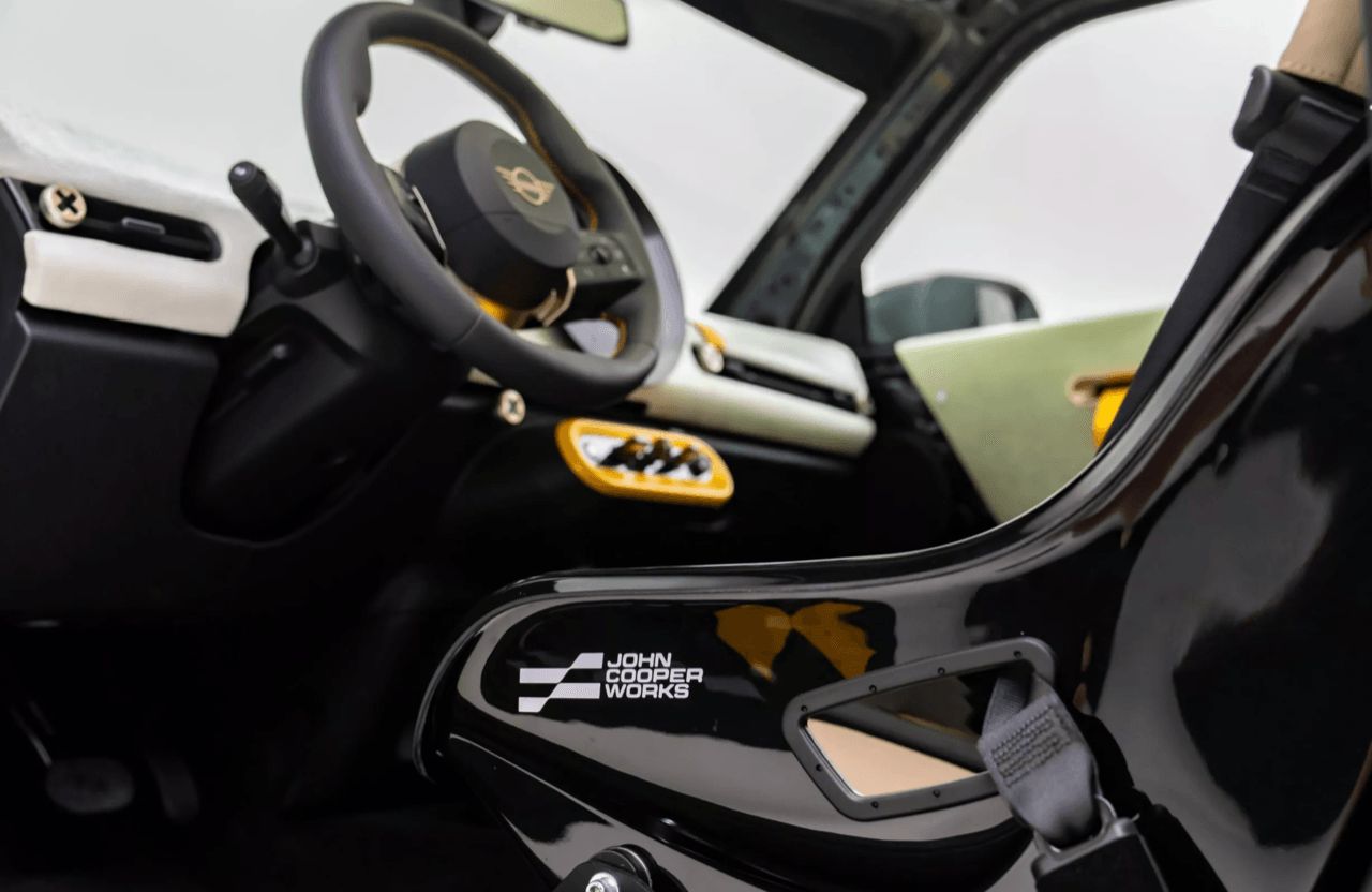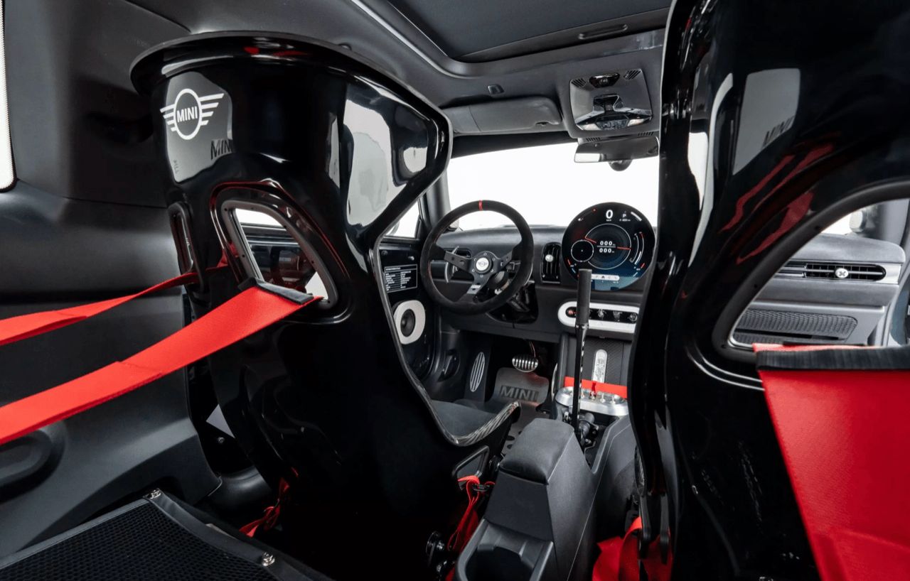 ภายใน ถอดแบบจากรถแข่ง เบาะนั่งแบบเรซซิ่ง พร้อมสายรัด 5 จุด พวงมาลัย 3 ก้าน แผ่นพื้นอะลูมิเนียม และโรลเคจ JCW รุ่นปรับแต่งพิเศษคันนี้ มาพร้อมกับเบรกมือแบบไฮดรอลิกกลไกแบบดั้งเดิมที่แฟนคลับโหยหา สวิตช์ จำนวนมากบนคอนโซลกลางแยกการใช้งานฟังก์ชันต่างๆ ทำให้ใช้งานง่ายกว่าการยัดเอาทั้งหมดไปไว้ในเมนูบนหน้าจอสัมผัสทรงกลม