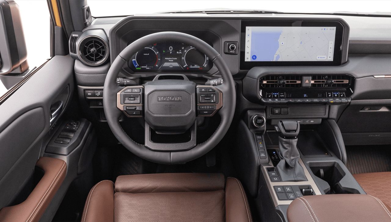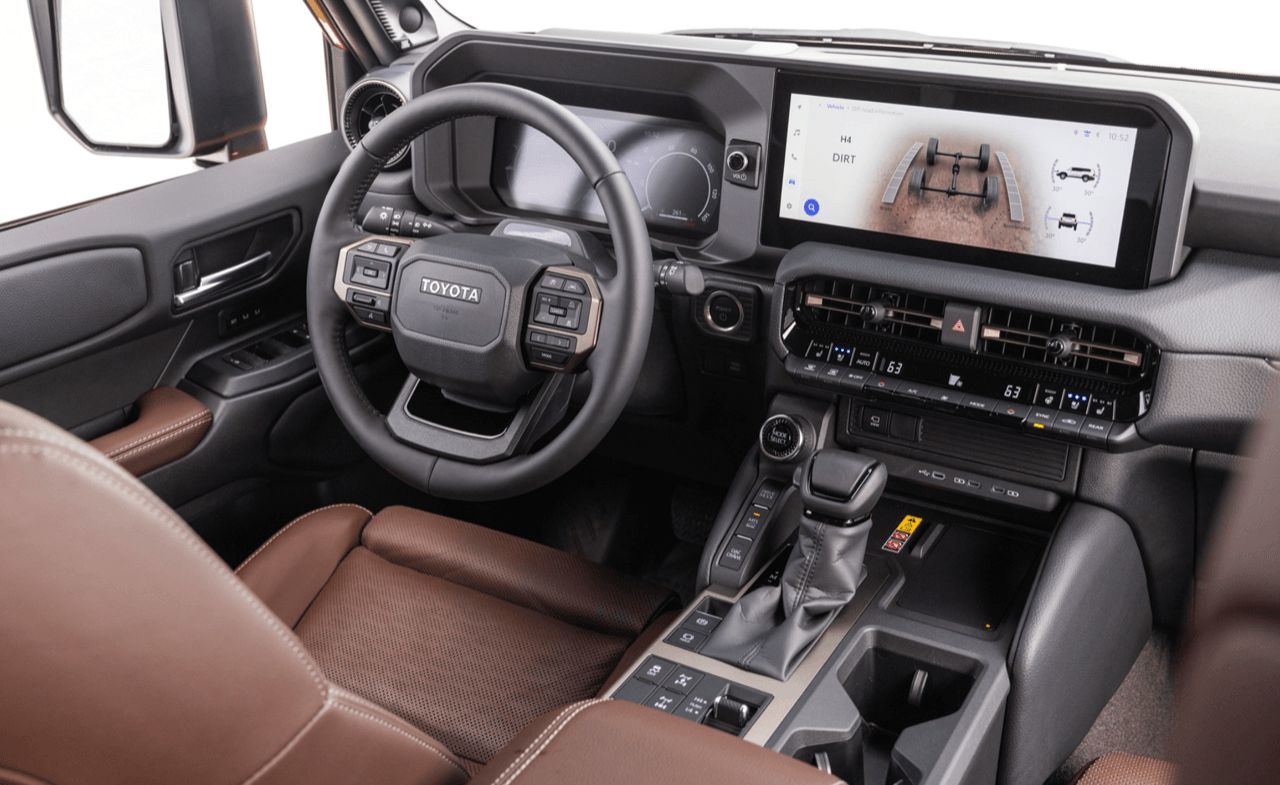 ต่างจาก Land Cruiser เจเนอเรชั่นก่อน สำหรับรุ่นใหม่ใช้เบาะแบบสองแถวห้าที่นั่ง Toyota ได้ลดขนาดตัวถังลงเล็กน้อยทำให้ Cruiser แข่งกับคู่แข่งขนาดกลางอย่าง Ford Bronco และ Jeep Wrangler แทนที่จะเป็น SUV ขนาดใหญ่ รุ่นพื้นฐานดูเหมือนจะขาดความหรูหราไปบ้าง แต่ก็ยังมีอุปกรณ์อำนวยความสะดวกครบ เช่น เบาะนั่งปรับอุณหภูมิได้ พวงมาลัยปรับอุณหภูมิได้ เครื่องเสียง 6 ลำโพง ส่วน Land Cruiser รุ่นท็อป มีห้องโดยสารที่หรูหราขึ้น ประกอบด้วยเบาะนั่งแบบมีช่องระบายอากาศ เครื่องเสียง 10 ลำโพง มีเบาะหนังให้เลือกใช้แบบออปชันเสริม สามารถเก็บกระเป๋าเดินทางขึ้นเครื่องได้ 17 ใบ หลังเบาะหลัง และ 31 ใบเมื่อพับเบาะหลัง