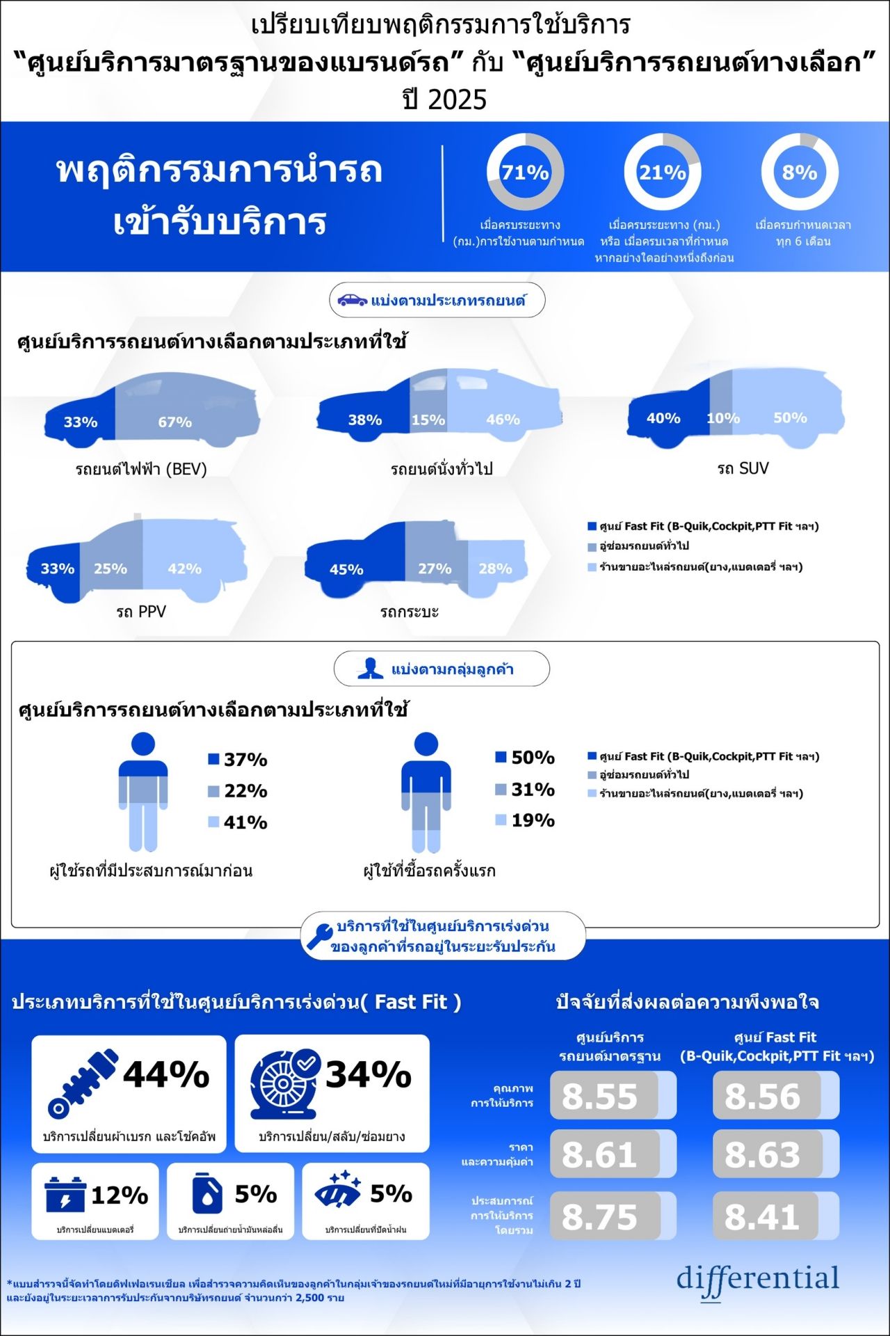 ดิฟเฟอเรนเชียล (ประเทศไทย) เผยผลสำรวจ ผู้ใช้รถเลือกใช้ศูนย์บริการซ่อมเร่งด่วน หรือ Fast Fit เพราะราคาที่คุ้มค่า โดยเฉพาะคนใช้รถกระบะ ส่วนศูนย์บริการมาตรฐานแบรนด์รถยังคงนำด้านความพึงพอใจในการบริการ