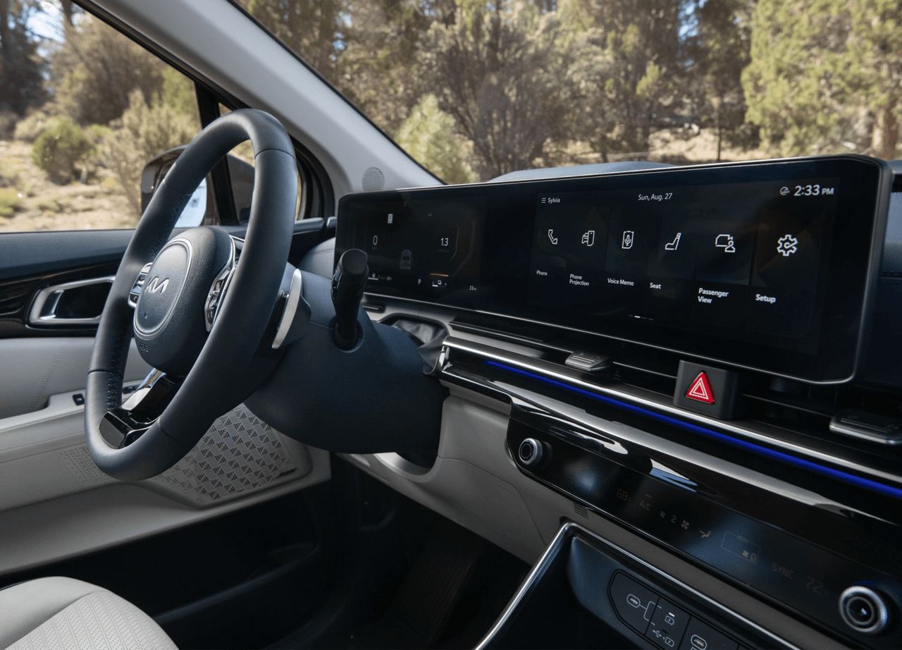 ห้องโดยสารของ Kia Carnival HEV 7-seater กว้างขวางและร่วมสมัย จอโค้งแบบพาโนรามิก ผสานรวมจอแสดงผลแบบคลัสเตอร์ขนาด 12.3 นิ้ว หน้าจออินโฟเทนเมนท์แบบสัมผัสขนาด 12.3 นิ้ว แบบไร้รอยต่อ ระบบเชื่อมต่อ Android Auto™ และ Apple CarPlay® แบบไร้สาย ฟังก์ชันสั่งงานด้วยเสียง ระบบปรับอากาศด้านหน้าแบบอัตโนมัติ ปรับอุณหภูมิได้แบบแยกอิสระทั้งโซนด้านหน้าฝั่งซ้าย-ขวา และโซนด้านหลัง สวิตช์สำหรับสลับการควบคุมระบบอินโฟเทนเมนต์และระบบปรับอากาศ การควบคุมทั้งระบบไว้บนอินเตอร์เฟซเดียวกัน สัมผัสหนึ่งครั้งก็สามารถสลับการควบคุมไปมาระหว่างระบบอินโฟเทนเมนต์กับระบบปรับอากาศ ลดความซับซ้อน คงความสะดวกในการใช้งาน ติดตั้งพอร์ต USB-C มาตรฐาน รวม 6 พอร์ต กระจายทั้งสามแถวที่นั่ง