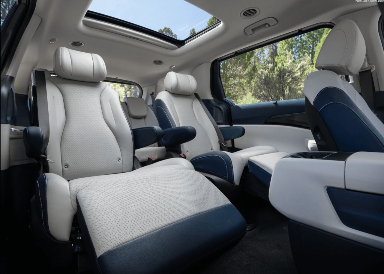 เบาะที่นั่งของคนขับในรุ่น The new Kia Carnival HEV 7-seat Luxury ยังได้ติดตั้งระบบจดจำตำแหน่งเบาะนั่งและระบบ Welcome Seat สำหรับผู้ขับ เบาะนั่งคู่หน้าและเบาะนั่งแถวที่สอง พร้อมระบบระบายอากาศและระบบอุ่นเบาะ เบาะผู้โดยสารแถวสองเป็นแบบ Relaxation Seat ฟังก์ชัน ปรับเอนนอน สามารถปรับระดับได้เต็มรูปแบบ พร้อมเบาะรองขาแบบปรับไฟฟ้า มีโหมด One-touch Relaxation สั่งงานด้วยการกดเพียงครั้งเดียว รุ่น Premium เบาะนั่งแถวสองเป็นเบาะแบบ Captain Seats ถอดออกได้เพื่อเพิ่มความอเนกประสงค์ในการใช้งาน ปรับเปลี่ยนตำแหน่งให้เป็นแบบนั่งหันหน้าเข้าหากันได้ ทั้งสองรุ่นได้รับการปรับให้มีพื้นที่ทางเดิน (Walkthrough access) ที่เอื้อต่อการเข้า-ออกเบาะหลัง ได้สะดวกยิ่งขึ้น โดยเฉพาะเด็กและผู้สูงอายุ จุดยึดสําหรับติดตั้งเบาะนั่งสําหรับเด็ก (ISOFIX) มีให้ในตำแหน่งที่นั่ง 4 ตำแหน่งเป็นมาตรฐาน (2 จุดบนเบาะนั่งแถวสอง และอีก 2 จุดบนเบาะแถวสาม)