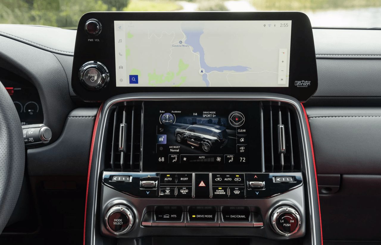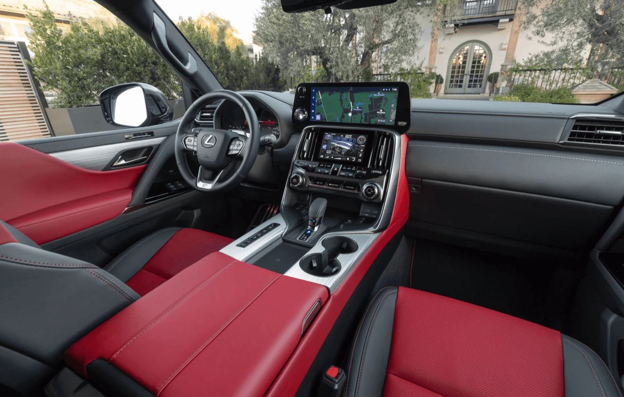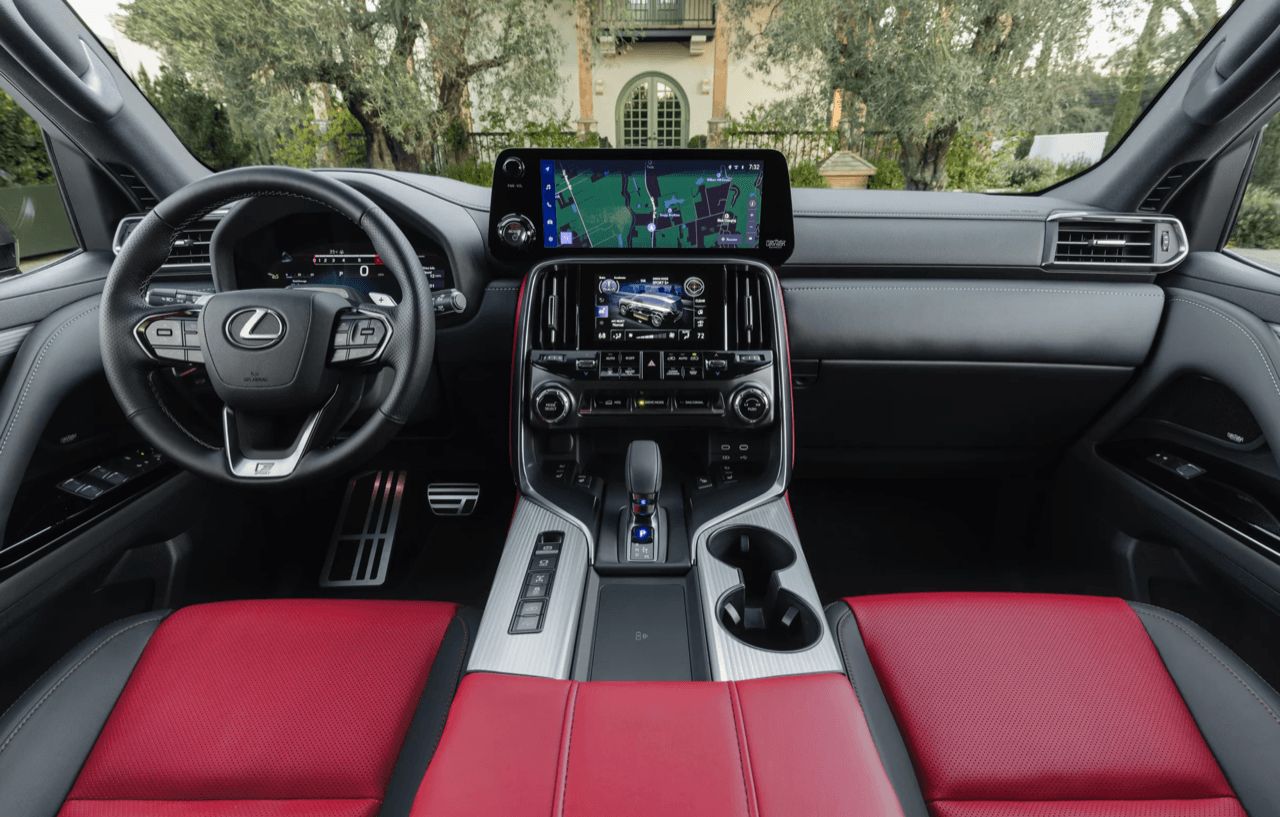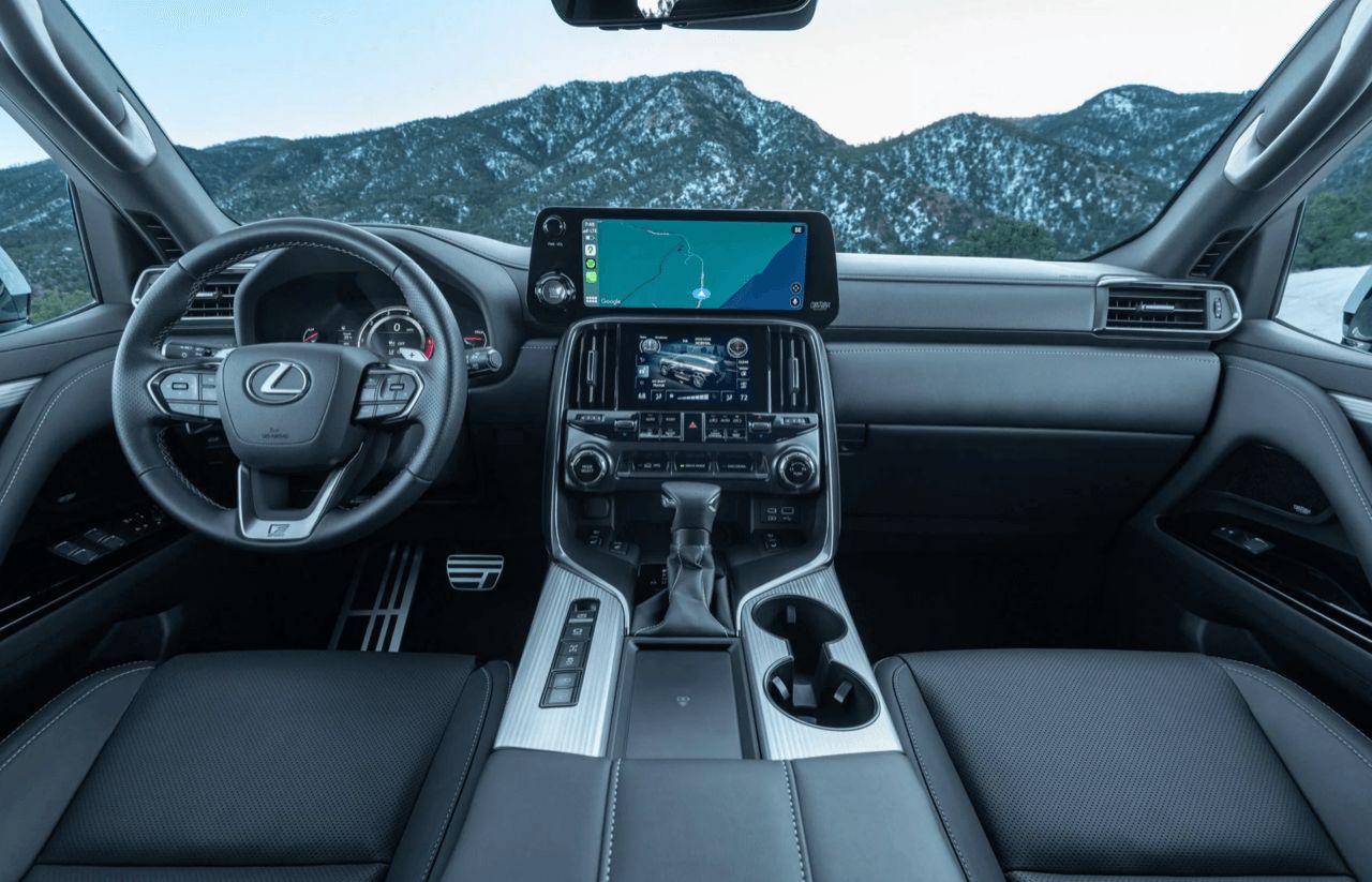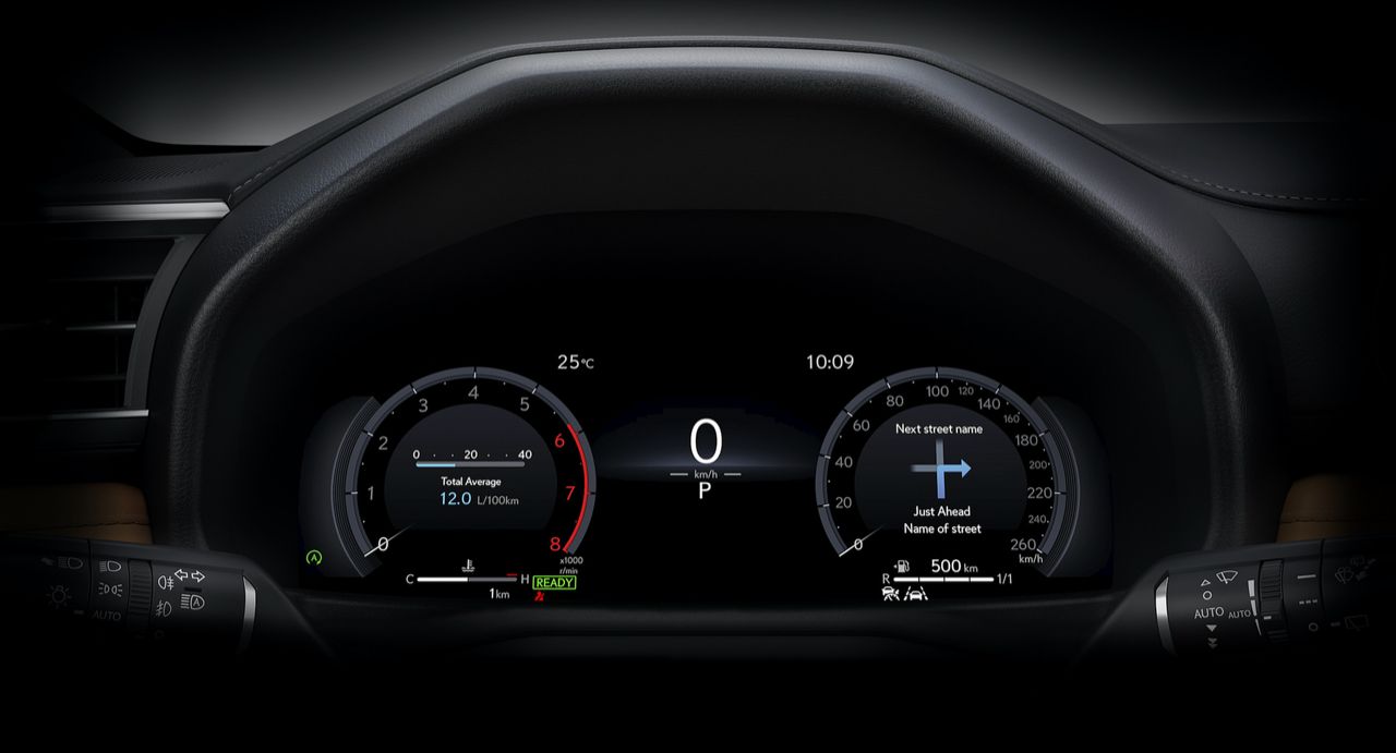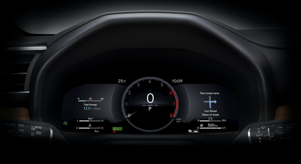 ปุ่มทั้งหมดบนพวงมาลัยใช้งานง่ายและมีเสียงคลิก พวงมาลัย Lexus ยังคงมอบสัมผัสที่ให้ความรู้สึกละเอียดอ่อน ก้านไฟเลี้ยวและที่ปัดน้ำฝนด้านหลังพวงมาลัย ชุดมาตรวัดดิจิทัลขนาด 12.3 นิ้วเป็นอุปกรณ์มาตรฐาน ซึ่งเป็นที่นิยมมากในรถยนต์ Lexus และ Toyota หลายรุ่นในปัจจุบัน รูปลักษณ์จอภาพสวยงามและมีความละเอียดสูง สามารถปรับแต่งข้อมูลต่างๆ ได้ตามใจชอบ ชุดมาตรวัดดิจิทัลคมชัด แต่มีจอแสดงผลบนกระจกหน้ารถ HUD เป็นอุปกรณ์มาตรฐาน แสดงข้อมูลต่างๆ บนกระจกหน้ารถ สามารถเลือกมุมมองได้สามแบบ ตั้งแต่แบบน้อยไปจนถึงแบบเต็มรูปแบบ เมื่อมองไปอีกด้าน แม้ว่าคุณจะเข้าใจผิดคิดว่า LX เป็น Toyota ได้ง่ายๆ เพียงเพราะแผงหน้าปัดดิจิทัลและจอแสดงผลบนกระจกหน้า แต่ระบบอินโฟเทนเมนต์หน้าจอสัมผัสขนาด 14.0 นิ้วตรงกลางนั้นมีขนาดใหญ่กว่ามาก