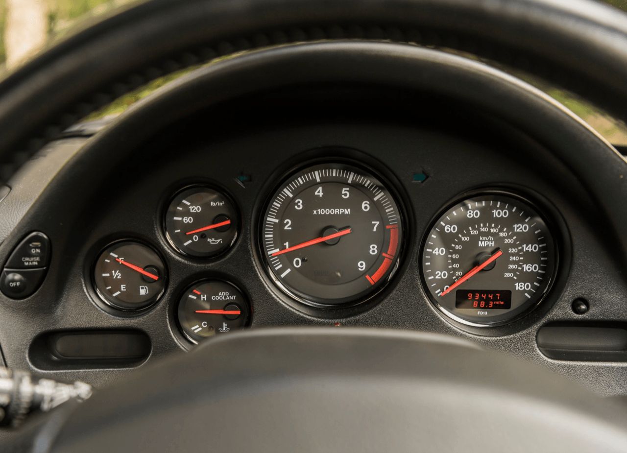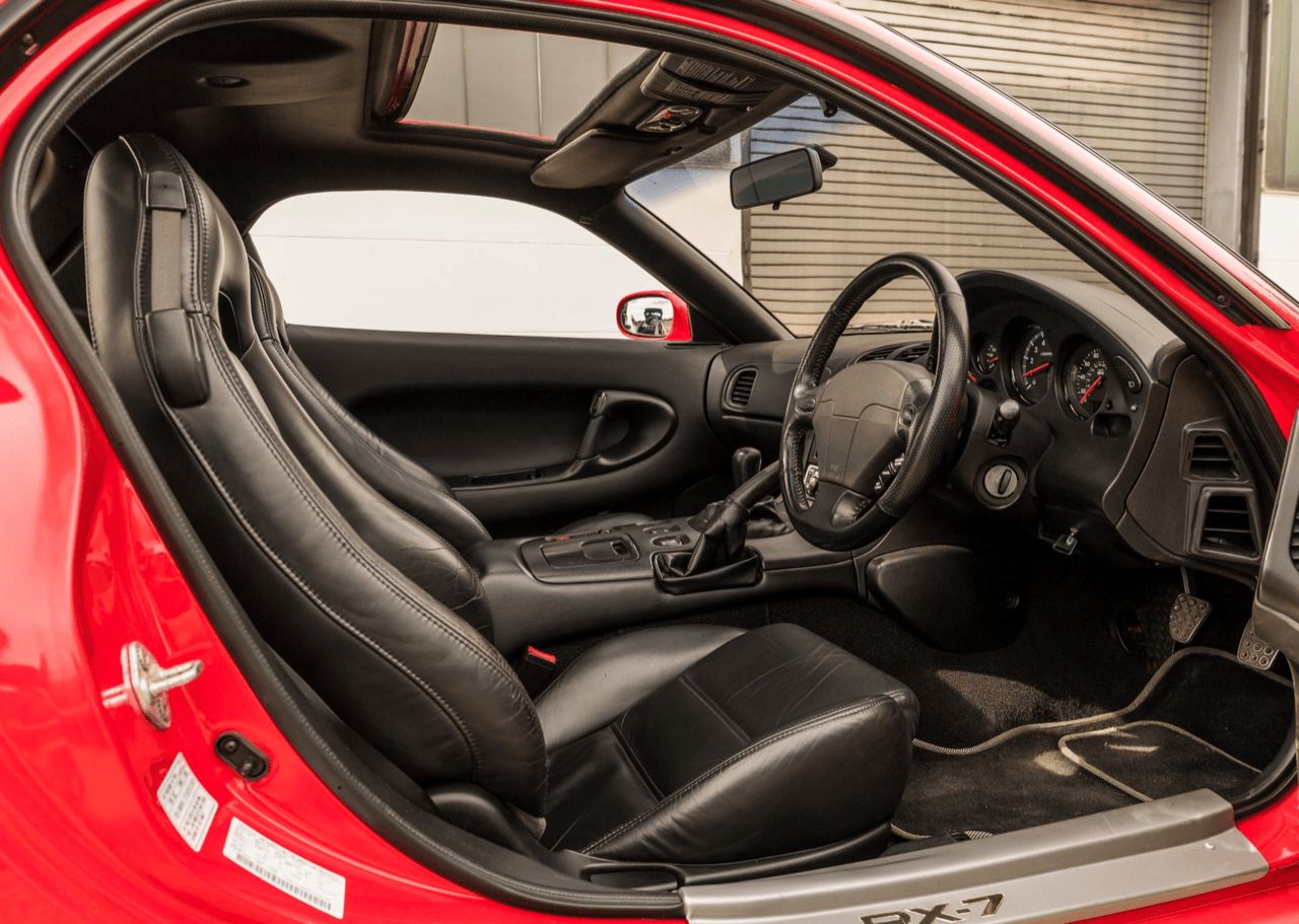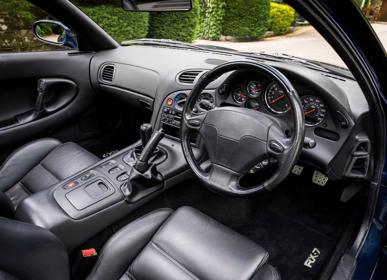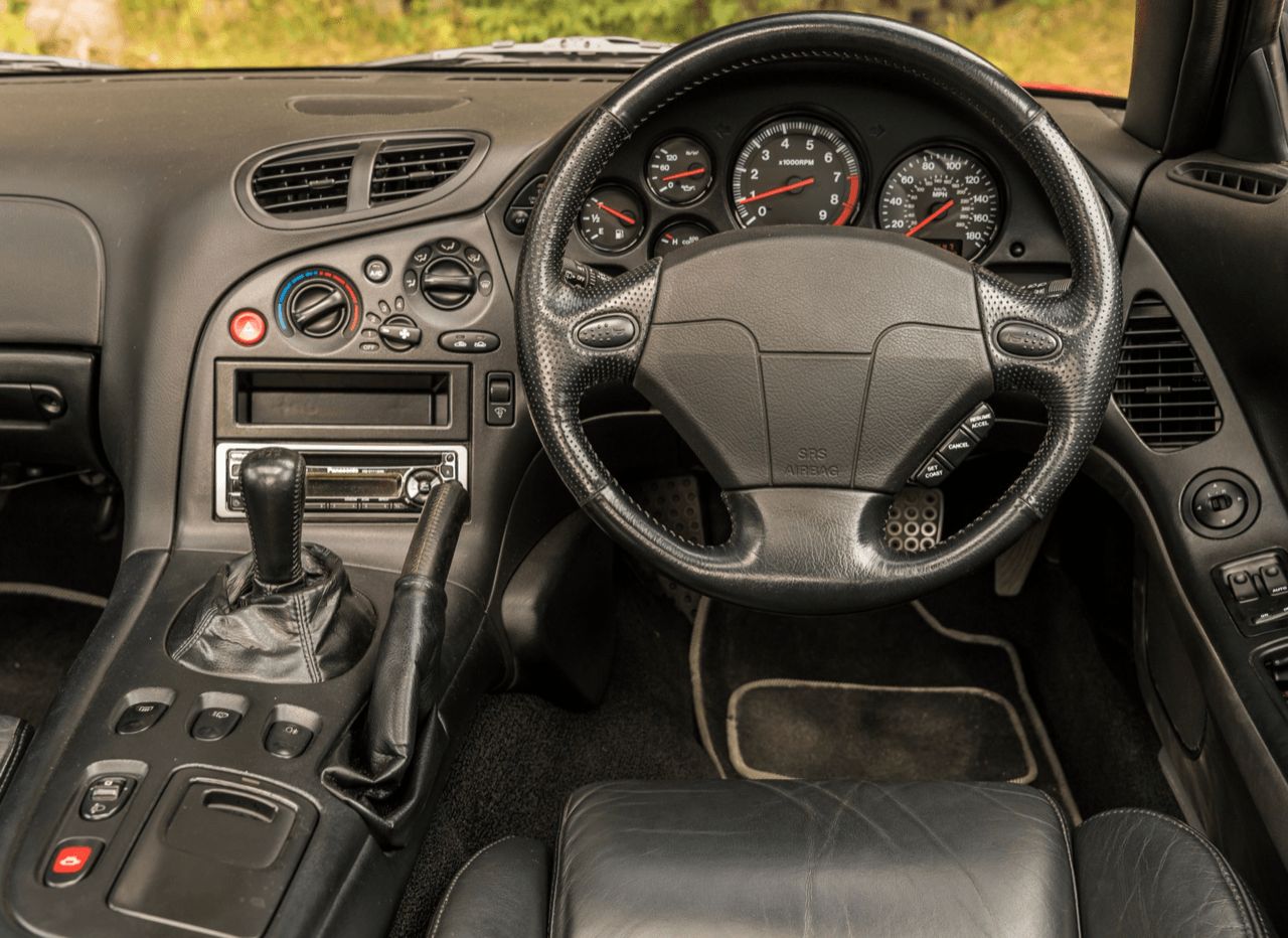 ตำแหน่งการขับนั้นดีสุดในกลุ่มรถสปอร์ตยุค 90 ตำแหน่งของเท้าซ้ายวางตรงไปข้างหน้าบนคลัตช์ที่อยู่ใกล้กับแป้นเบรก เปิดโอกาสให้พวกที่ชอบใช้เท้าซ้ายเบรกสามารถใช้งานได้อย่างคล่องแคล่ว คันเร่งถูกตั้งค่าไว้โดยคนที่เป็นโรคเส้นประสาทอักเสบ คอนโซลกลางสูงจนเกือบจะถึงแนวสายตา ความร้อนที่เกิดจากเครื่องยนต์ในรถ RX-7 FD ปีสูงๆอาจเล็ดรอดเข้ามาในค็อกพิต เหมาะกับสภาพอากาศที่หนาวเย็นแต่ร้อนตับแลบเมื่อเอามาขับในไทย ตรงหน้าคนขับคือมาตรวัดรอบที่มีรอบสูงสุด 9,000 รอบต่อนาที มากกว่า Ferrari ทุกรุ่นในยุคนั้น ทางด้านขวาคือมาตรวัดความเร็วหน่วยวัดแบบกิโลเมตรต่อชั่วโมง มาตรวัดอัตราการไหลของไอดี การจัดการน้ำมัน อุณหภูมิ เชื้อเพลิง และน้ำหล่อเย็น ที่จัดวางอยู่ในหน้าปัดย่อยสามหน้าปัดทางด้านซ้าย มาตรวัดชัดเจนและแม่นยำทั้งกลางวันและกลางคืน