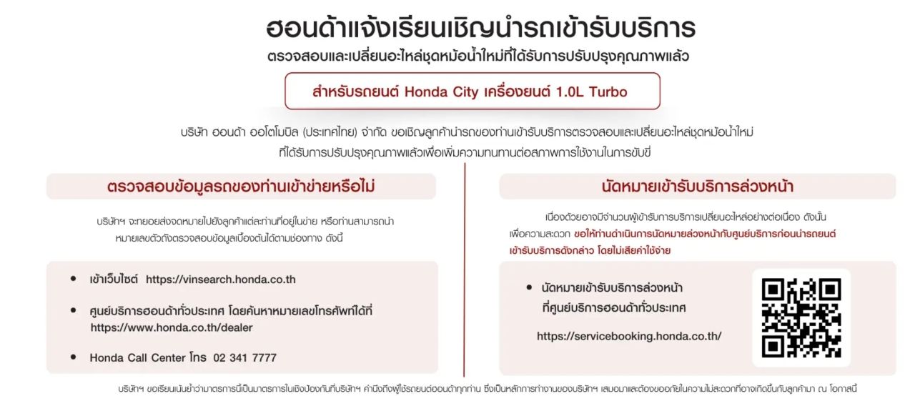 เมื่อวันที่ 25 ก.พ. 69 บริษัท ฮอนด้า ออโตโมบิล ประเทศไทย จำกัด เปิดเผยว่า บริษัทขอเชิญชวนลูกค้าผู้ใช้งาน Honda City 1.0 Turbo เข้ารับบริการตรวจสอบและเปลี่ยนอะไหล่ชุดหม้อน้ำใหม่ที่ได้รับการปรับปรุงคุณภาพแล้วเพื่อความทนทานต่อสภาพการใช้งานในการขับขี่