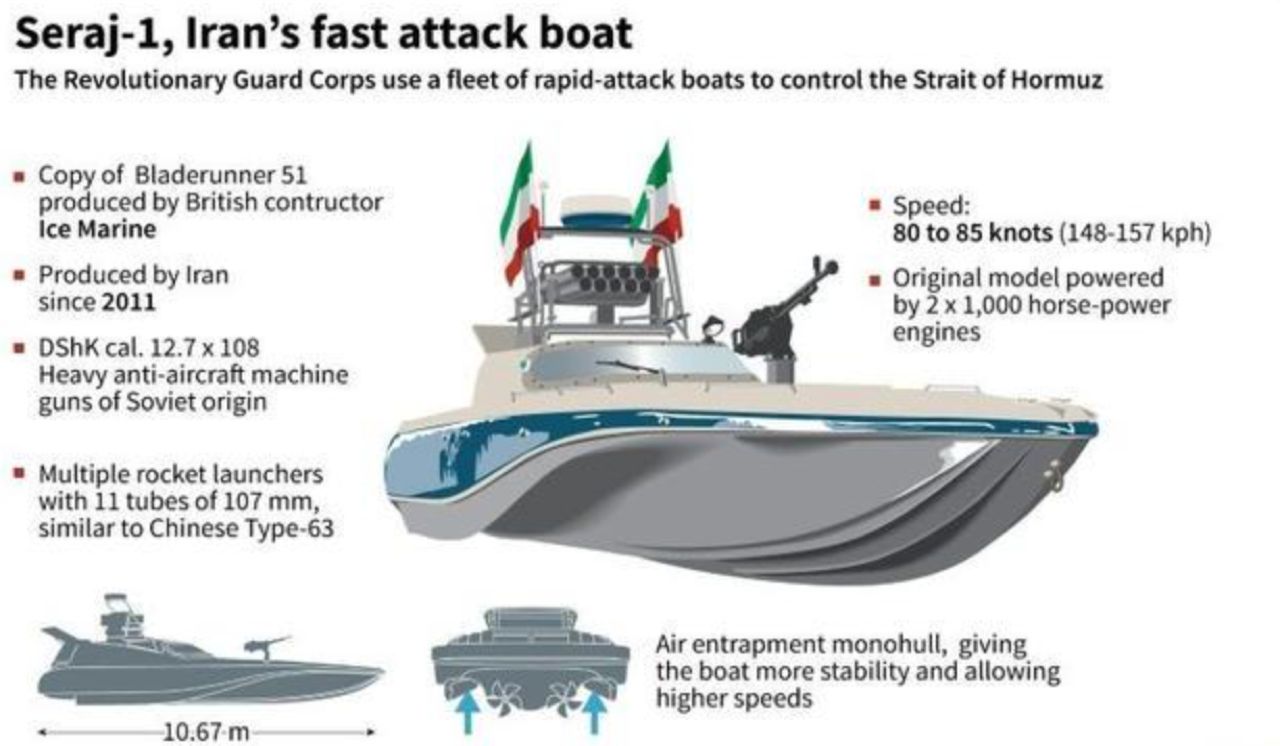 เรือเร็วติดอาวุธ (Fast Attack Craft - FAC): อิหร่านระดมเรือเร็วติดขีปนาวุธจำนวนหลายร้อยลำเข้าประจำการในจุดยุทธศาสตร์ 16 แห่งรอบเกาะ Larak เพื่อเตรียมโจมตีแบบฝูงผึ้งหากมีการฝ่าฝืน.