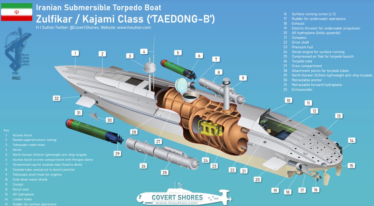 เรือรบรุ่นใหม่ล่าสุดของอิหร่าน ความเร็วสูงสุด 60 กิโลเมตรต่อชั่วโมง เครื่องยนต์หลัก ดีเซลเทอร์โบ 4 เครื่องยนต์ (อิหร่านผลิตเครื่องยนต์เอง) อาวุธหลัก ขีปนาวุธหลากชนิด (ASCM, SAM), ปืนกล Gatling รัศมีทำการ 5,000 ไมลทะเล กองทัพเรืออิหร่าน (IRGCN) ใช้ยุทธวิธี "ปฏิเสธการเข้าถึง" (Sea Denial) เพื่อปิดช่องแคบฮอร์มุซ โดยใช้การผสมผสานระหว่างเรือรบรุ่นใหม่และอาวุธนอกชายฝั่ง ดังนี้