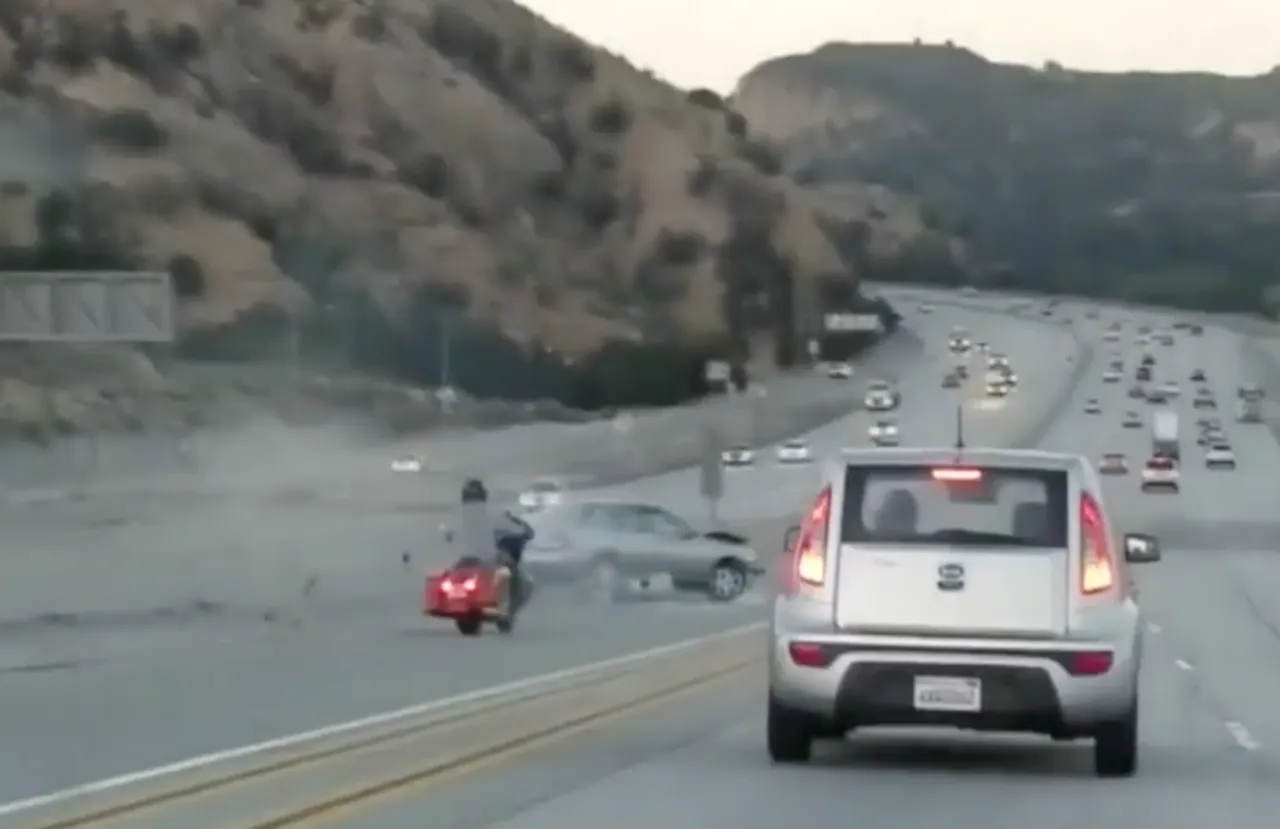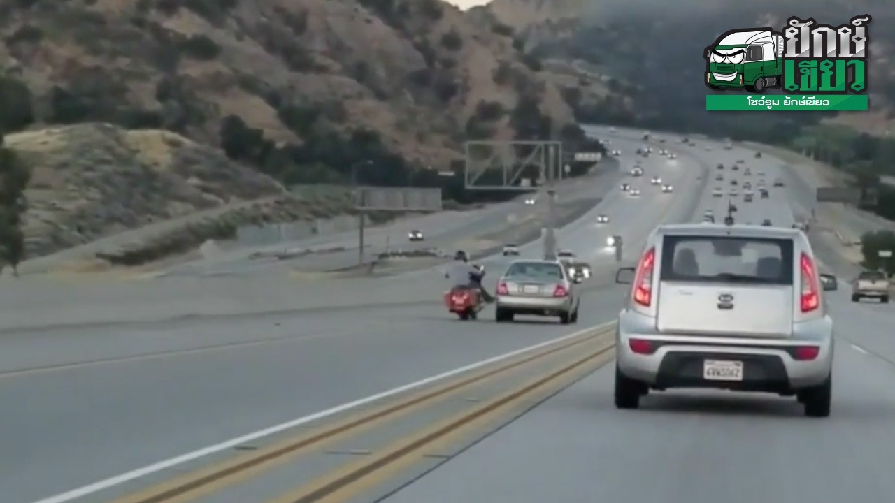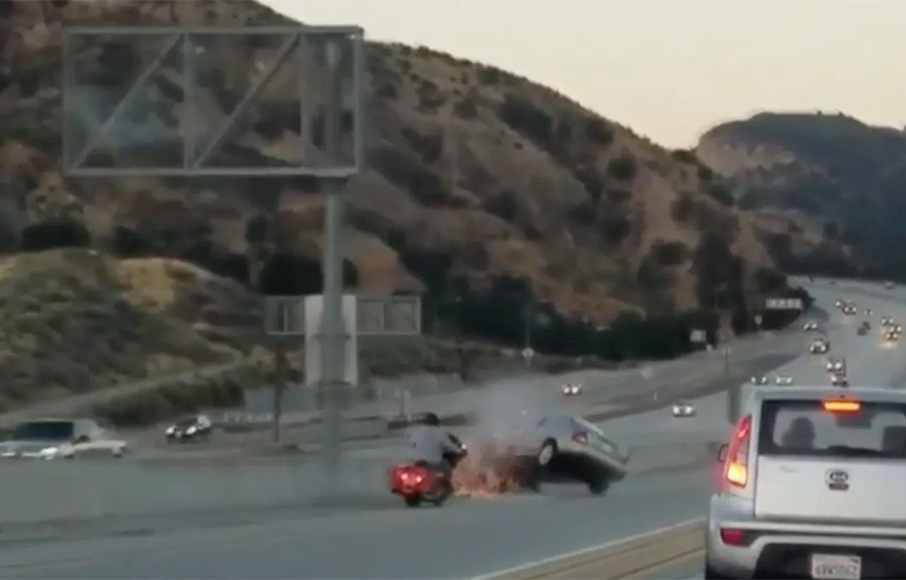 ตำรวจทางหลวงในมลรัฐแคลิฟอร์เนียกำลังค้นหาผู้ขับขี่รถจักรยานยนต์ที่ถูกบันทึกภาพวิดีโอเอาไว้ได้ขณะที่คนขับรถจักรยานยนต์คันดังกล่าวใช้เท้าถีบรถเก๋งจนเสียหลักและตามมาด้วยการเกิดอุบัติเหตุ เหตุการณ์ดังกล่าวเกิดขึ้นบนทางหลวงหมายเลข 14 ในซานตาแคริต้า เมื่อวันพุธที่ 21 มิถุนายน 2560 การใช้เท้าถีบรถเก๋งจนเสียหลักก่อนพุ่งชนปูนกั้นแล้วกระดอนไปชนกับรถกระบะสีขาวที่วิ่งตามมา ทำให้ผู้ขับขี่รถยนต์ปิกอัพได้รับบาดเจ็บเมื่อรถเกิดการพลิกคว่ำ