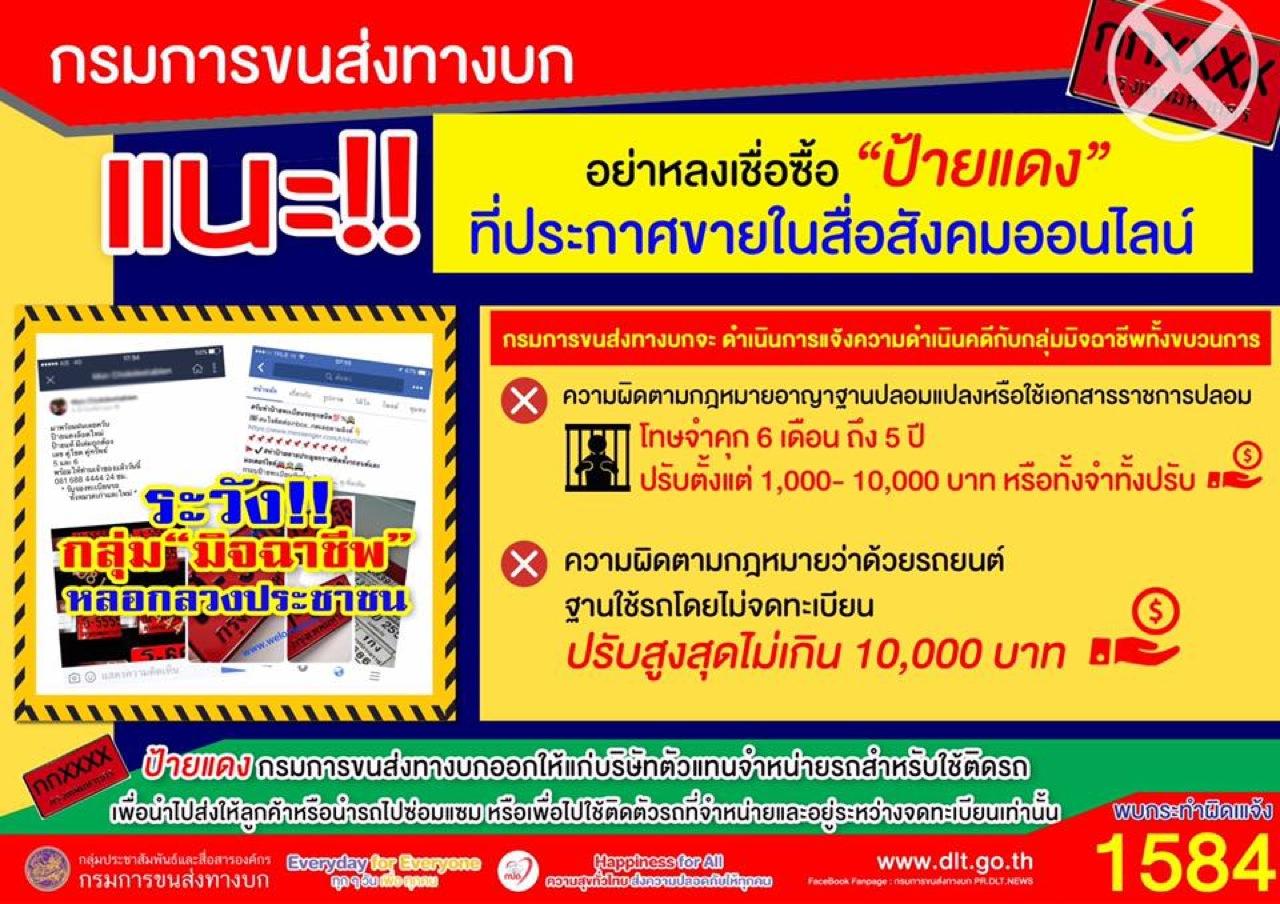 กรมการขนส่งทางบกแจ้งเตือนประชาชนเรื่องป้านทะเบียนปลอม ป้ายแดงไม่มีขาย อย่าหลงเชื่อซื้อป้ายแดงปลอมที่ประกาศขายในสื่อสังคมออนไลน์ เนื่องจากป้ายแดงนั้นไม่มีขายให้กับบุคคลทั่วไป การประกาศขายป้ายแดงในสื่อออนไลน์ ถือเป็นการกระทำที่ผิดกฎหมาย หรือปลอมแปลงเอกสารของทางราชการ เตือน! ใช้ป้ายแดงปลอมผิดกฎหมายมีโทษถึงขั้นจำคุกหรือปรับสูงสุดไม่เกิน 10,000 บาท หรือทั้งจำทั้งปรับ แนะนำวิธีสังเกตป้ายแดงที่ถูกต้อง มีตัวย่อนูน ขส ที่มุมด้านล่างขวา มีลายน้ำตราเครื่องหมายราชการกรมการขนส่งทางบกชัดเจน