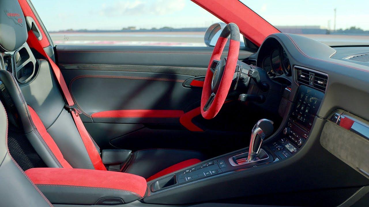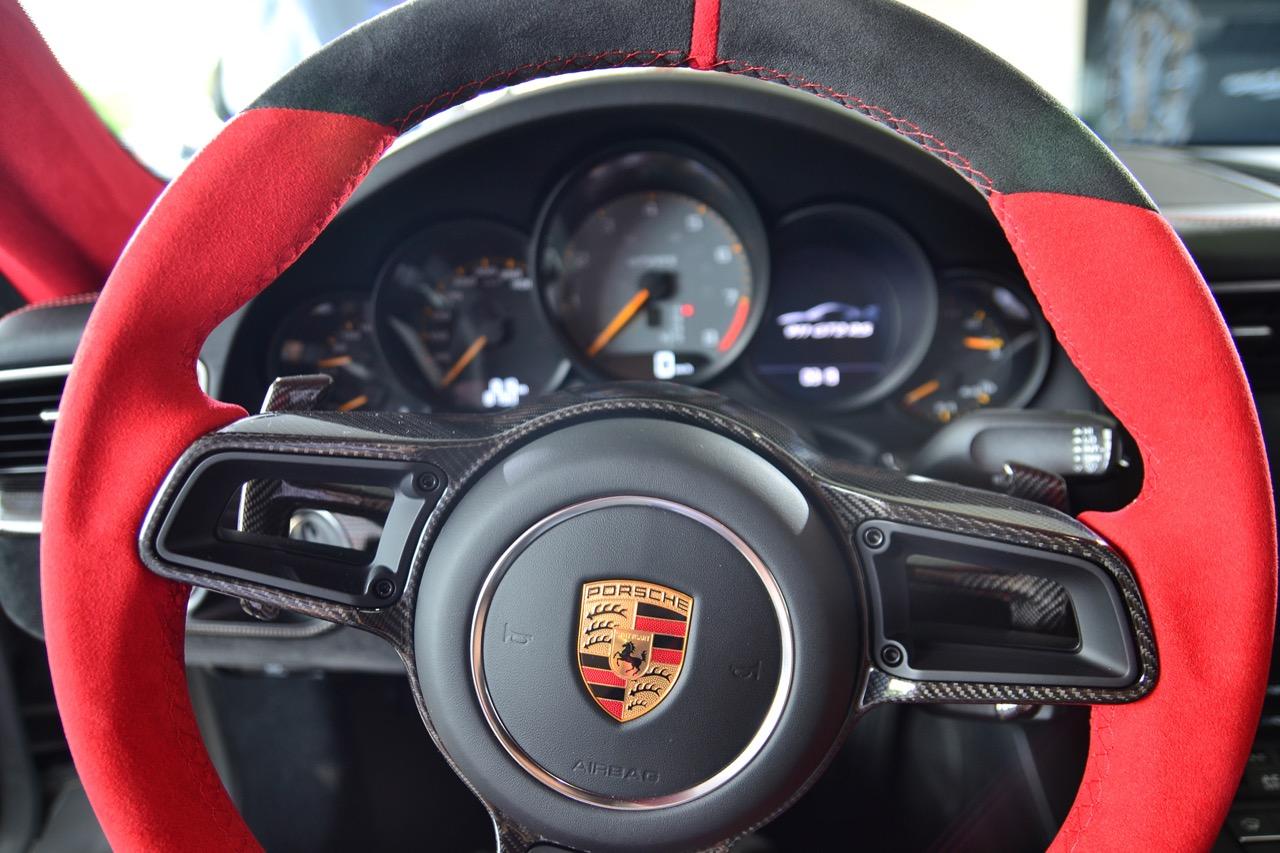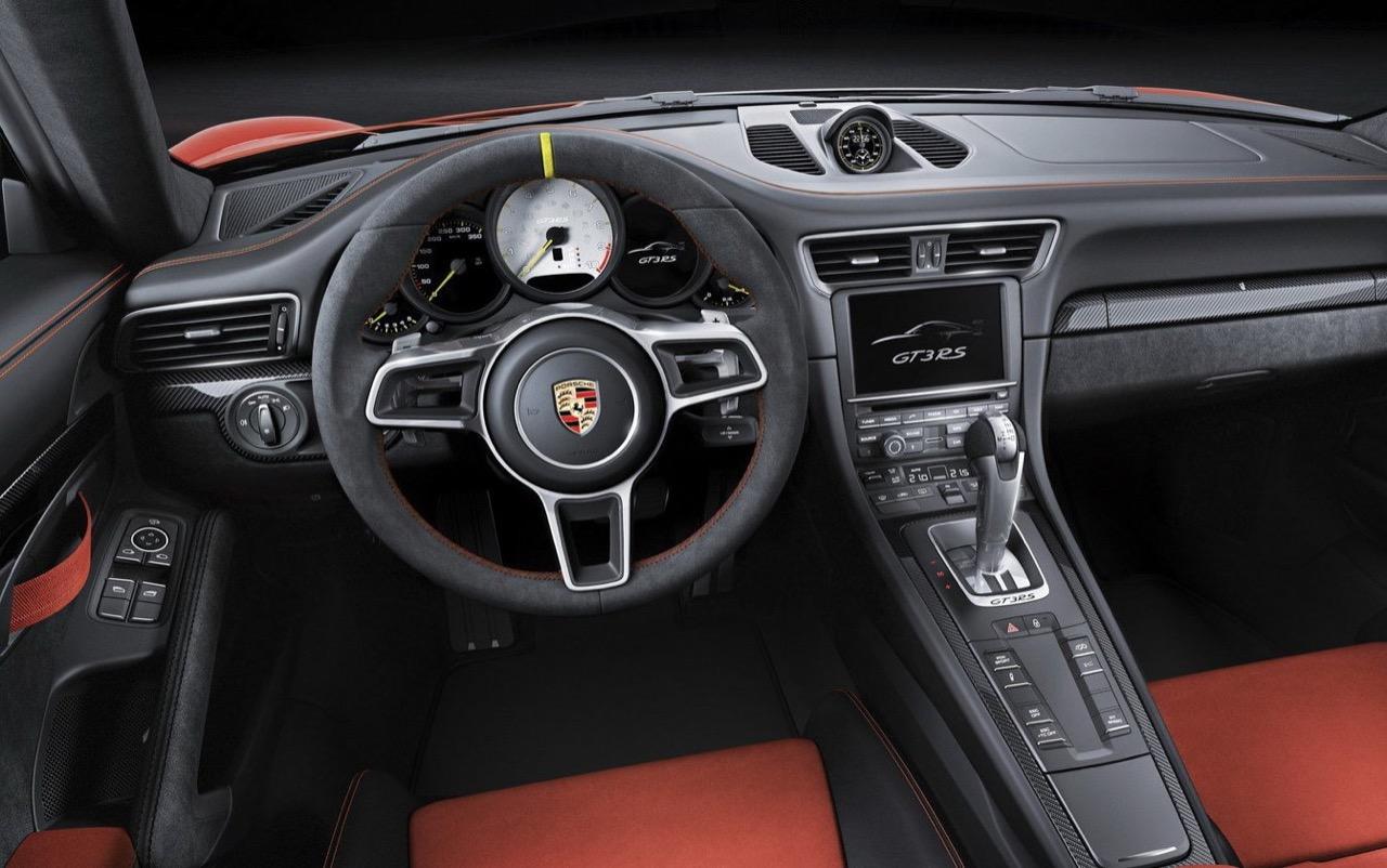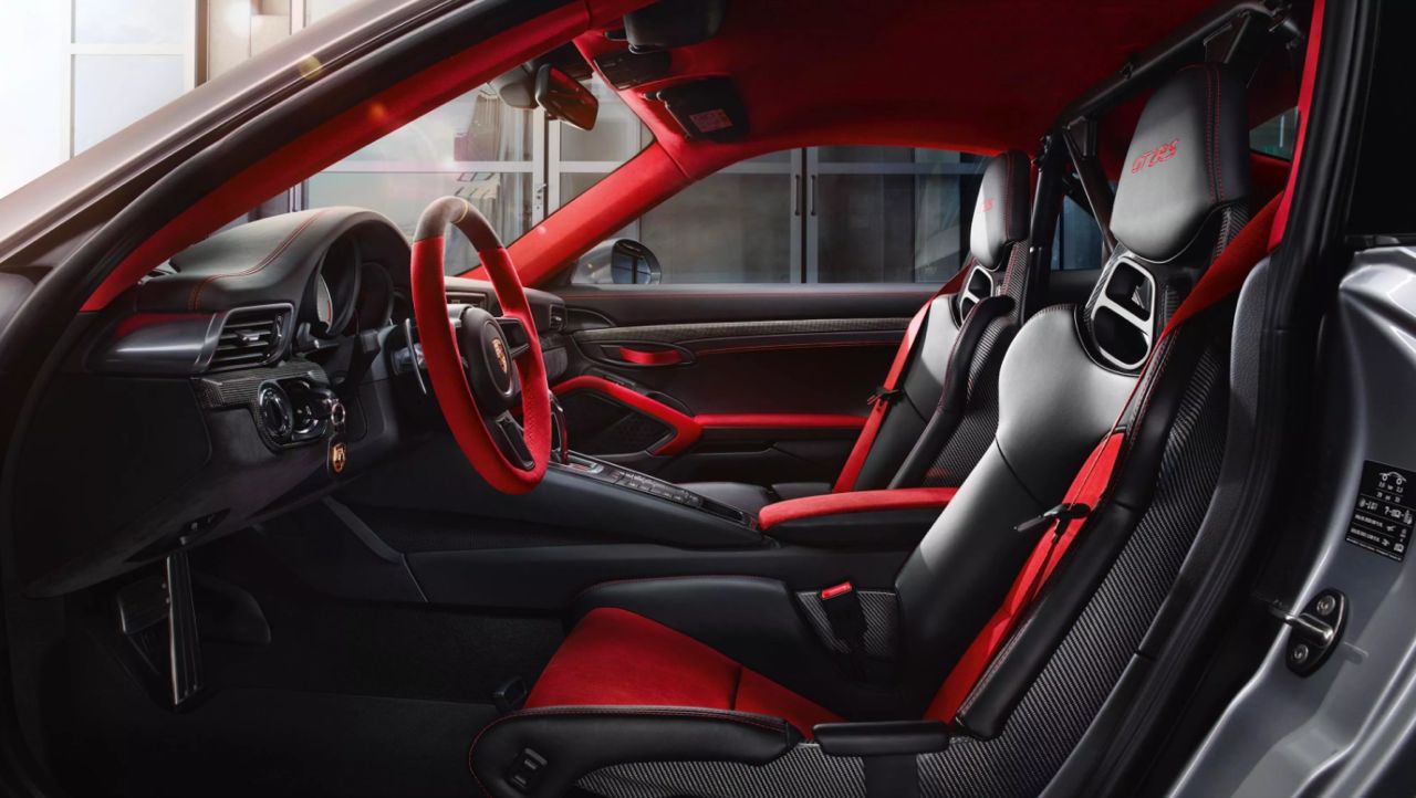 พื้นที่ภายในห้องโดยสารของ Porsche 911 GT2 RS ตกแต่งอย่างสวยงามโดดเด่นด้วยวัสดุหนังกลับราคาแพง Alcantara สีแดง หนังแท้สีดำคุณภาพชั้นเลิศ และชิ้นส่วนอุปกรณ์ที่ผลิตจากคาร์บอนติดตั้งเป็นมาตรฐาน พวงมาลัยสปอร์ตของ GT2 RS มาพร้อมแป้นเปลี่ยนเกียร์ shift paddles เพื่อความรวดเร็วฉับไวสูงสุด ผู้ขับขี่และผู้โดยสารสามารถสัมผัสกับประสบการณ์สปอร์ตจากตัวรถอย่างเต็มอารมณ์ความรู้สึก ผ่านเบาะนั่ง full bucket seats หุ้มด้วยคาร์บอน เช่นเดียวกับปอร์เช่ 911 ทุกคัน ระบบติดต่อสื่อสารและความบันเทิง Porsche Communication Management (PCM) ได้รับการติดตั้งรวบรวมไว้บริเวณคอนโซลกลาง ประกอบด้วย วิทยุ ระบบนำทางผ่านดาวเทียม และระบบติดต่อสื่อสาร รวมไปถึง Connect Plus module* และ Porsche Track Precision app* ซึ่งถูกติดตั้งเป็นมาตรฐาน พร้อมเชื่อมต่อรายละเอียดข้อมูล และแสดงผลการทำงานของระบบต่างๆ ของตัวรถไปยังโทรศัพท์มือถือ