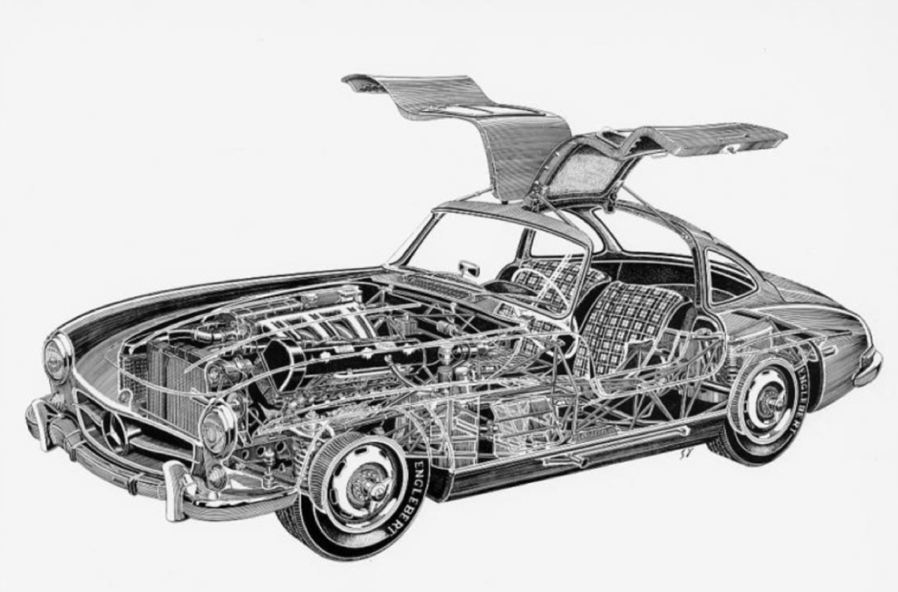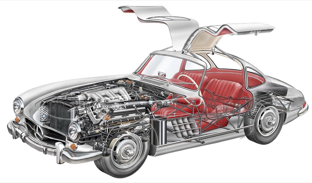 Mercedes Benz 300SL Gullwing วางจำหน่ายในปี ค.ศ. 1954-1957 ใช้เทคโนโลยีขั้นสูงสุดของรถแข่งในบริษัท Mercedes Benz ที่ประสบความสำเร็จคว้าชัยชนะได้เกือบทุกสนามแข่งขันรถยนต์ทางเรียบในทวีปยุโรปมาใส่ลงไปในตัวรถแทบทั้งหมด โดยมีประตูที่เปิดออกแบบปีกนกที่มีลักษณะแปลกแหวกแนวมากในยุค 1950 และนำชื่อประตูมาเป็นชื่อรุ่น ซึ่งนั่นก็คือที่มาของสุดยอดรถยนต์คลาสสิกตลอดกาล 300SL Gullwing การเรียกประตูของ 300SL ว่า Gullwing ก็เนื่องมาจากลักษณะของการเปิดประตูที่เหมือนกับนกที่กำลังกางปีก โดยประตูจะถูกยกขึ้นไปที่ด้านบนเหนือศีรษะ ซึ่งผู้ออกแบบประตูบานนี้นั้นมีชื่อว่า รูดอล์ฟ อูเลนเฮาท์ (RUDOLF UHLENHUAT) หัวหน้าวิศวกรฝ่ายพัฒนา เดมเลอร์-เบนซ์ เอจี (DBAG)