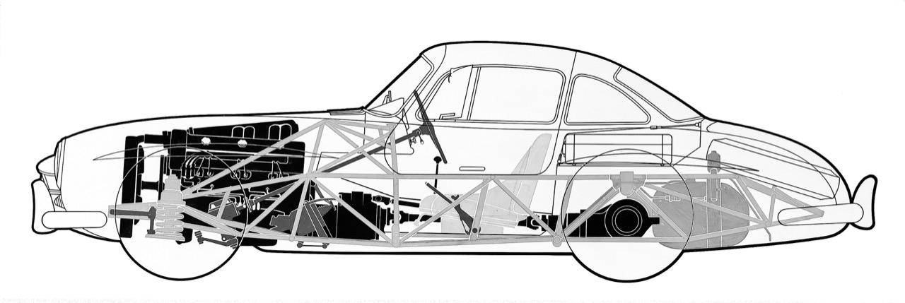 การวางเครื่องยนต์ตามยาวไว้ด้านหน้าโดยร่นตัวเครื่อง 3.0 ลิตรให้ใกล้กับกระจกหน้า ทำให้ตัวเลขอัตราส่วนการกระจายน้ำหนักหน้า-หลังเท่ากับ 49/50 ส่งผลไปถึงประสิทธิภาพของการทรงตัวทั้งทางตรงและทางโค้งมีความสมดุลสูงสุด ระบบส่งกำลังเป็นเกียร์ธรรมดา 4 สปีด คลัทซ์เดี่ยวแบบแห้ง ระบบกันสะเทือนหน้า คอยล์สปริงพร้อมทอร์ชั่นบาร์ ด้านหลังเป็นคอยล์สปริง โช้คอัพของ 300SL Gullwing ทั้งหน้าและหลังเป็นแบบไฮดรอลิก ระบบเบรกด้านหน้าเป็นไฮดรอลิกพร้อมตัวจับแบบสุญญากาศ ด้านหลังเป็นดรัมเบรกที่พอจะปราบม้าทั้ง 240 ตัวให้อยู่หมัดได้ยามต้องเบรกแรงๆ เพื่อลดความเร็ว