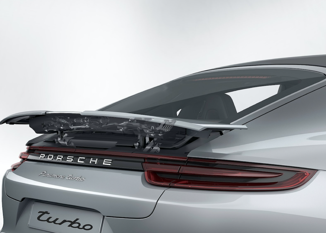 สปอยเลอร์หลังแบบปรับระดับอัตโนมัติ ติดตั้งเป็นครั้งแรกในรถยนต์คลาสเดียวกัน บริเวณฝาท้ายของ Panamera Turbo Sport Turismo ติดตั้งระบบสปอยเลอร์ทำงานด้วยไฟฟ้าพร้อมเซนเซอร์ที่ใช้ในการปรับการทำงานแบบอัตโนมัติ โดยการทำงานของสปอยเลอร์หลังดังกล่าวจะได้รับการปรับระดับได้ถึง 3 ตำแหน่ง ขึ้นอยู่กับสภาวะการขับขี่และฟังก์ชั่นการปรับตั้งตัวรถที่ถูกเลือกใช้งานในขณะนั้นเพิ่มขีดความสามารถในการสร้างแรงกดด้านท้ายรถได้สูงสุดถึง 50 กิโลกรัม ที่ความเร็วไม่เกิน 170 กิโลเมตรต่อชั่วโมง ควบคุมการทำงานด้วยระบบ Porsche Active Aerodynamics (PAA) – สามารถปรับตำแหน่งของสปอยเลอร์ที่ -7 องศา เพื่อวัตถุประสงค์ในการลดแรงต้านซึ่งเป็นการเพิ่มความประหยัดน้ำมันเชื้อเพลิงให้ดีขึ้น