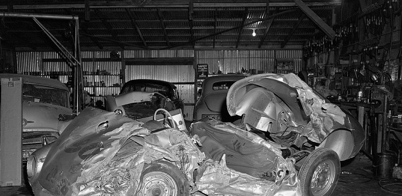 เสียงคำรามของเครื่องยนต์สูบนอน PORSCHE และแสงสะท้อนของแดดยามบ่ายที่กระทบกับตัวถังอะลูมิเนียมสีเงิน เงาแวววาว รถ FORD สีดำยังคงเลี้ยวรถออกมาตัดกับทางวิ่งของเจ้า 550 SPYDER แล้วเสียงที่เกิดจากการปะทะกันของรถทั้งสองคันก็ดังสนั่นหวั่นไหวจนได้ยินไปทั่วในบริเวณเนินทางแยก 41