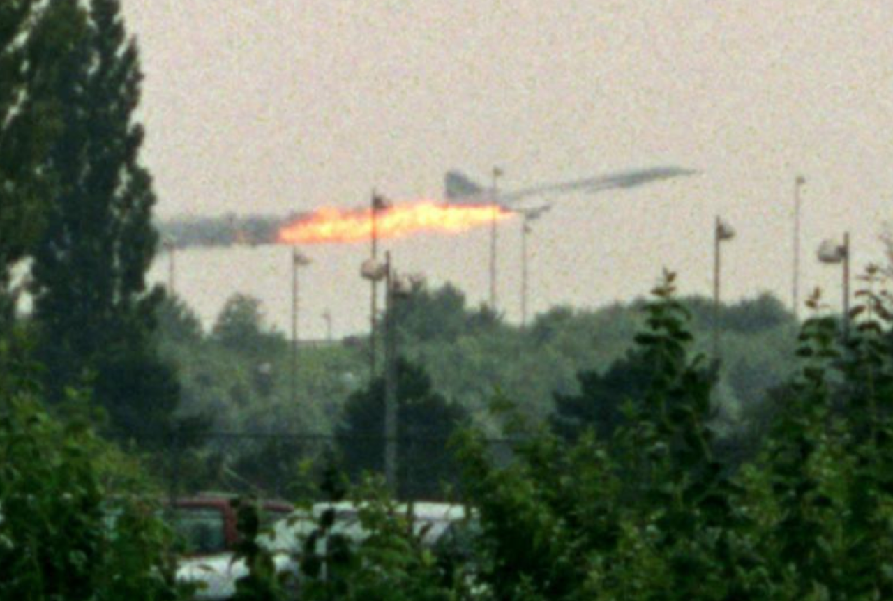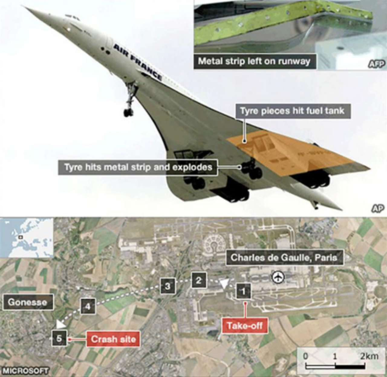 ในช่วงที่กำลังวิ่งขึ้นนั้น เครื่อง Concorde ต้องใช้ความเร็วในการบินขึ้นกว่า 320 กิโลเมตรต่อชั่วโมง ฐานล้อด้านซ้ายของเครื่องได้วิ่งไปทับเศษอลูมิเนียม ความยาวประมาณฟุตเศษที่ หลุดออกจากเครื่อง DC-10 ที่ได้ทำการบินขึ้นไปก่อนหน้านี้ เศษอลูมิเนียมดังกล่าวทำให้ยางของฐานล้อใต้ปีกซ้ายของเครื่อง Concorde ระเบิดออกเป็นชิ้นเล็กชิ้นน้อยจากความเร็ว และเศษชิ้นส่วนของยางที่ระเบิดปลิวไปกระแทกเข้ากับปีกซ้ายซึ่งตรงกับตำแหน่งของถังเชื้อเพลิงหมายเลข 5 ความรุนแรงของการกระแทกส่งผลให้ถังเชื้อเพลิงแตกและมีเชื้อเพลิงจำนวนมากรั่วออกมาฟุ้งกระจายและติดไฟ เครื่องยนต์หมายเลข 1 และ 2 ได้รับความร้อนจากเพลิงไหม้จนทำงานผิดปกติทั้งสองเครื่อง เครื่องบิน Concorde บินขึ้นทั้งๆ ที่มีเพลิงลุกไหม้ที่ส่วนท้ายของปีกซ้าย ทำให้โครงสร้างในบริเวณนั้นได้รับความเสียหาย นักบินไม่สามารถทำการเก็บฐานล้อได้ เนื่องจากประตูของฐานล้อซ้ายไม่ทำงาน กัปตันคริสติยอง มาร์ตี (christian marty) พยายามบังคับเครื่องเพื่อไปลงที่ท่าอากาศยานเลอบูเก้ซึ่งอยู่ใกล้กับท่า อากาศยานชาร์ลเดอโกมากที่สุด