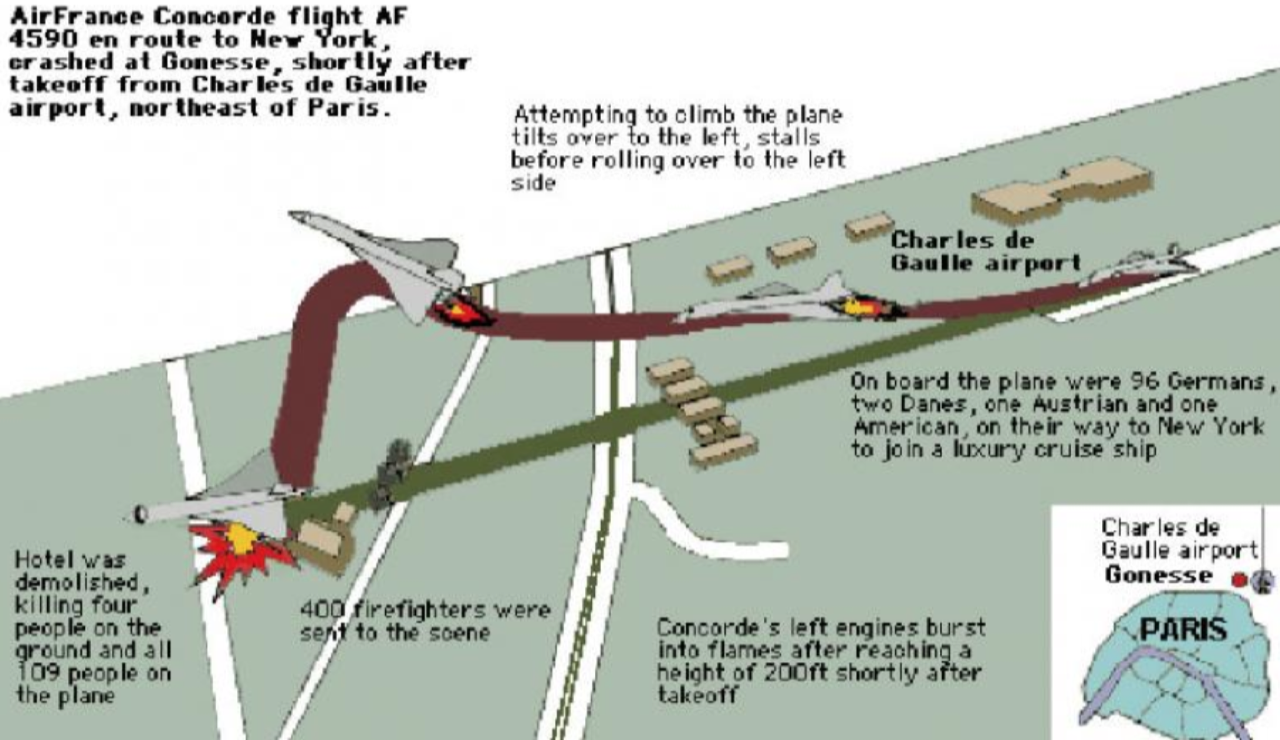 อุบัติเหตุร้ายแรงของ Concorde เครื่องบินโดยสารความเร็วเหนือเสียงแบบแรกและแบบเดียวในเที่ยวบินสุดท้าย เกิดขึ้นเมื่อวันที่ 25 กรกฎาคม 2543 บนรันเวย์ทางวิ่งหมายเลข 26R (Runway 26R) ช่วงบ่ายของสนามบินชาร์ลเดอโกลในกรุงปารีส เครื่องบิน Concorde ของสายการบิน Airfrance เที่ยวบินที่ AFR 4590 ซึ่งเป็นเที่ยวบินแบบเช่าเหมาลำ โดยนักท่องเที่ยวชาวเยอรมันกว่า 100 คน ออกเดินทางจากสนามบินชาร์ลเดอโกลในกรุงปารีส เพื่อมุ่งสู่สนามบิน JFK รัฐนิวยอร์ก สหรัฐอเมริกา พร้อมด้วยกัปตัน หรือนักบินที่ 1 ชาวฝรั่งเศส ชื่อ Christian Marty รวมถึงนักบินที่ 2 กับช่างเครื่องหรือ FE-Flight Engineer และพนักงานต้อนรับบนเครื่องอีก 6 คน