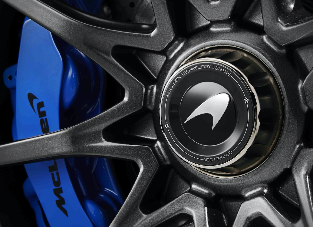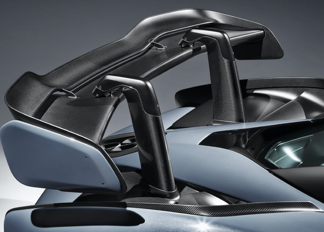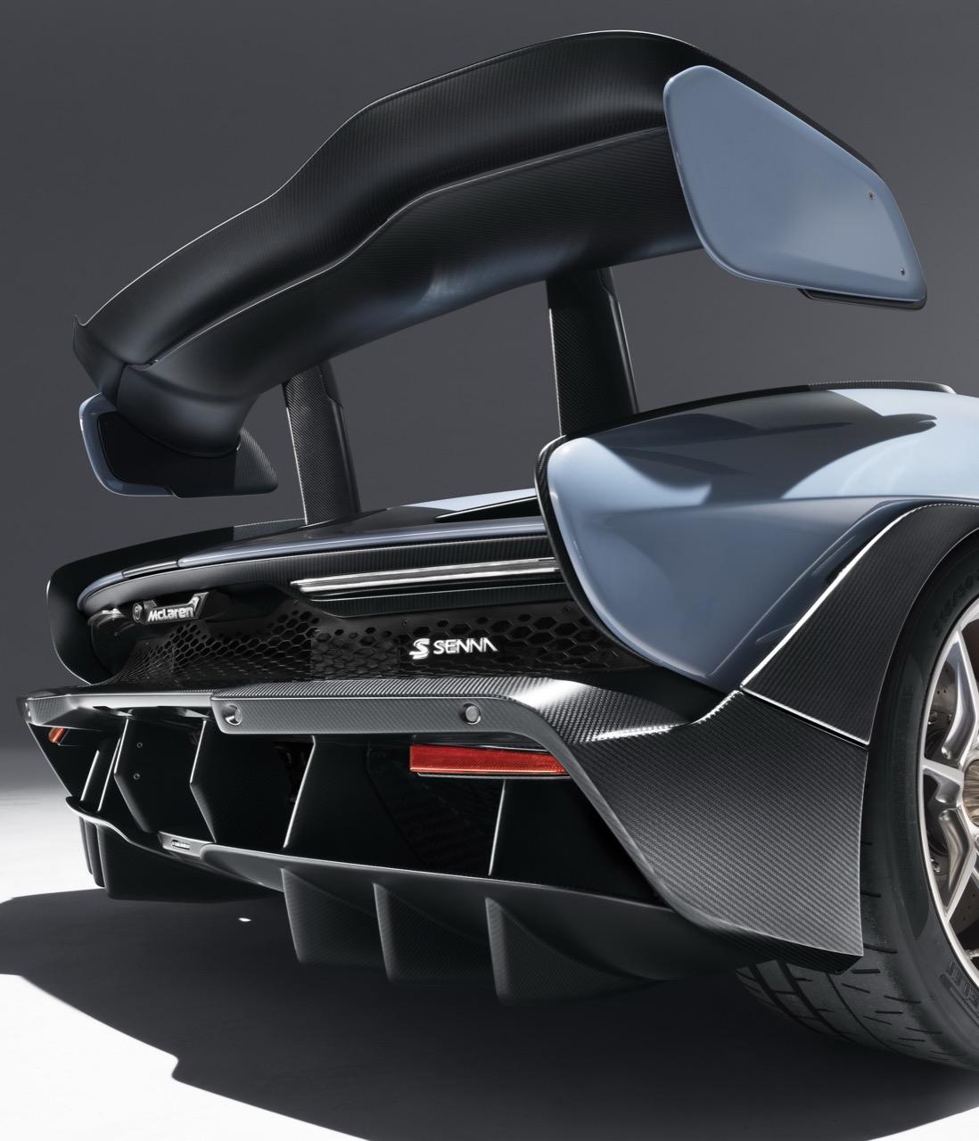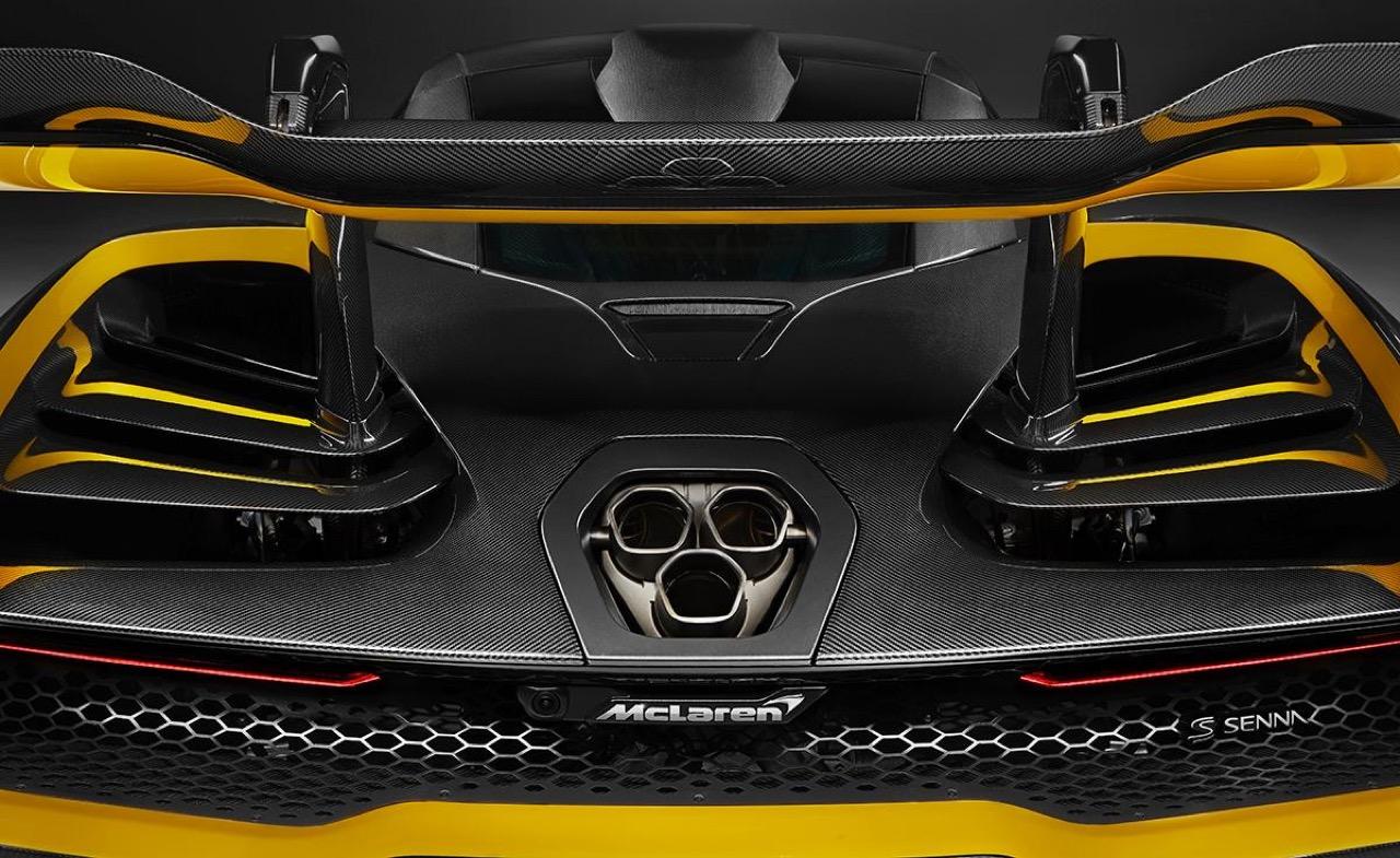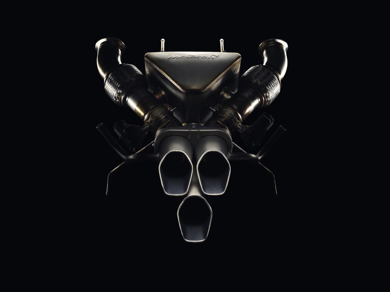 ท่อไอเสียถูกวางตำแหน่งให้อยู่ส่วนท้ายรถ (เมื่อวัดจากขอบท้าย) ที่ต่ำที่สุดเมื่อเปรียบเทียบกับแมคลาเรนรุ่นวิ่งบนท้องถนนทุกรุ่น โดยต่ำกว่าตระกูล Super Series ถึง 18 เซนติเมตร ซึ่งตรงกันข้ามกับส่วนปีกหลังคาร์บอนไฟเบอร์สองชั้นที่ทำงานด้วยระบบไฮดรอลิก ซึ่งถือเป็นส่วนประกอบหลักในการสร้างแรงกดให้ตัวรถ กลับถูกติดตั้งให้อยู่ในตำแหน่งสูงและสามารถปรับองศาได้อย่างต่อเนื่อง เพื่อสร้างแรงกดสูงสุดและรักษาสมดุลอากาศพลศาสตร์ของตัวรถให้เหมาะสม โดยชิ้นส่วนปีกมีน้ำหนักเพียง 4.87 กิโลกรัม แต่สามารถเสริมน้ำหนักแรงกดได้มากกว่า 100 เท่าเลยทีเดียว