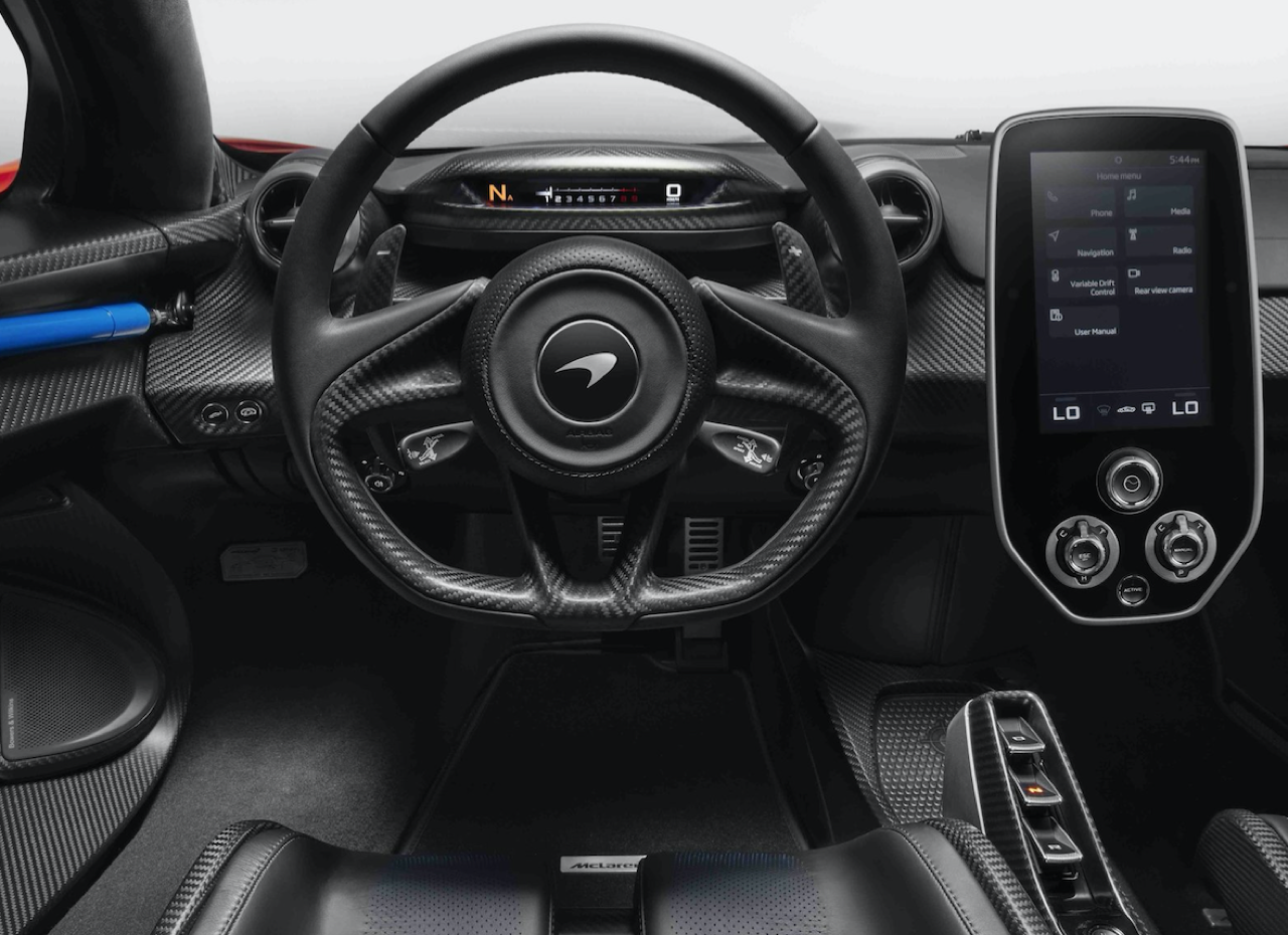 ผู้ขับสามารถดูข้อมูลจากจอแสดงผลแบบพับได้สไตล์ McLaren Folding Driver Display จอระบบอินโฟเทนเมนท์กลาง เมื่อใช้งานแบบ Full Display Mode จอแสดงผลแบบพับได้จะแสดงข้อมูลบนจอแบบ TFT ด้วยเลย์เอาท์ที่แตกต่างกัน 3 รูปแบบขึ้นอยู่กับผู้กำลังใช้โหมดการขับขี่แบบ Comfort, Sport, Track หรือ Race เมื่อตั้งค่ากับแผงควบคุม Active Dynamics Panel หรือควบคุมเองเองแบบอิสระ จอแสดงผลจะสามารถพับลงเป็นแบบ Slim Display Mode เพื่อแสดงผลเฉพาะข้อมูลที่สำคัญ เช่น ความเร็ว รอบเครื่องยนต์ และเกียร์ที่เลือกใช้ การวางตำแหน่งจอรูปแบบนี้ได้รับการออกแบบให้เหมาะสำหรับการแข่งขันในสนามแข่งเพื่อให้มองเห็นแทร็คข้างหน้าได้อย่างเต็มที่ เหมาะกับผู้ขับที่ชอบการแสดงผลแบบเรียบง่าย
