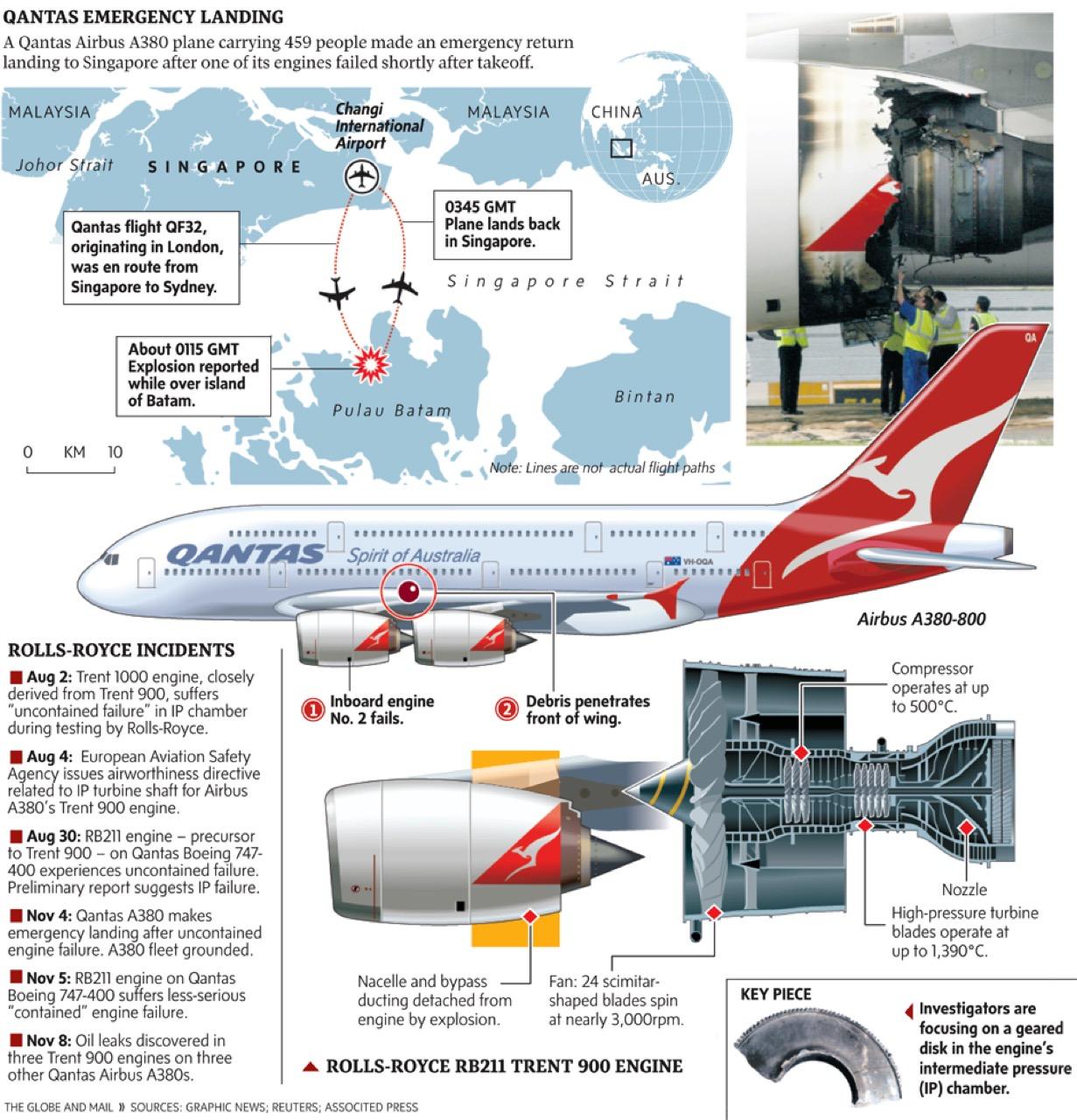 เครื่องบินโดยสาร Airbus A380 ของสารการบินแห่งชาติแดนจิงโจ้ซึ่งมีผู้โดยสารพร้อมลูกเรือ 459 คน ต้องลงจอดฉุกเฉินในสนามบินชางงีของสิงคโปร์ จากสาเหตุเครื่องยนต์เกิดไฟลุกไหม้และระเบิด นับเป็นอุบัติเหตุร้ายแรงกลางอากาศครั้งแรกที่เกิดขึ้นกับเครื่องบินโดยสารรุ่น A380 ของ Airbus ทำให้สายการบินแควนตัสระงับการบินของเครื่องบินรุ่นดังกล่าวเพื่อทำการตรวจสอบหาสาเหตุ สายการบินแควนตัส แอร์เวย์ส ของออสเตรเลียนั้นมีประวัติดีงามโดยไม่เคยประสบอุบัติเหตุร้ายแรงถึงขั้นมีผู้โดยสารเสียชีวิตตลอดระยะเวลาของการดำเนินธุรกิจการบิน แควนตัส เที่ยวบิน QF32 บินขึ้นจากสนามบินนานาชาติชางงีในประเทศสิงคโปร์โดยมีจุดหมายปลายทางที่เมืองซิดนีย์ ประเทศออสเตรเลียประสบปัญหาเกี่ยวกับการทำงานของเครื่องยนต์หลังจากบินขึ้นได้แค่ 6 นาที เครื่องยนต์ระเบิดขณะบินอยู่เหนือน่านฟ้าอินโดนีเซีย ทำให้ต้องบินย้อนกลับมาลงจอดที่สนามบินชางงีโดยเป็นการลงจอดแบบฉุกเฉิน เนื่องจากฝาครอบส่วนท้ายของเครื่องยนต์บริเวณปีกซ้ายของเครื่องบินหลุดหายไปจากการระเบิดออกอย่างรุนแรง โดยมีคราบเขม่าสีดำอยู่รอบบริเวณส่วนท้ายของเครื่องยนต์ตัวดังกล่าว เหตุการณ์นี้ ผู้โดยสาร 433 คน พร้อมลูกเรือ 26 คนไม่ได้รับบาดเจ็บแต่อย่างใด