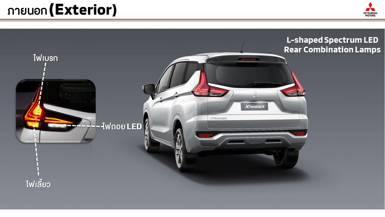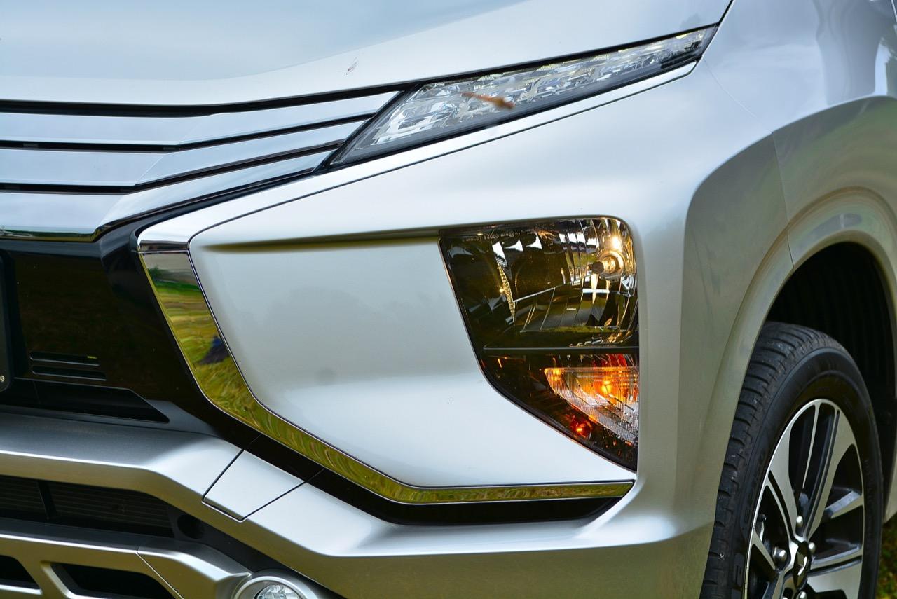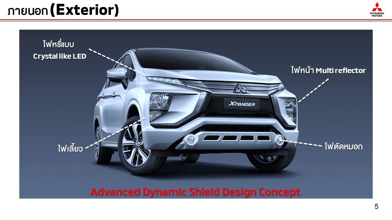 คุณสมบัติการใช้งานและความปลอดภัยที่ได้รับจากดีไซน์แบบ Advanced ‘Dynamic Shield’ ใน Mitsubishi Xpander ปรากฏให้เห็นชัดเจนที่ด้านหน้าและตำแหน่งของไฟหน้าขณะที่ไฟหรี่แบบ Crystal LED ถูกติดตั้งอยู่ด้านบนของฝากระโปรงและเยื้องมาด้านหน้าซุ้มล้อจึงช่วยให้ผู้ใช้ทางเท้าและยานพาหนะอื่นๆ สังเกตเห็นได้ง่ายขึ้น ไฟหน้าติดตั้งในกันชนหน้าเพื่อเลี่ยงไม่ให้แสงจากไฟหน้ารบกวนสายตาผู้ใช้ทางเท้า รวมถึงผู้ขับขี่ยานพาหนะที่สวนมา Xpander รุ่น GT ติดตั้งไฟตัดหมอกหน้า มือเปิดประตูโครเมียม คิ้วขอบกระจกประตู และแผงกันกระแทกด้านหน้าและด้านหลัง รวมถึงคิ้วขอบประตูด้านล่างข้างตัวรถ