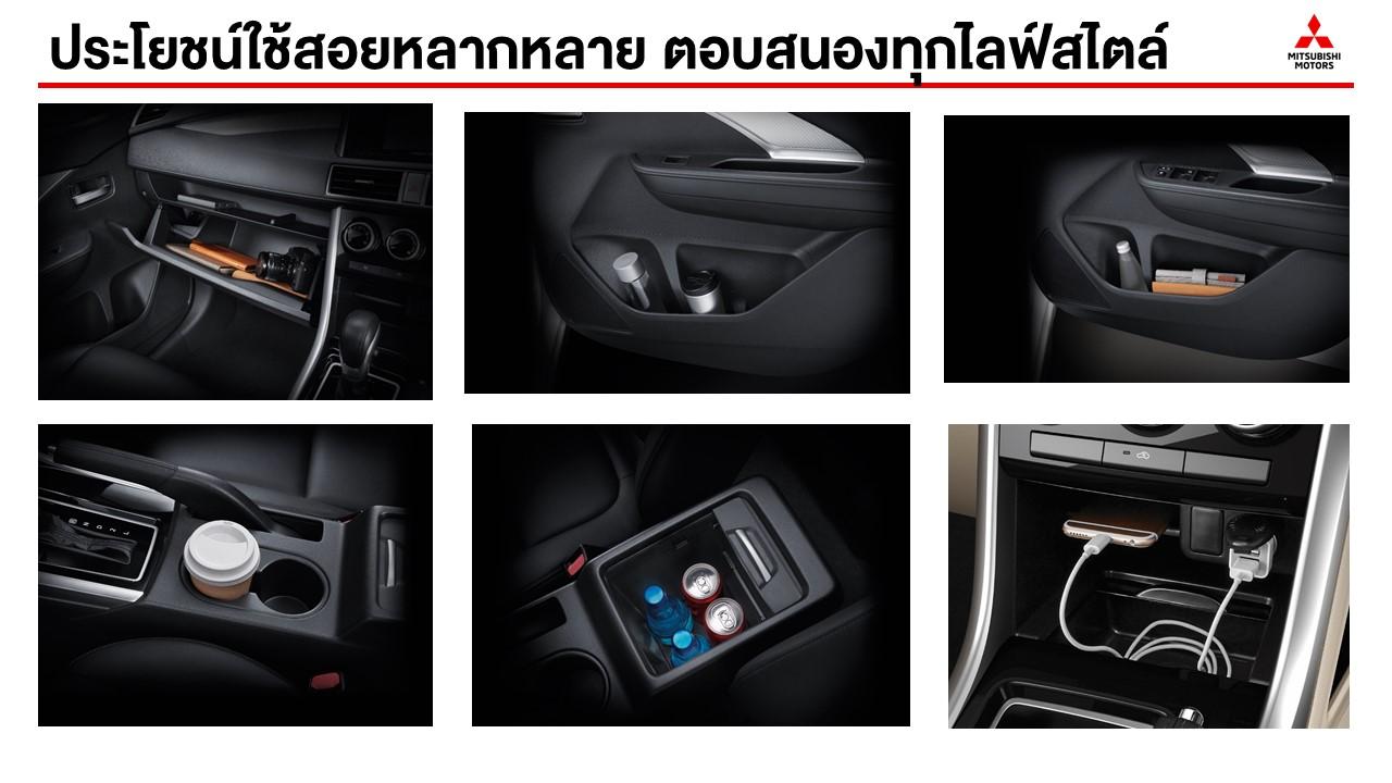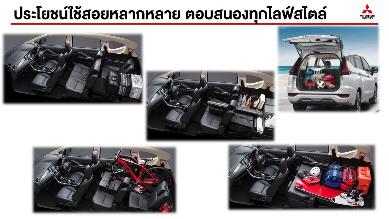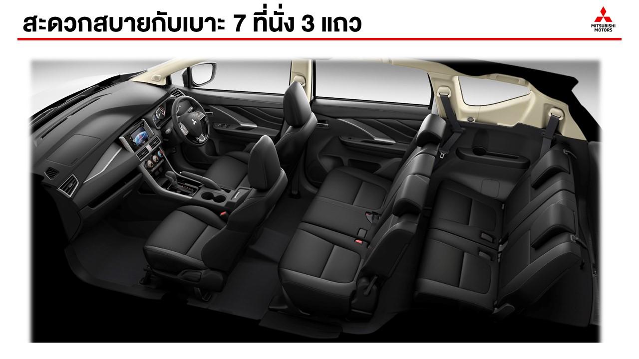 ด้วยขนาดความกว้างมากสุดในรถกลุ่มเดียวกัน เบาะที่นั่ง 3 แถว ออกแบบเพื่อการใช้งานที่อเนกประสงค์ รองรับผู้โดยสาร 7 คน ด้วยพื้นที่ช่วงขาและช่วงไหล่พร้อมให้ความกว้างขวาง ห้องโดยสารมีวัสดุป้องกันเสียงแปลกปลอมจากภายนอก ช่วยลดเสียงรบกวนได้ดี เบาะแถวที่ 2 และ 3 สามารถปรับหรือพับได้เพื่อเพิ่มพื้นที่การบรรทุกสัมภาระ แนวคิด “โอโมเตะนาชิ” (Omotenashi) หรือการดูแลและใส่ใจในทุกรายละเอียดแบบญี่ปุ่น เพื่อมอบความสะดวกสบายให้แก่ผู้โดยสาร ห้องโดยสารของ Mitsubishi Xpander รองรับการใช้งานด้วยช่องจัดเก็บของและช่องชาร์จกระแสไฟฟ้าสำหรับอุปกรณ์อิเล็กทรอนิกส์ต่างๆ
