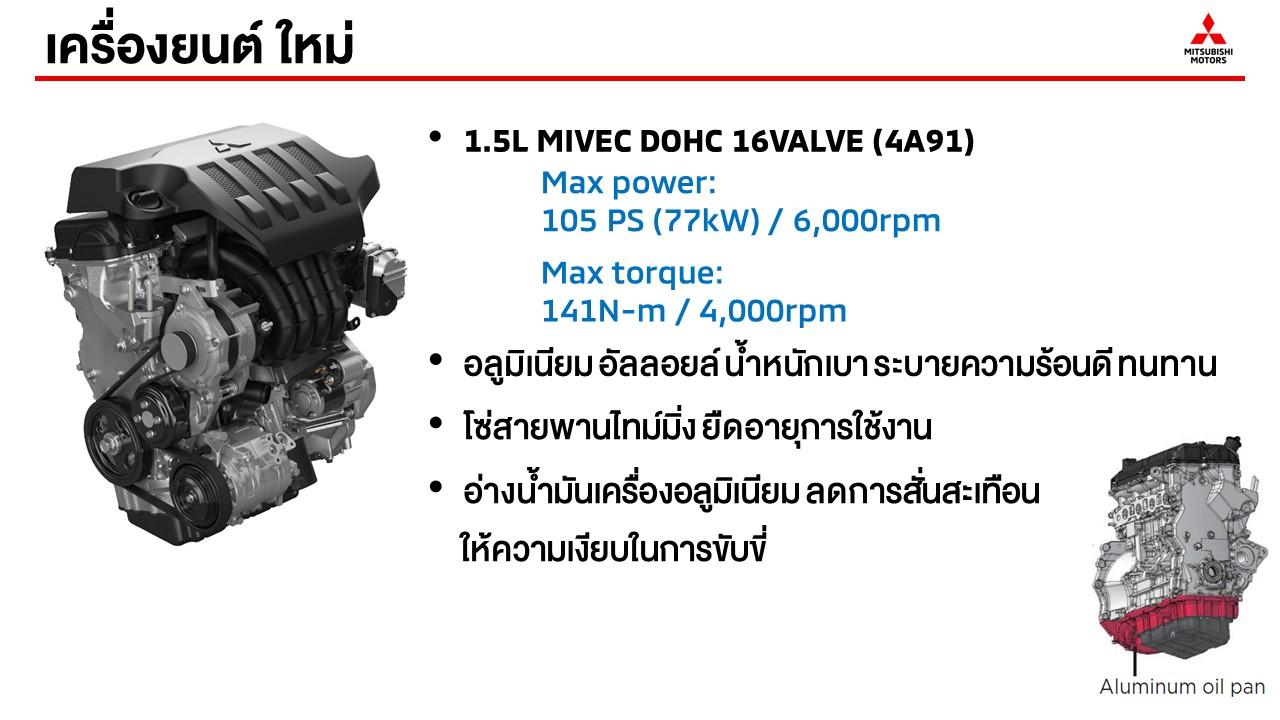 เครื่องยนต์อลูมินัมอัลลอยเบนซินขนาด 1.5 ลิตร DOHC MIVEC 16 วาล์ว 105 แรงม้าที่ 6,000 รอบต่อนาที แรงบิดสูงสุด 141 นิวตันเมตรที่ 4,000 รอบต่อนาที ล้ออัลลอยแบบสีทูโทนขนาด 16 นิ้ว (เฉพาะรุ่น GT) ยาง 205/55R16 ระบบส่งกำลังใช้เกียร์อัตโนมัติ 4 สปีด ระบบรองรับ ช่วงล่างหน้าแมคเฟอร์สันสตรัท คอยล์สปริงและเหล็กกันโคลง ด้านหลังเป็นแบบคานแข็งทอร์ชันบีม