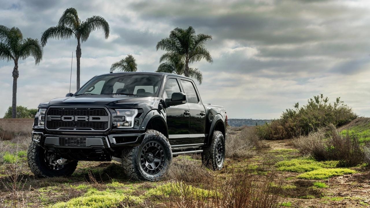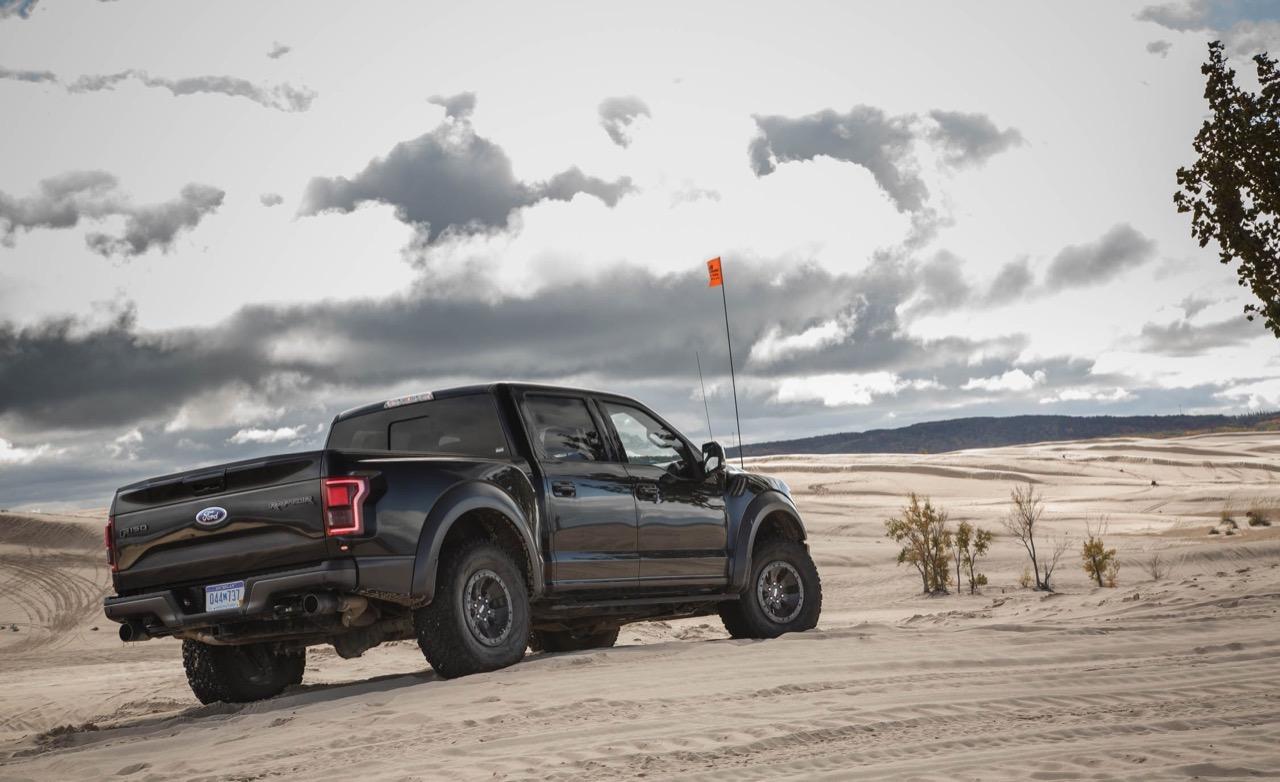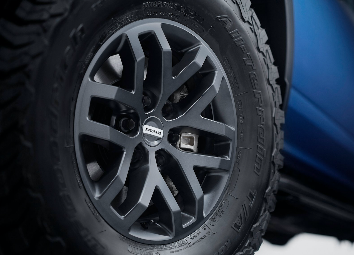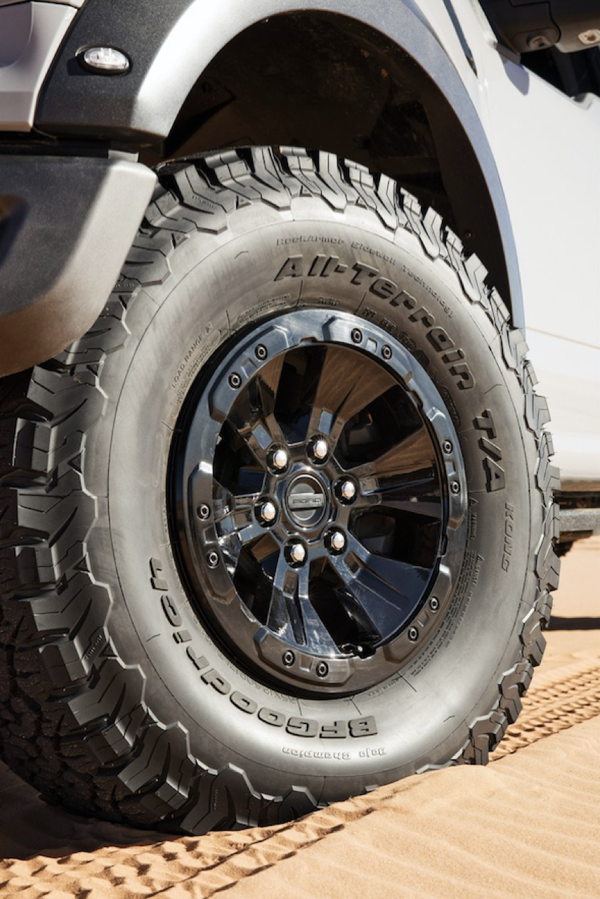 โป่งล้อปรับใหม่ให้มีสีเดียวกับกระจังหน้าและสปอยเลอร์หน้า บังโคลนหลังก็ยังขยายออกเพื่อรองรับยางออฟโรดสายลุย ล้ออัลลอยลายใหม่เฉพาะรุ่น Raptor ขนาด 17 นิ้ว เล็กไปนิดแต่ใช้งานได้ดีเนื่องจากไม่ได้ใหญ่โตจนไปกินกำลังเครื่องยนต์แล้วทำให้วิ่งไม่ออก ล้ออัลลอยลายใหม่ของ F150 Raptor ขอบ 17 นิ้วแบบ high-gloss machined face and Magnetic-painted pockets ยางออฟโรดแบบจัดเต็มสำหรับการลุย ไซส์ 315/70 R17 เป็นยางแบรนด์ BFGoodrich® รุ่น All-Terrain T/A® ยางเพื่อการลุยเน้นดอกใหญ่สำหรับบุกป่าฝ่าโคลน ส่วนมือจับที่เปิดกระบะหลังกับสปอยเลอร์หลังสีเทาดำเช่นเดียวกับสปอยเลอร์หน้า