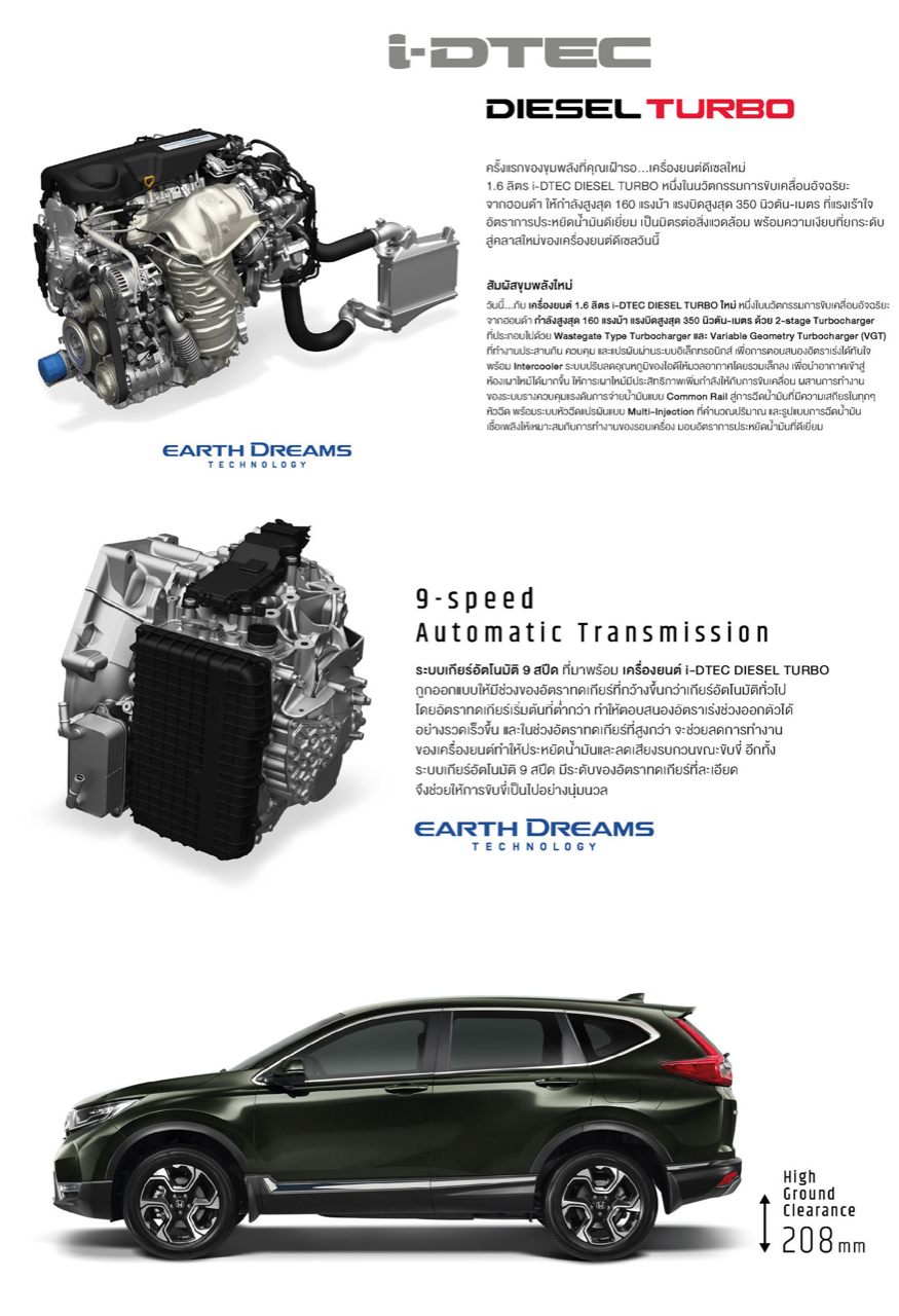 นับเป็นครั้งแรกในไทยที่ Honda จับ New CR-V มาวางเครื่องดีเซลในรุ่น DT EL 4WD เป็นขุมกำลังดีเซลเทอร์โบแบบแถวเรียง 4 สูบ 16 วาล์ว (4 วาล์วต่อสูบ) ดับเบิ้ลโอเวอร์เฮตแคมชาร์ป เป็นเครื่องยนต์ Earth Dreams Technology รุ่นใหม่ที่เน้นความสะอาดและความประหยัดโดยมีอัตราส่วนกำลังอัดสูงถึง 16.0:1 เครื่องยนต์ 1.6 ลิตร มีปริมาตรความจุ 1,597 ซีซี ใช้ระบบจ่ายเชื้อเพลิงแบบยิงตรงหรือคอมมอนเรล ไดเรคอินเจคชั่น ระบบอัดอากาศเทอร์โบแบบ 2 Stage Turbo ใช้เทอร์โบร้อยเรียงกันเป็นลูกปัดประกบด้านบนและล่างคอยบูสอากาศให้กับระบบไอดี เครื่องดีเซลตัวเล็กของ Honda มีความกว้างกระบอกสูบ 76.0 มิลลิเมตร ช่วงชักยาว 88.0 มิลลิเมตร ให้กำลังสูงสุด 118 กิโลวัตต์ หรือ 160 แรงม้าที่ 4,000 รอบต่อนาที แรงบิดสูงสุดจัดมาให้ถึง 350 นิวตันเมตร หรือ 35.7 กิโลกรัมเมตร ที่ 2,000 รอบต่อนาที ไม่ได้แรงแต่ก็พอตัวจากสมรรถนะในด้านแรงบิดที่ต่อเนื่องครอบคลุมแม้จะรอบไม่จัดเท่าเครื่องเบนซินเทอร์โบ