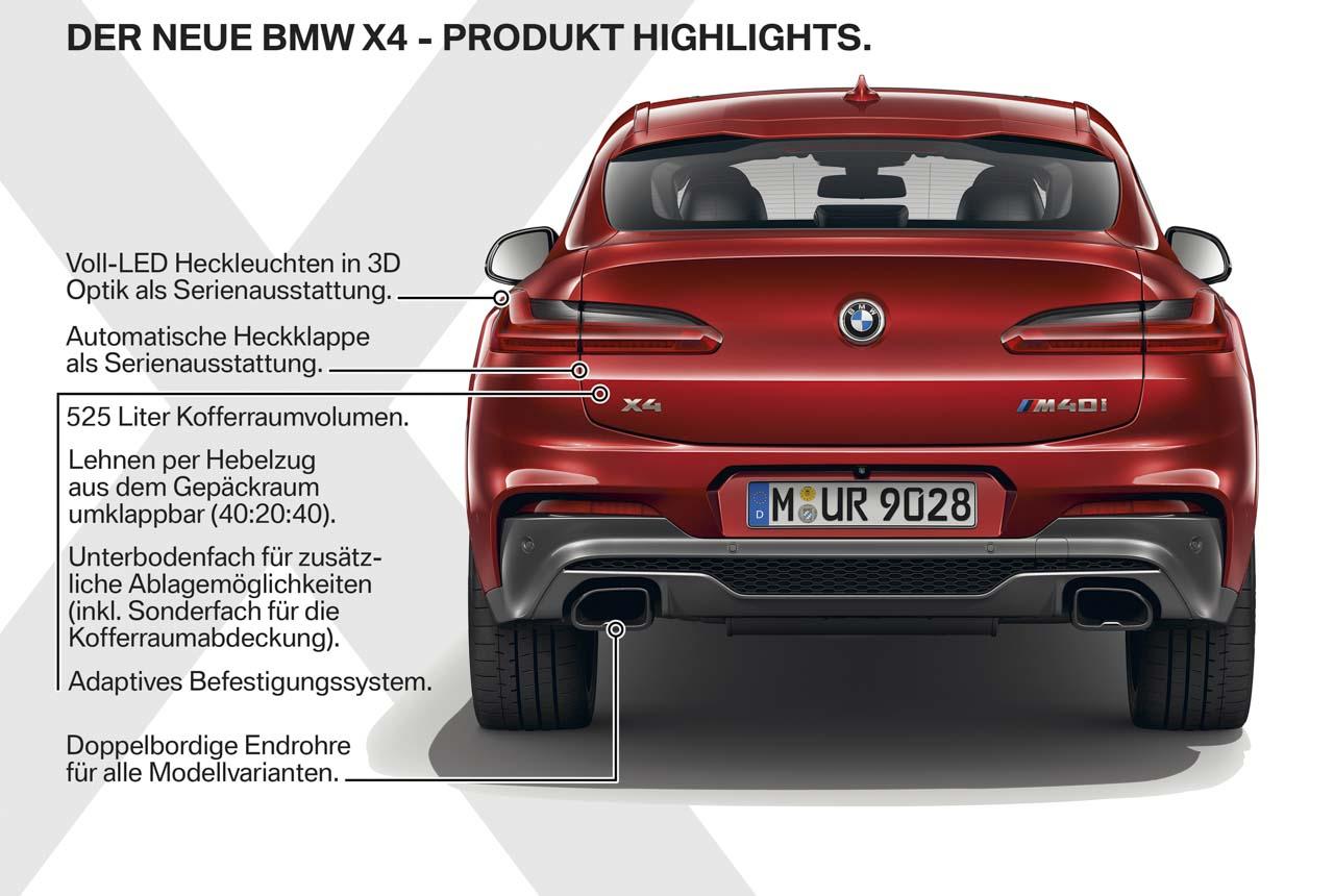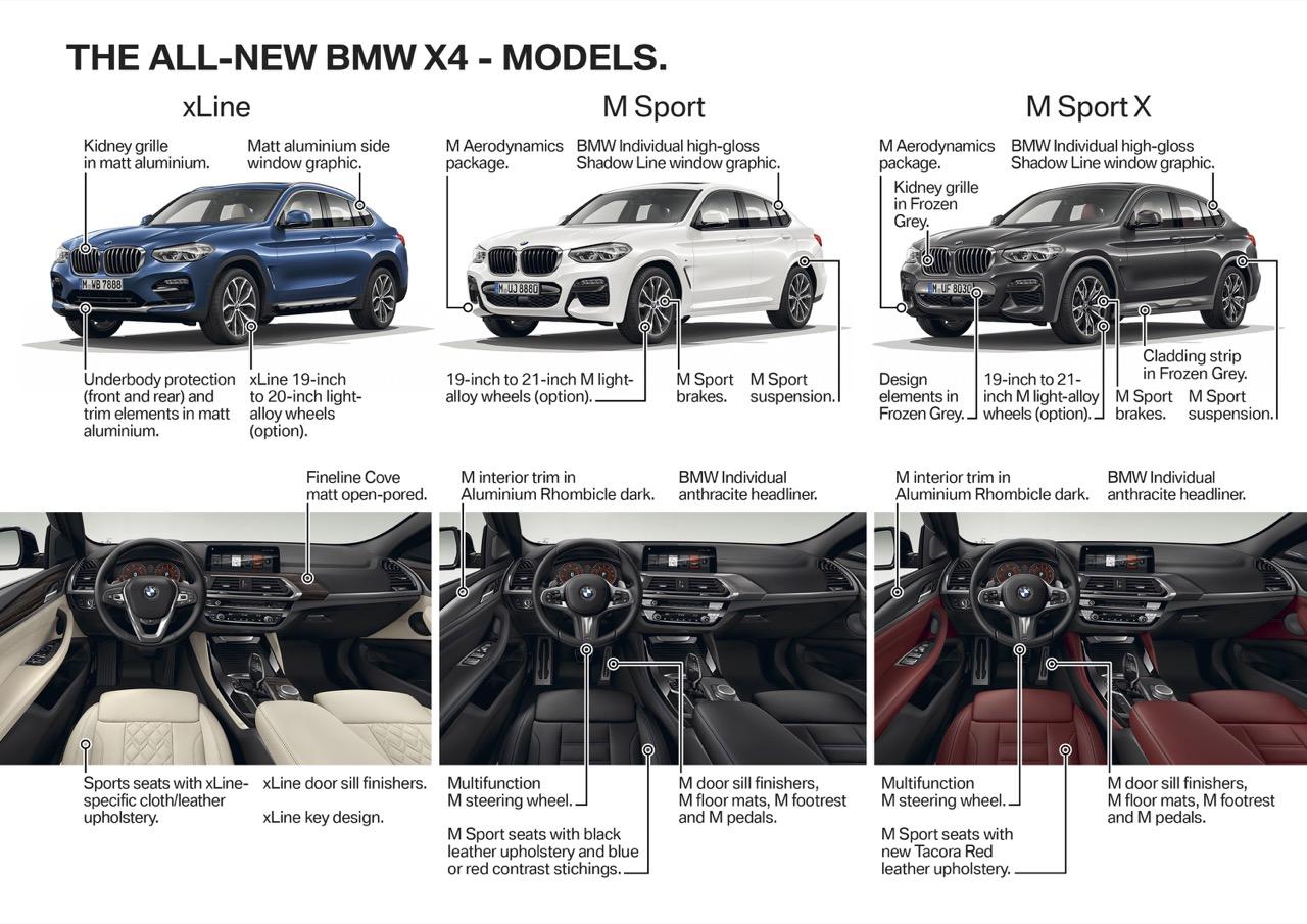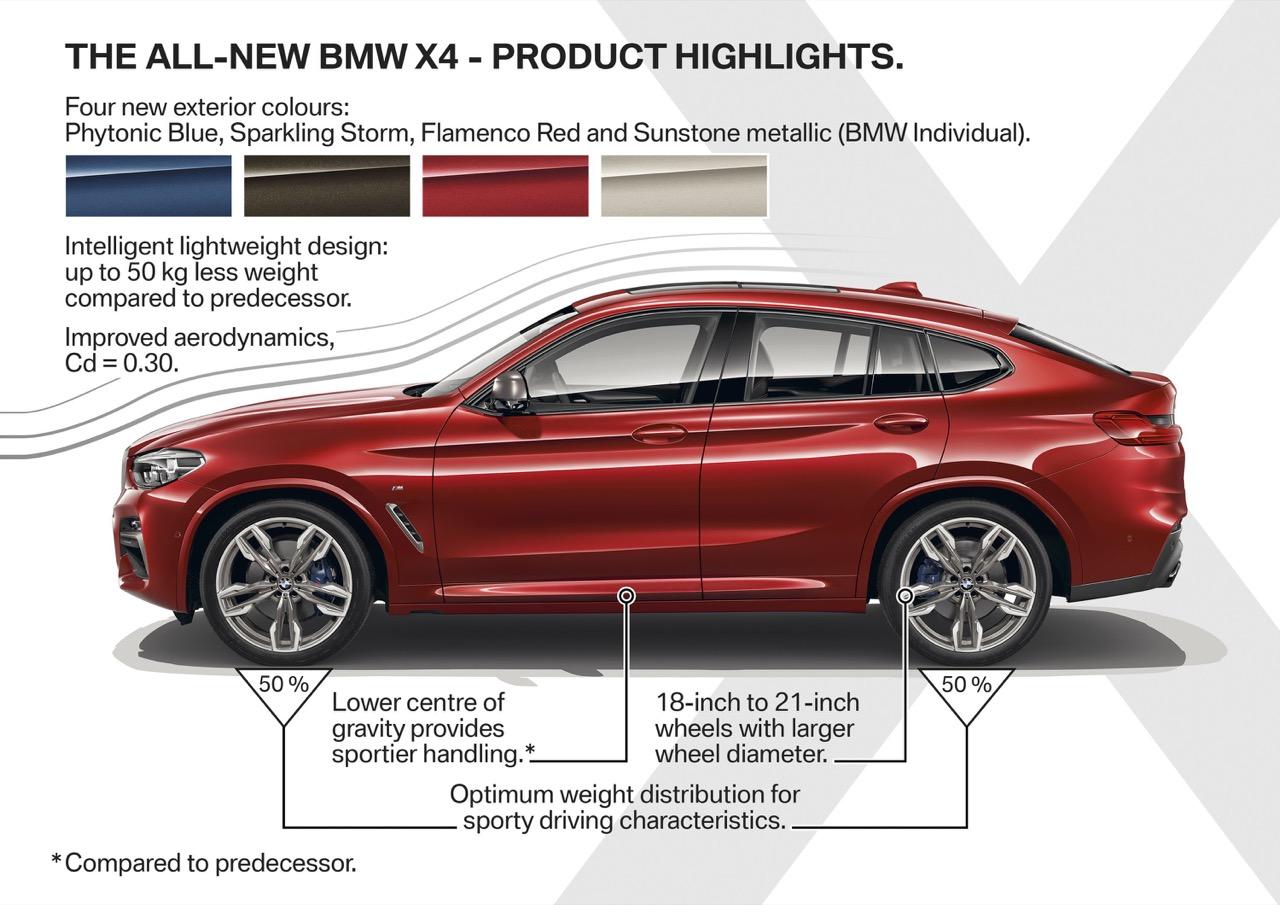 รูปโฉมภายนอกของ BMW X4 2019 ใช้เส้นสายรอบคันของตัวถังเหนี่ยวนำความทันสมัยด้วยดีไซน์สปอร์ตที่ชัดเจนมากยิ่งขึ้น มิติตัวถังมีขนาดความยาว 4,752 มิลลิเมตร กว้าง 1,918 มิลลิเมตรและสูง 1,621 มิลลิเมตร ระยะฐานล้อ 2,864 มิลลิเมตร พื้นที่เก็บสัมภาระส่วนท้ายความจุ 525 ลิตร (ยังไม่ได้พับเบาะหลัง และเพิ่มเป็น 1,430 ลิตร เมื่อพับเบาะหลัง ความยาวตัวถังใน New X4 เพิ่มขึ้น 81 มิลลิเมตร กว้างขึ้นอีก 37 มิลลิเมตร ขยับฐานล้อให้กว้างขึ้น 54 มิลลิเมตร ชุดแต่ง M Sport พร้อมด้วยล้ออัลลอย M ขนาด 19 นิ้ว ลาย Double-spoke เพิ่มประสิทธิภาพในระบบขับเคลื่อนให้แก่น้องใหม่ล่าสุดของยานยนต์ตระกูล X ด้วยเทคโนโลยีระบบขับเคลื่อนใหม่ xDRIVE เวอร์ชั่นล่าสุด พร้อมระบบควบคุมการขับขี่ขณะเข้าโค้ง (Performance Control) พวงมาลัยไฟฟ้าแบบสปอร์ต ระบบ Driving Assistant ช่วงล่างจอมหนึบแบบ M Sport
