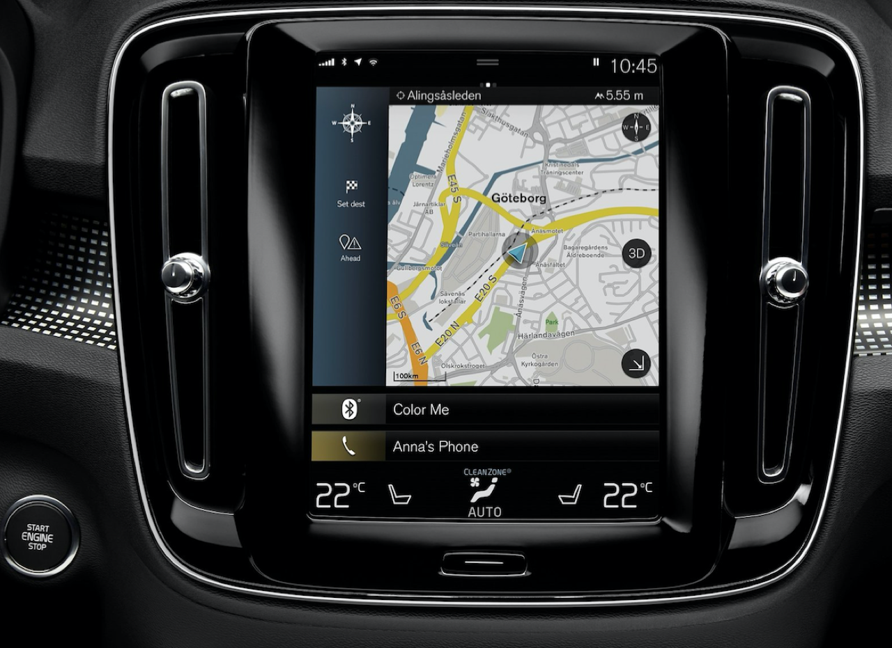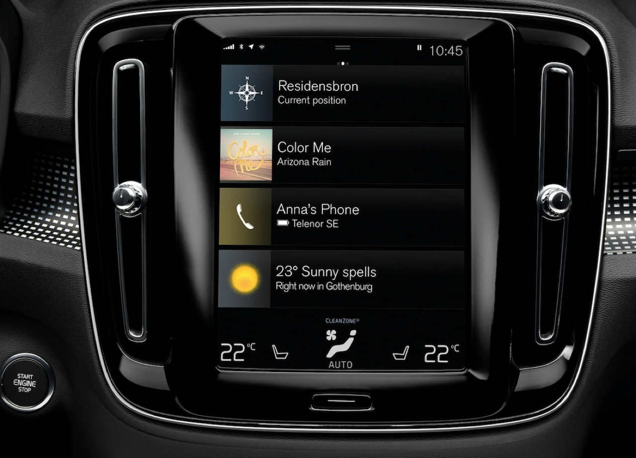 หน้าจอทัชสกรีนส่วนกลางรุ่นที่เคยคว้ารางวัลมาแล้วได้ถูกนำมาติดตั้งใน XC40 เพียงแค่แตะและปัดเบาๆ ก็สามารถใช้งานระบบนำทาง รวมถึงฟังก์ชั่นและแอปพลิเคชันต่างๆ ได้อย่างง่ายดายเหมือนกำลังใช้แท็บเล็ต ฟังก์ชั่นการสั่งงานด้วยเสียงยังทำให้สามารถควบคุมการทำงานของรถได้ง่ายในขณะขับขี่ ระบบ Apple CarPlay และ Android Auto เพื่อการเชื่อมต่อกับอุปกรณ์ไอที จอแสดงผลของนักขับก็มีความชัดเจนและดูข้อมูลได้อย่างสะดวก คนขับสามารถควบคุมระบบเสียงและการทำงานของเครื่องยนต์ได้จากจอนี้เพื่อการควบคุมที่ง่ายดายและรวดเร็ว จอยังสามารถปรับความสว่างได้อย่างชาญฉลาดตามลักษณะแสงของสภาพแวดล้อม