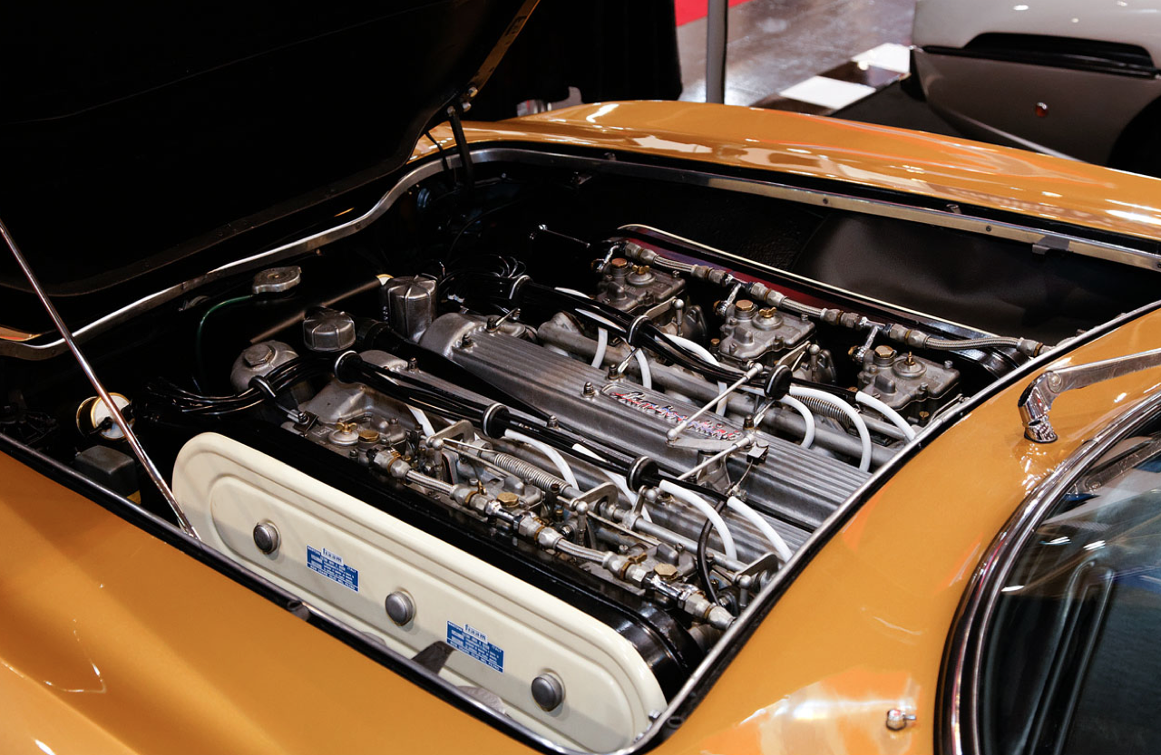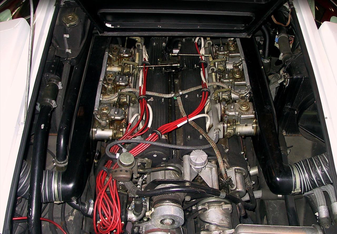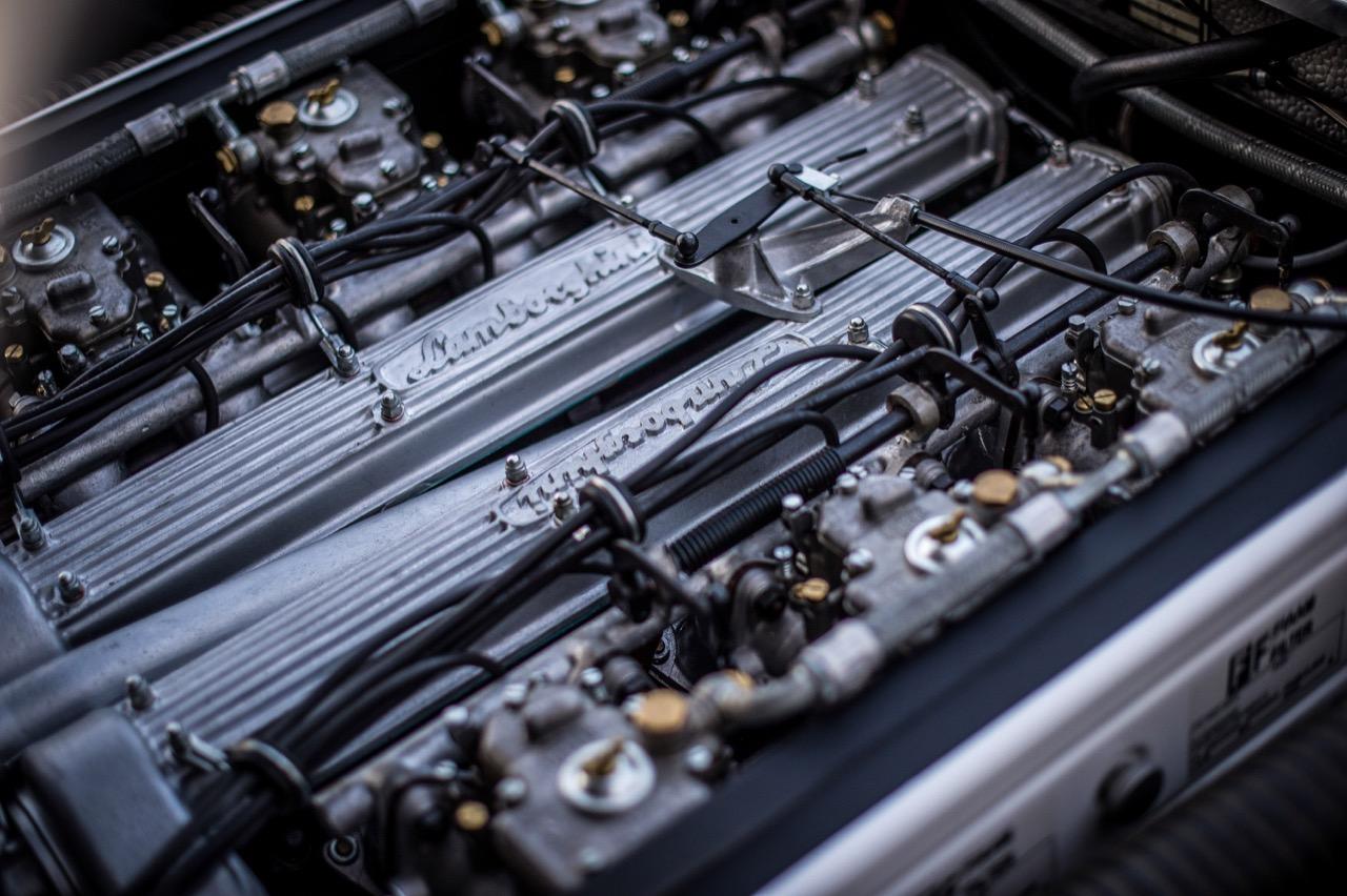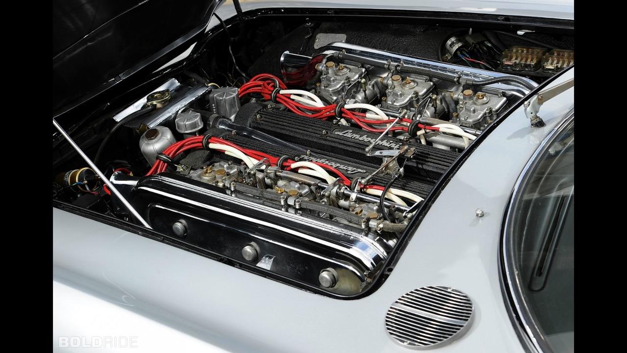 เครื่องโฟร์แคม V12 ซึ่งเป็นเครื่องยนต์รุ่นแรกที่พัฒนาโดย Lamborghini ถูกวางลงบนตัวรถสปอร์ตรุ่นบุกเบิก โดยใช้เพลาราวลิ้น 4 ชุดกับระยะชักของลูกสูบที่สั้นลง วางตำแหน่งของท่อไอดีคร่อมตัวเครื่องขนานไปกับแคมชาร์ป โดยติดตั้งคาร์บูเรเตอร์ฝั่งละ 3 ตัว รวมทั้งหมด 6 ตัว คาร์บูเรเตอร์ 3 ตัวจะรับหน้าที่จ่ายเชื้อเพลิงเข้าสู่ท่อร่วมไอดีของลูกสูบทั้ง 6 ตัวในแต่ละฝั่งและสามารถอัดอากาศเข้าห้องเผาไหม้เกือบจะโดยตรง การรักษาอัตราส่วนกำลังอัดถูกทำโดยใช้เพลาลูกเบี้ยวของท่อไอดีทั้งสองฝั่ง โดยใช้การออกแบบให้ชิดกันมากกว่าปกติ เครื่องยนต์ถูกจูนให้มีแรงม้าประมาณ 370 ตัว (ปีค.ศ. 1964-1965) และมีรอบสูงถึง 9000 รอบต่อนาที เมื่อผลิตออกขาย เครื่องยนต์ตัวนี้ถูกทอนแรงมาลงอีกจนเหลือเพียง 270 เพื่อความเหมาะสมในการวางลงในสปอร์ตคาร์คันแรกของแบรนด์กระทิงเปลี่ยว นั่นก็คือ Lamborghini 350 GT กระทิงต้นตระกูลผู้เข้ามาปราบม้าลำพองสีแดงของ Ferrari และนี่คือเหล่าบรรดากระทิงโบราณวางเครื่อง V12 เป็นสายพันธุ์รถซุปเปอร์คาร์จากอิตาลีที่ได้รับความนิยมในยุคนั้น