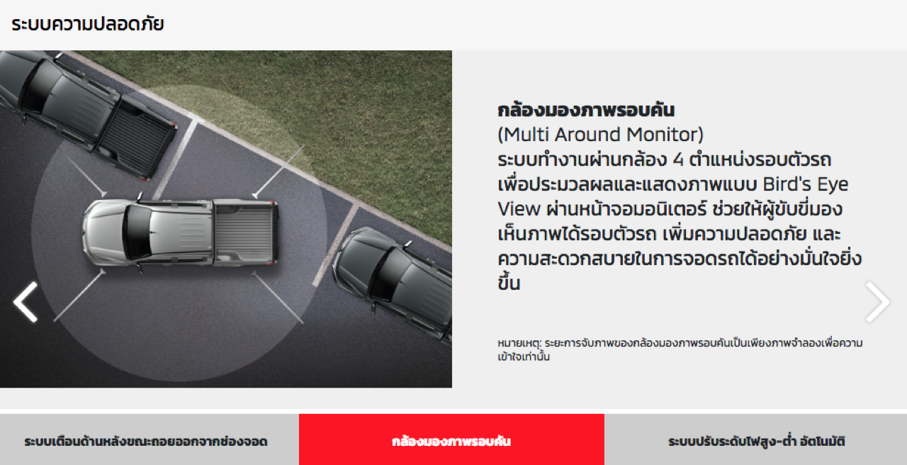 ระบบความปลอดภัย ประกอบด้วยกล้องมองภาพรอบคัน ใช้กล้อง 4 ตัวจับภาพรอบคัน พร้อมภาพมุมสูงที่แสดงสิ่งกีดขวาง เซนเซอร์กะระยะจอด สำหรับรุ่นขับเคลื่อน 4 ล้อมาพร้อมกับระบบควบคุมรถขณะลงทางลาดชัน รักษาความเร็วรถให้คงที่ขณะขับลงทางลาดชัน ระบบควบคุมเสถียรภาพการทรงตัว และระบบปรับระดับไฟสูง-ต่ำอัตโนมัติ