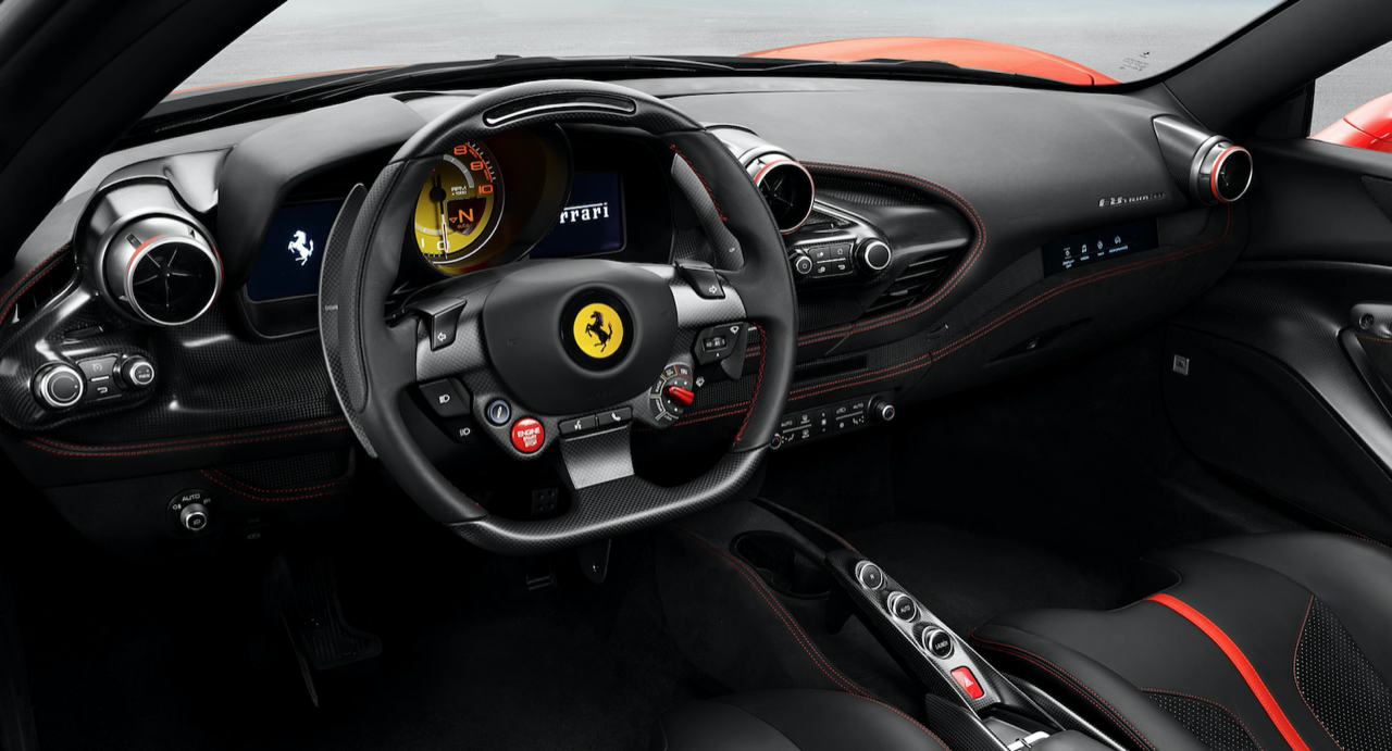 สปอยเลอร์โอบล้อมตลอดแนวไฟท้าย ช่วยลดจุดศูนย์ถ่วงของรถให้ต่ำลง ชุดไฟท้ายคู่นำเอารูปทรงย้อนยุคของรุ่น 308 GTB ปี 1975 ซึ่งเป็นหนึ่งในตำนานรถเครื่องยนต์ V8 อันเลื่องชื่อ มาปรับใช้ ห้องโดยสารยังคงความคลาสสิก ที่มุ่งเน้นรูปลักษณ์โดยรวมที่เป็นเอกลักษณ์ของเฟอรารีเครื่องวางกลางด้านหลัง แต่ทุกองค์ประกอบของแดชบอร์ด, แผงประตู และคอนโซลกลาง ได้รับการออกแบบใหม่อย่างสมบูรณ์ ระบบ HMI รุ่นใหม่ (Human Machine Interface) มาพร้อมช่องแอร์แบบกลม, พวงมาลัยและตัวควบคุมแบบใหม่ รวมถึงหน้าจอสัมผัสขนาด 7 นิ้วสำหรับผู้โดยสาร ที่ช่วยให้ผู้นั่งสามารถเห็นค่าการทำงานต่างๆ ของรถได้เช่นเดียวกับผู้ขับ