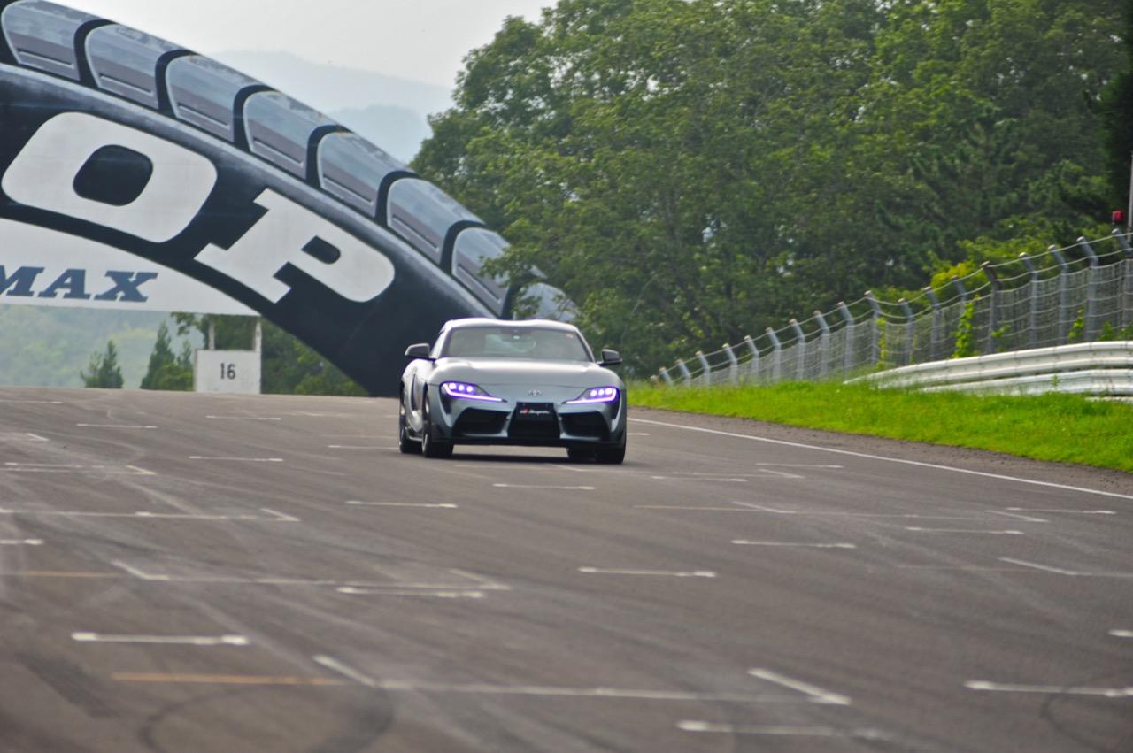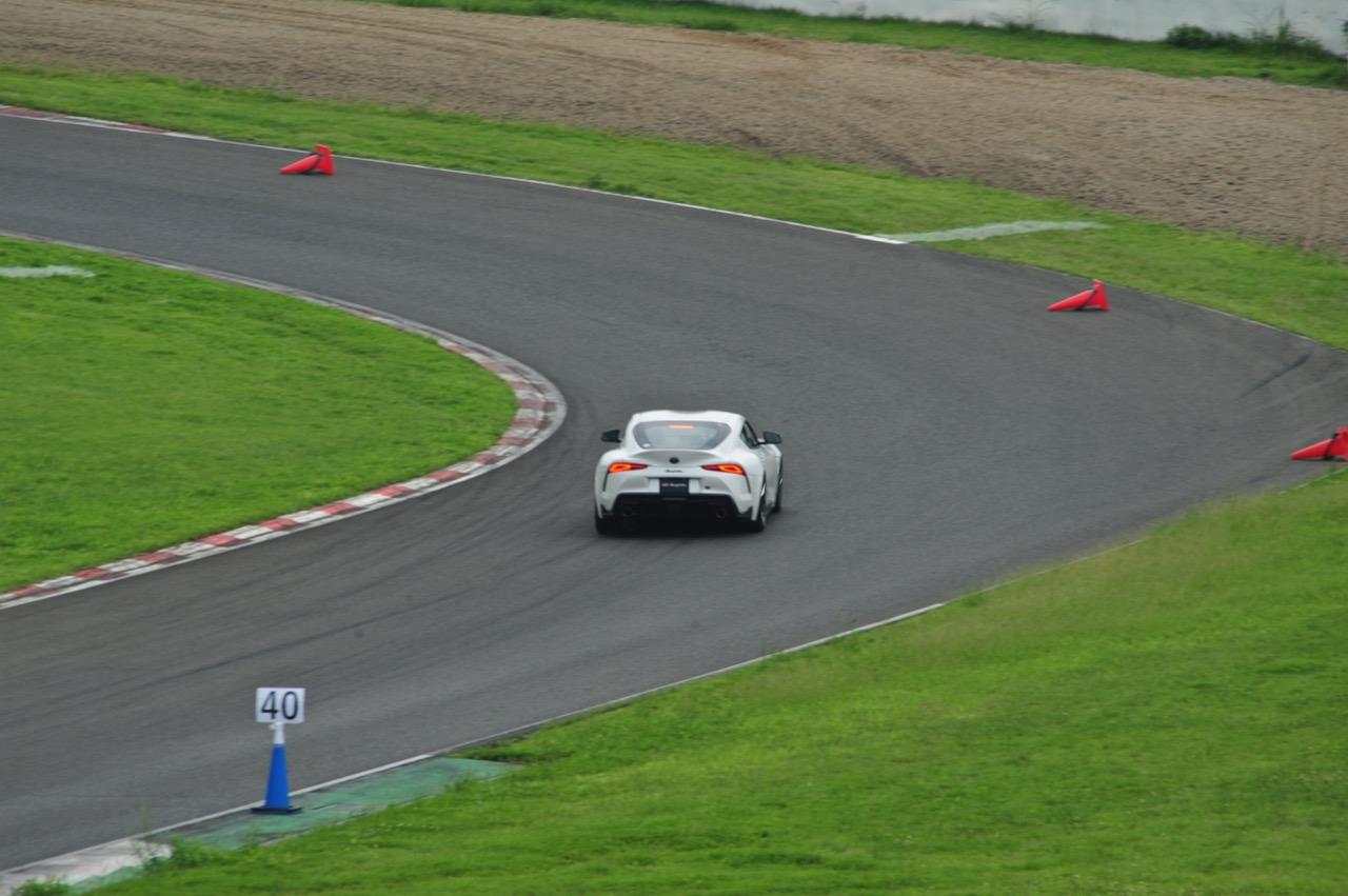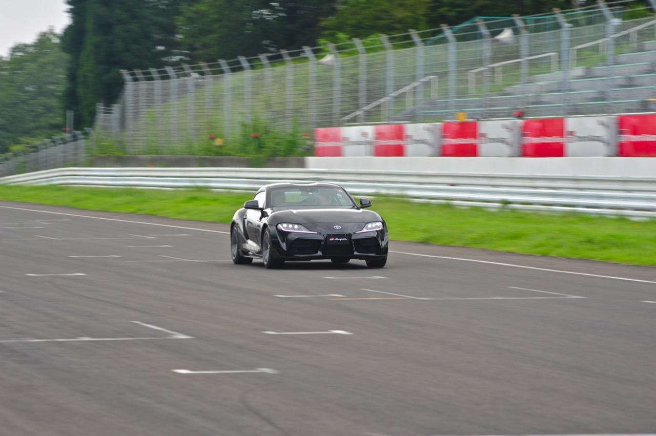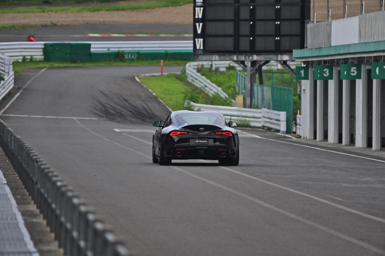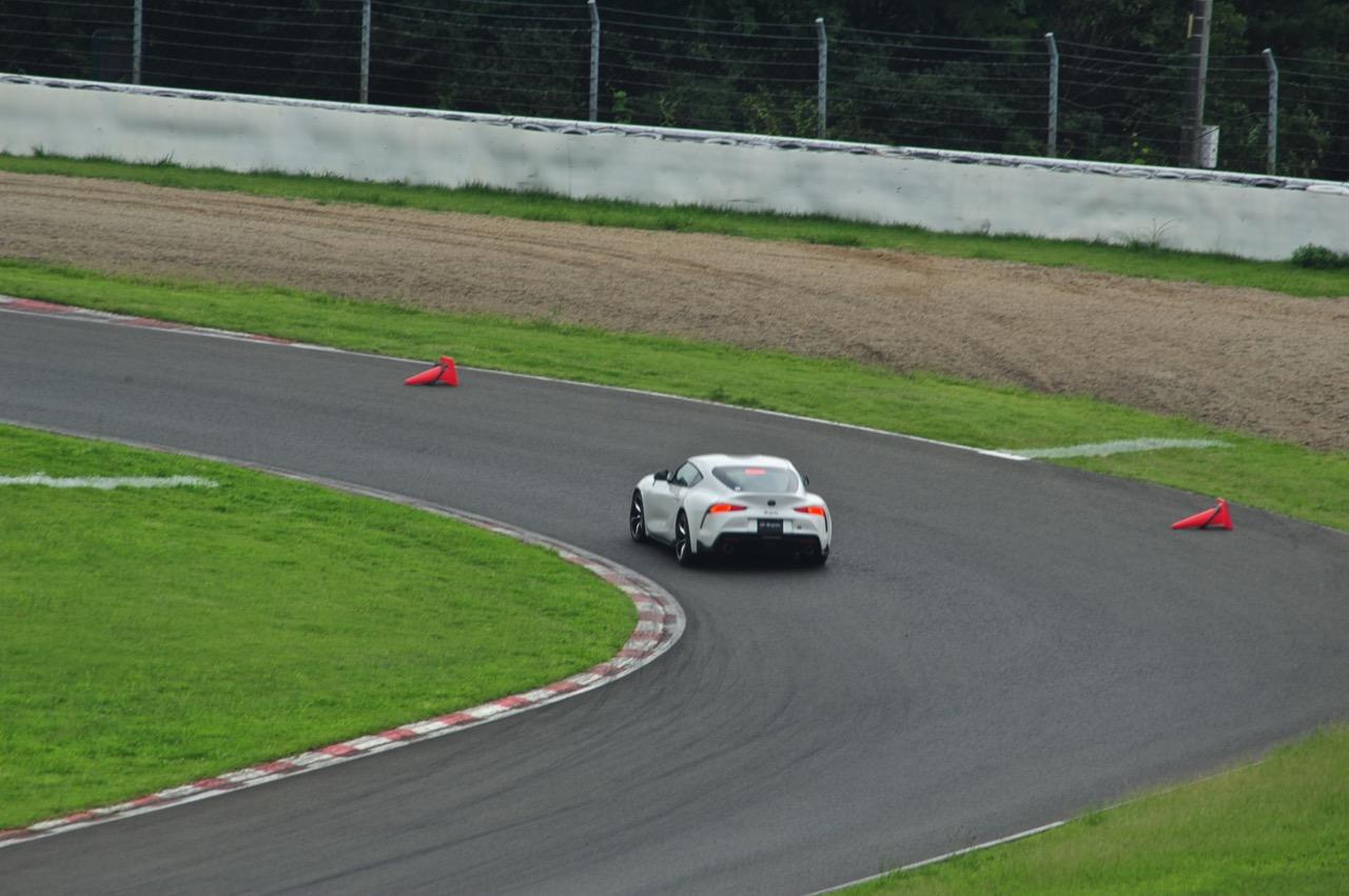 ในช่วงบ่าย หลังจากขับบนถนนสาธารณะของเมืองเซนไดก็มาถึงการอัดสปอร์ตรุ่นใหม่ของ Toyota ในสนามแข่ง Sugo International Racing Course ความยาว 3.737 กิโลเมตร เป็นสนามแข่งรถเล็กๆ ที่อุดมไปด้วยโค้งอันน่าหวาดหวั่นมากถึง 13 โค้ง จุดอันตรายที่สุดในสนามมีอยู่ทั่วไปหมดและทำให้คนที่ไม่เคยลองขับในสนามแข่งแห่งนี้ถึงกับขนหัวลุก ผมขึ้นรถ GR Supra สีเทาที่ขับตั้งแต่ตอนเช้าบนถนนของเมืองเซนได แล้วขับออกไป เพียงแค่ 2-3 โค้งแรกก็รู้สึกได้แล้วว่าแม้วงพวงมาลัยจะอวบอ้วนและมีน้ำหนักตึงมือกับแป้นเปลี่ยนตำแหน่งเกียร์ Paddle Shift สไตล์ BMW แต่น้ำหนักเวลาหักเลี้ยวนั้นจะไม่ขืนมือมากเท่า BMW Z4 M40i โรดสเตอร์สายพันธุ์แรงที่ผมขับก่อนหน้าที่จะเดินทางมาทดสอบในญี่ปุ่นแค่อาทิตย์เดียว และที่สำคัญ การตอบสนองของรถมีความคล้ายกับ GT86 อย่างมาก คือเลี้ยวเท่าไร เร่งเท่าไร มันก็ให้เราตามที่เราสั่ง ไม่มากหรือน้อยเกินไป คาดเดาอาการได้ง่าย GR Supra ไม่ได้กวาดท้ายออกง่ายอย่างที่คิด เว้นเสียแต่ว่าคุณตั้งใจทำ ตอบสนองไว แต่ไม่กระโชกโฮกฮาก เกาะถนนดี แชสซีและช่วงล่างแบบค่าตายตัวรู้อาการทุกอย่างที่เกิดกับหน้าและท้ายรถ ขับสนุกและง่ายต่อการควบคุมแบบรถเครื่องวางหน้าขับหลังตามที่คาดหวัง แต่อันที่จริง ตัวเครื่องยนต์เกือบทั้งหมดถูกวางไว้หลังแนวแทร็คล้อหน้า คล้ายกับของ Lexus LC500 ดังนั้นจะเรียกว่าเป็น Front/Mid Engine ก็คงจะไม่ผิด การกระจายน้ำหนัก 50/50 แบบ Z4 ก็ยิ่งทำให้รถมีความเสถียรมากยิ่งขึ้นเมื่อขับเข้าโค้งด้วยความเร็วสูงอาการโคลงตัวแทบจะไม่ปรากฏออกมาให้เสียวสันหลัง