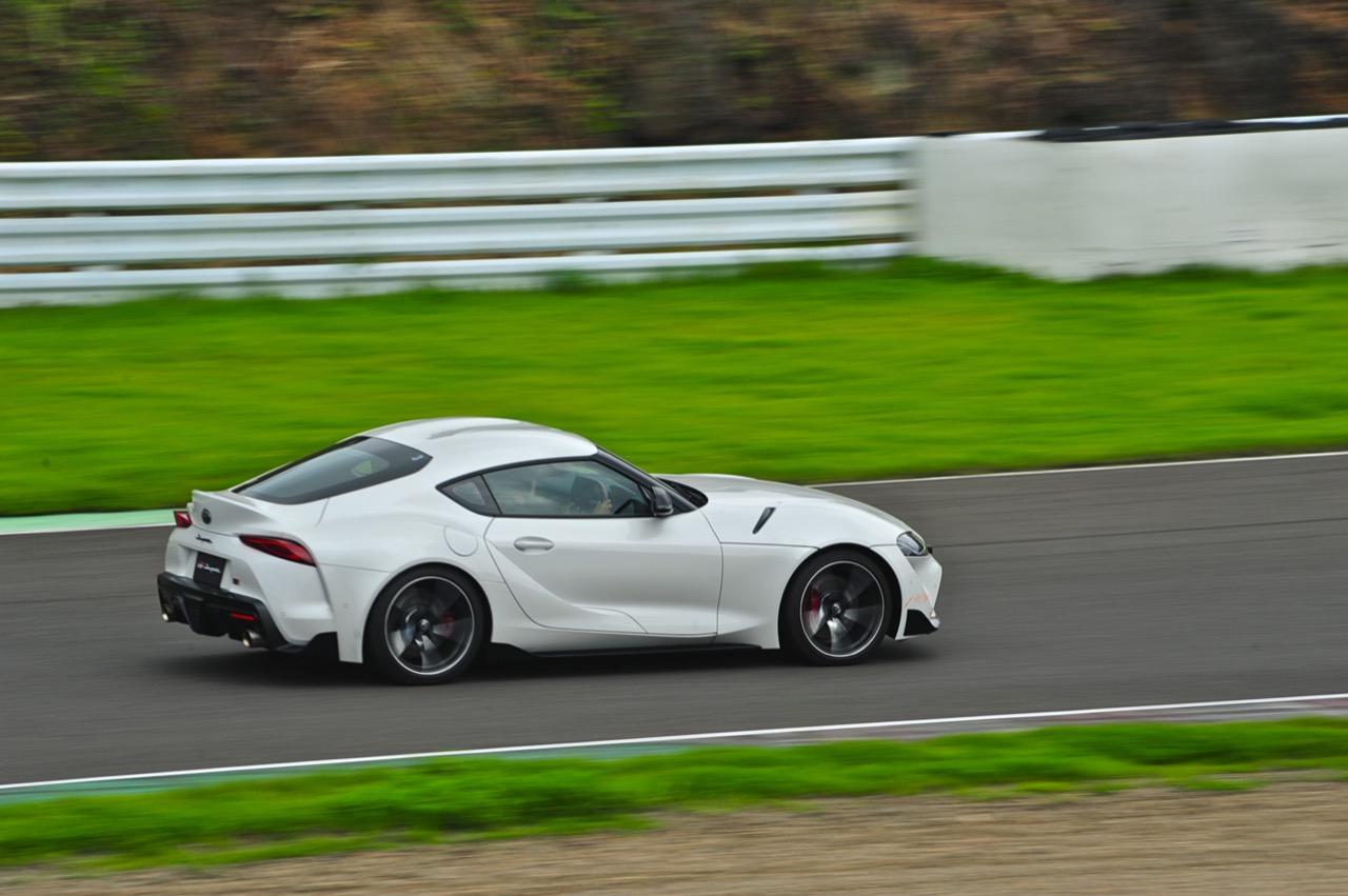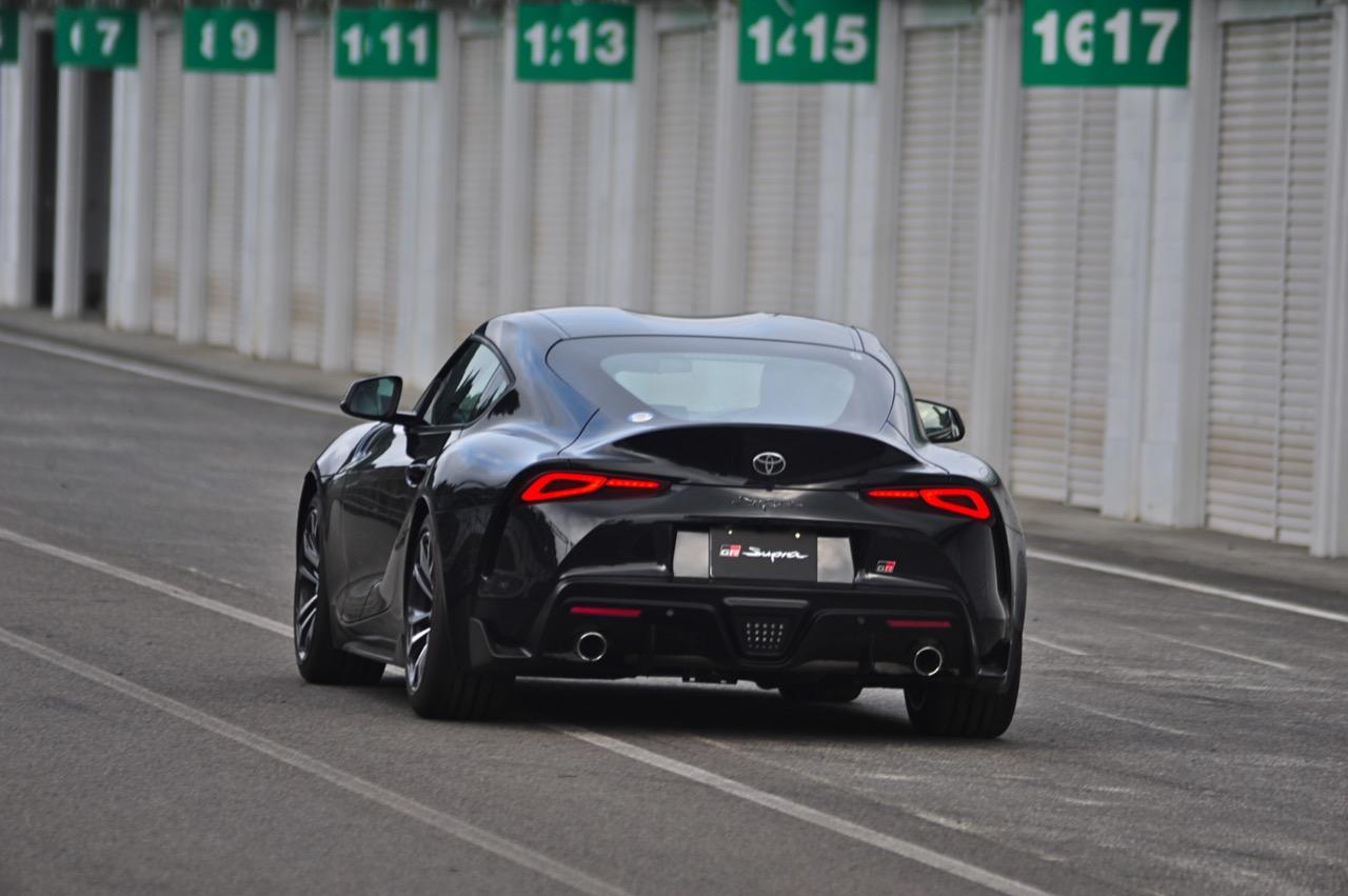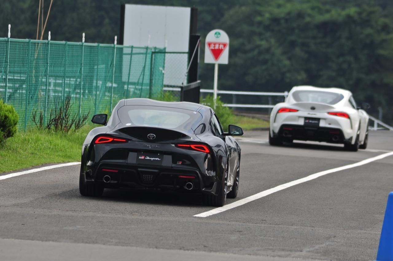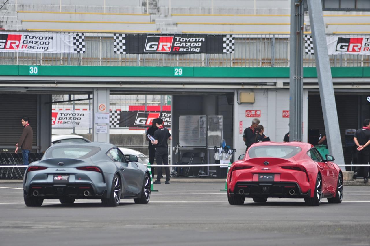 ในช่วงบ่าย หลังจากขับบนถนนสาธารณะของเมืองเซนไดก็มาถึงการอัดสปอร์ตรุ่นใหม่ของ Toyota ในสนามแข่ง Sugo International Racing Course ความยาว 3.737 กิโลเมตร เป็นสนามแข่งรถเล็กๆ ที่อุดมไปด้วยโค้งอันน่าหวาดหวั่นมากถึง 13 โค้ง จุดอันตรายที่สุดในสนามมีอยู่ทั่วไปหมดและทำให้คนที่ไม่เคยลองขับในสนามแข่งแห่งนี้ถึงกับขนหัวลุก ผมขึ้นรถ GR Supra สีเทาที่ขับตั้งแต่ตอนเช้าบนถนนของเมืองเซนได แล้วขับออกไป เพียงแค่ 2-3 โค้งแรกก็รู้สึกได้แล้วว่าแม้วงพวงมาลัยจะอวบอ้วนและมีน้ำหนักตึงมือกับแป้นเปลี่ยนตำแหน่งเกียร์ Paddle Shift สไตล์ BMW แต่น้ำหนักเวลาหักเลี้ยวนั้นจะไม่ขืนมือมากเท่า BMW Z4 M40i โรดสเตอร์สายพันธุ์แรงที่ผมขับก่อนหน้าที่จะเดินทางมาทดสอบในญี่ปุ่นแค่อาทิตย์เดียว และที่สำคัญ การตอบสนองของรถมีความคล้ายกับ GT86 อย่างมาก คือเลี้ยวเท่าไร เร่งเท่าไร มันก็ให้เราตามที่เราสั่ง ไม่มากหรือน้อยเกินไป คาดเดาอาการได้ง่าย GR Supra ไม่ได้กวาดท้ายออกง่ายอย่างที่คิด เว้นเสียแต่ว่าคุณตั้งใจทำ ตอบสนองไว แต่ไม่กระโชกโฮกฮาก เกาะถนนดี แชสซีและช่วงล่างแบบค่าตายตัวรู้อาการทุกอย่างที่เกิดกับหน้าและท้ายรถ ขับสนุกและง่ายต่อการควบคุมแบบรถเครื่องวางหน้าขับหลังตามที่คาดหวัง แต่อันที่จริง ตัวเครื่องยนต์เกือบทั้งหมดถูกวางไว้หลังแนวแทร็คล้อหน้า คล้ายกับของ Lexus LC500 ดังนั้นจะเรียกว่าเป็น Front/Mid Engine ก็คงจะไม่ผิด การกระจายน้ำหนัก 50/50 แบบ Z4 ก็ยิ่งทำให้รถมีความเสถียรมากยิ่งขึ้นเมื่อขับเข้าโค้งด้วยความเร็วสูงอาการโคลงตัวแทบจะไม่ปรากฏออกมาให้เสียวสันหลัง
