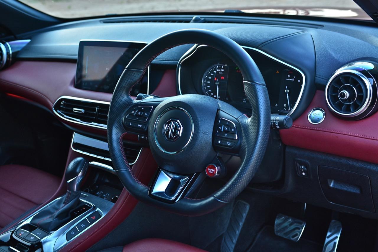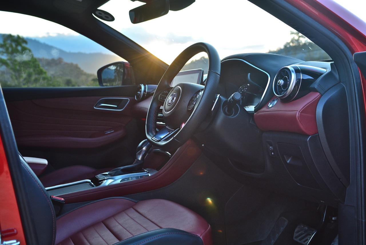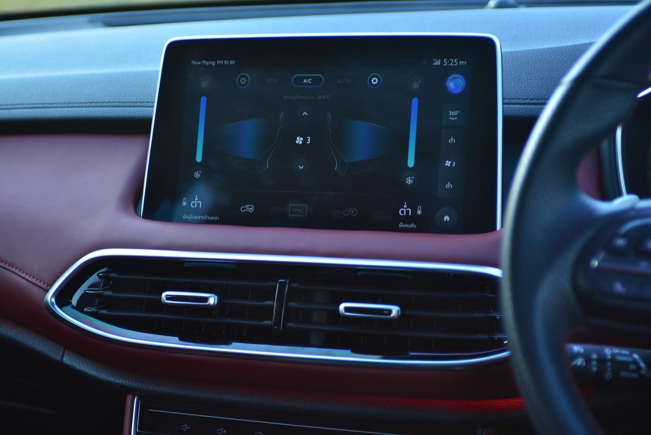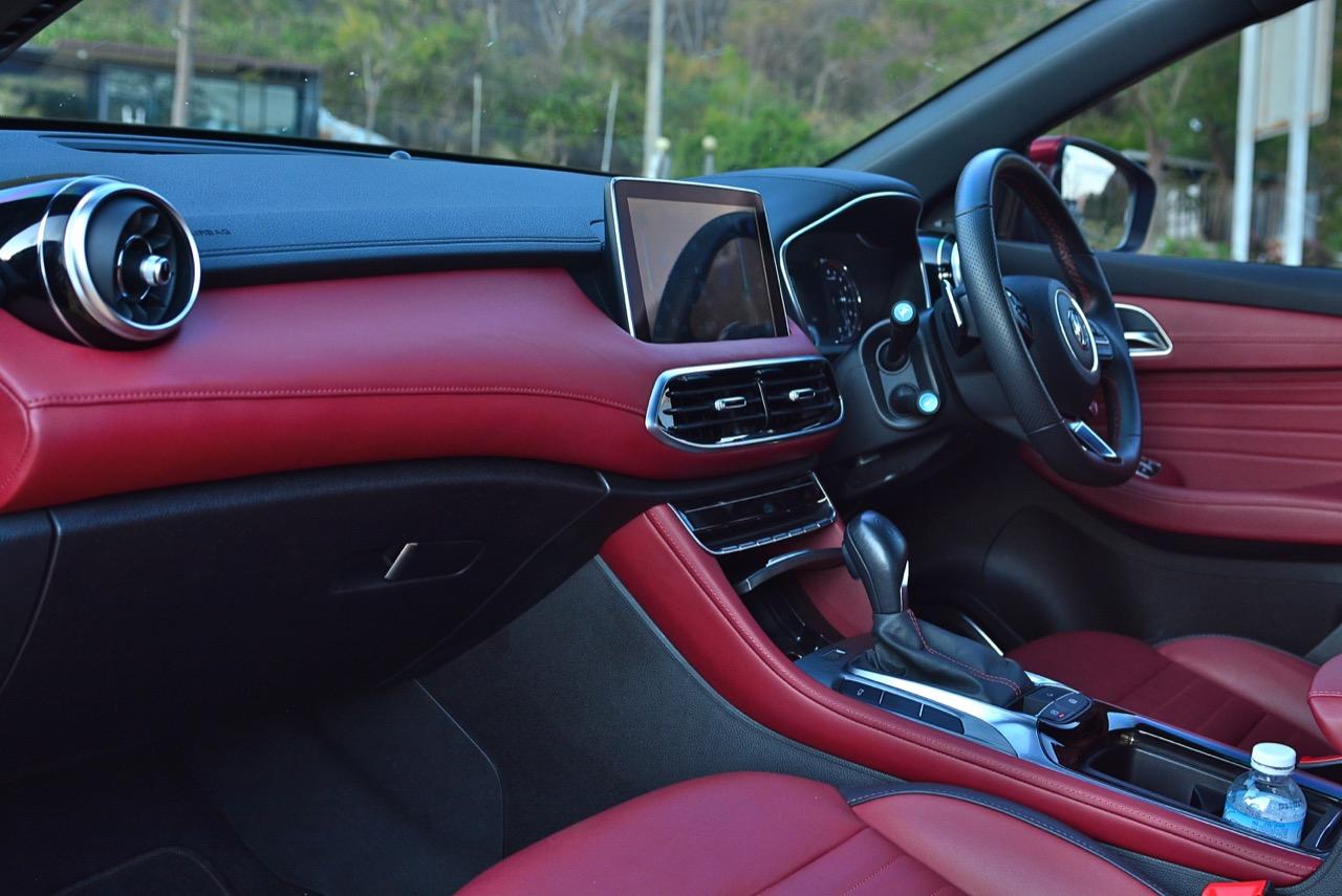 ภายในห้องโดยสารของ HS รุ่นสูงสุด คุณจะอึ้งกับความหรูหราที่ MG ประดังมาให้แบบจัดเต็มทรง Cockpit โทนดำสลับแดงบุด้วยวัสดุเนื้อนิ่มเนี้ยบๆ ทำให้ใครต่อใครพากันหลงใหลได้ปลื้มกับงานตกแต่งห้องโดยสารที่ดีที่สุดในรถยนต์ราคาล้านนิดๆ แดชบอร์ดแบบโฟมขึ้นรูปหุ้มด้วยหนังสังเคราะห์สีดำสลับสีแดง ช่องแอร์ทรงกลมคล้ายกับของ Mercedes-Benz New E-Class จอมอนิเตอร์กลางระบบสัมผัสขนาดใหญ่ยักษ์สะใจ Smart Touchscreen ขนาด 10 นิ้ว พวงมาลัยมัลติฟังก์ชั่นทรง 3 ก้านหุ้มหนังแท้สีดำเย็บด้วยด้ายแดง ลำโพง 6 ตำแหน่งคุณภาพปานกลาง จุดเด่นซึ่งเป็นที่มาของความสบายนอกจากพื้นที่ภายในที่พอเพียงก็ขอให้ดูกันที่เบาะไฟฟ้าคู่หน้าหุ้มหนัง Alcantara สีดำสลับแดงใน HS X รุ่นท็อป เบาะทรงสปอร์ตที่สวยงามน่านั่งคู่นี้น่าจะอยู่ใน Mercedes-Benz GLC Coupe มากกว่าจะมาเป็นเบาะของ MG HS X ตัวเบาะออกแบบได้ดี ดีไซน์พนักพิงศีรษะที่ลงตัวแม้จะปรับไม่ได้ก็ไม่ได้ดันกบาลคนนั่งแต่อย่างใดทั้งสิ้น เบาะปรับไฟฟ้าคู่หน้ายังฝัง Airbag เพื่อความปลอดภัยเมื่อเกิดอุบัติเหตุ ตำแหน่งท่านั่งสูงไปนิดแต่มองเห็นได้รอบตัว ความกระชับและพื้นที่รองต้นขาที่พอเพียงทำให้นั่งขับหรือโดยสารทางไกลได้โดยปราศจากอาการปวดเมื่อย เป็นอีกจุดที่ทำออกมาได้อย่างหรูหราเกินราคาค่าตัวอย่างชัดเจน