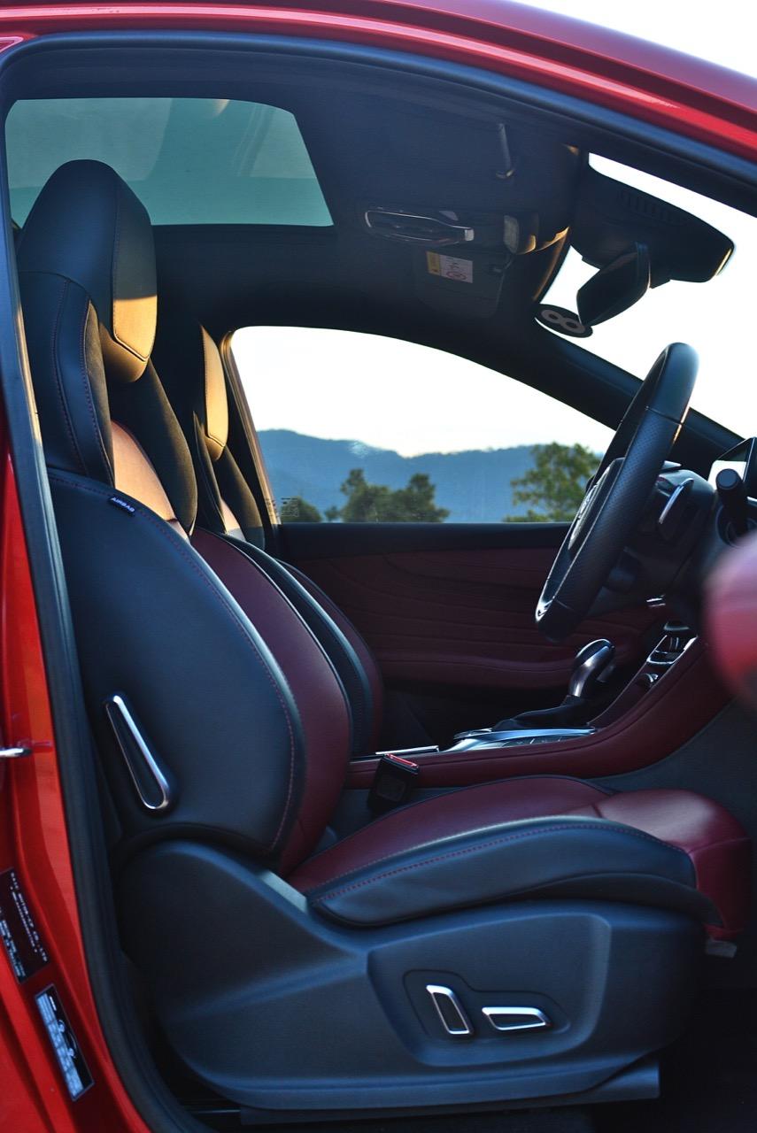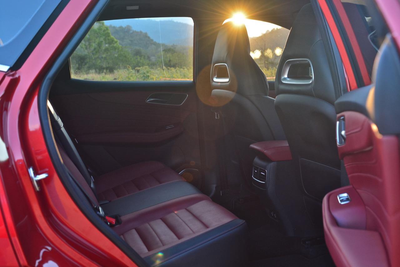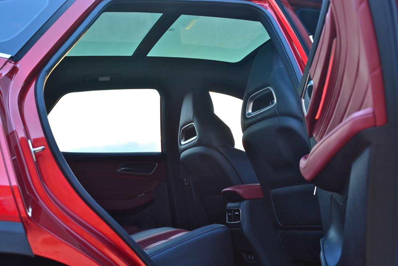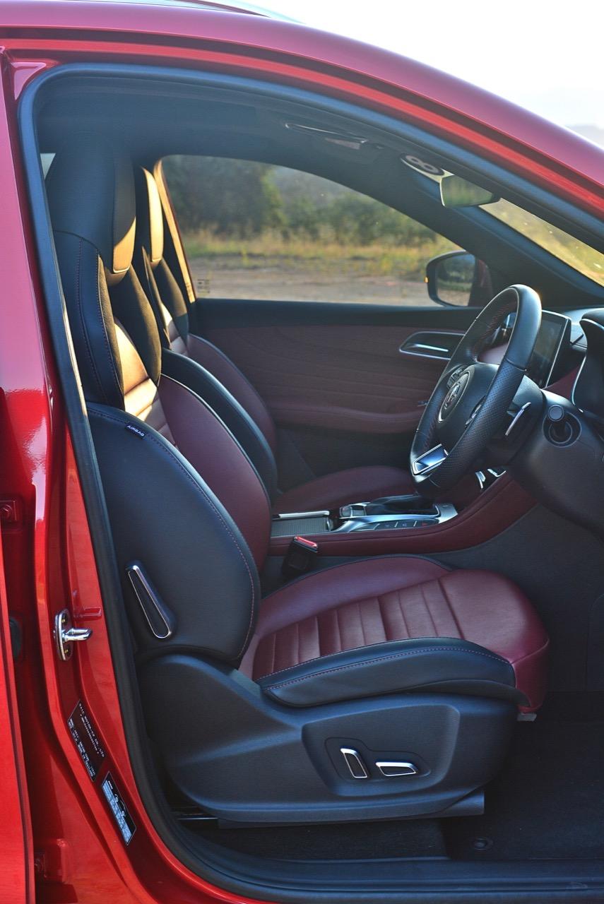 ภายในห้องโดยสารของ HS รุ่นสูงสุด คุณจะอึ้งกับความหรูหราที่ MG ประดังมาให้แบบจัดเต็มทรง Cockpit โทนดำสลับแดงบุด้วยวัสดุเนื้อนิ่มเนี้ยบๆ ทำให้ใครต่อใครพากันหลงใหลได้ปลื้มกับงานตกแต่งห้องโดยสารที่ดีที่สุดในรถยนต์ราคาล้านนิดๆ แดชบอร์ดแบบโฟมขึ้นรูปหุ้มด้วยหนังสังเคราะห์สีดำสลับสีแดง ช่องแอร์ทรงกลมคล้ายกับของ Mercedes-Benz New E-Class จอมอนิเตอร์กลางระบบสัมผัสขนาดใหญ่ยักษ์สะใจ Smart Touchscreen ขนาด 10 นิ้ว พวงมาลัยมัลติฟังก์ชั่นทรง 3 ก้านหุ้มหนังแท้สีดำเย็บด้วยด้ายแดง ลำโพง 6 ตำแหน่งคุณภาพปานกลาง จุดเด่นซึ่งเป็นที่มาของความสบายนอกจากพื้นที่ภายในที่พอเพียงก็ขอให้ดูกันที่เบาะไฟฟ้าคู่หน้าหุ้มหนัง Alcantara สีดำสลับแดงใน HS X รุ่นท็อป เบาะทรงสปอร์ตที่สวยงามน่านั่งคู่นี้น่าจะอยู่ใน Mercedes-Benz GLC Coupe มากกว่าจะมาเป็นเบาะของ MG HS X ตัวเบาะออกแบบได้ดี ดีไซน์พนักพิงศีรษะที่ลงตัวแม้จะปรับไม่ได้ก็ไม่ได้ดันกบาลคนนั่งแต่อย่างใดทั้งสิ้น เบาะปรับไฟฟ้าคู่หน้ายังฝัง Airbag เพื่อความปลอดภัยเมื่อเกิดอุบัติเหตุ ตำแหน่งท่านั่งสูงไปนิดแต่มองเห็นได้รอบตัว ความกระชับและพื้นที่รองต้นขาที่พอเพียงทำให้นั่งขับหรือโดยสารทางไกลได้โดยปราศจากอาการปวดเมื่อย เป็นอีกจุดที่ทำออกมาได้อย่างหรูหราเกินราคาค่าตัวอย่างชัดเจน