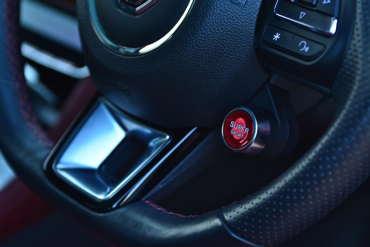พวงมาลัย 3 ก้านหุ้มหนังแท้ทรงฐานตัดแบบสปอร์ตมาพร้อมสวิตช์มัลติฟังก์ชัน ปุ่ม Super Sport Mode สีแดงคล้ายสวิตช์ปรับโหมดของ Porsche ก้านพวงมาลัยยังติดตั้งปุ่มควบคุมหน้าจอภาพ MID multi information display ปุ่มควบคุมเครื่องเสียงและระบบโทรศัพท์ ก้านสวิตช์ระบบปรับตั้งความเร็วอัตโนมัติ Adaptive Cruise Control แป้นเปลี่ยนตำแหน่งเกียร์หลังพวงมาลัย Paddle Shift ให้กันมายิ่งกว่าครบและใช้งานกันไม่หมดละครับ พวงมาลัยปรับได้สี่ทิศทางทั้งสูง-ต่ำและไกล-ใกล้