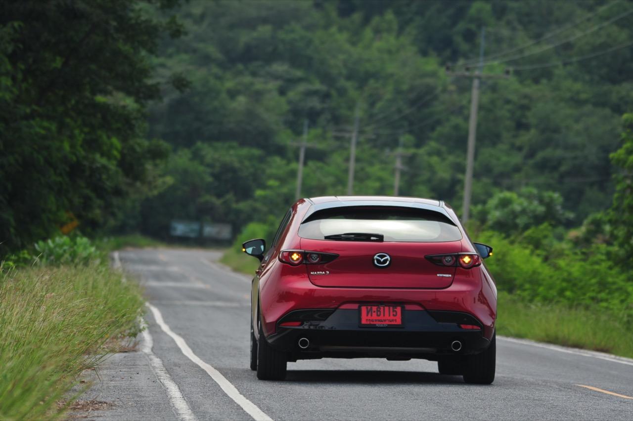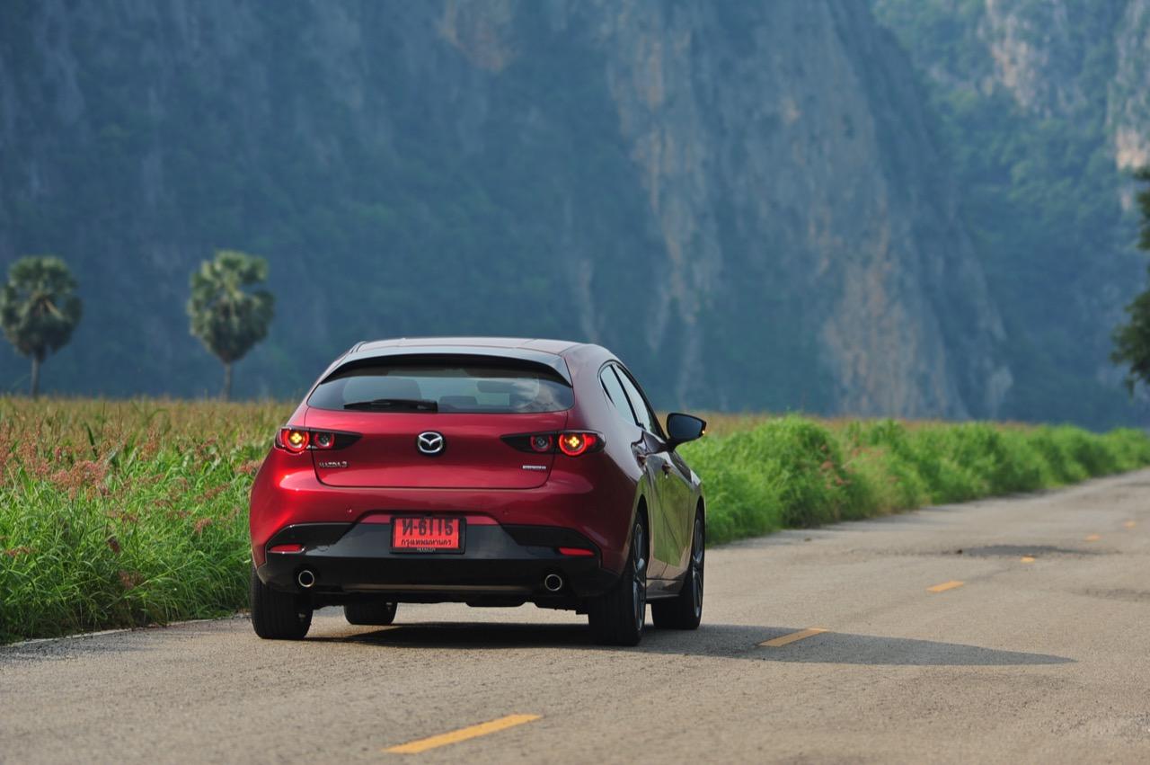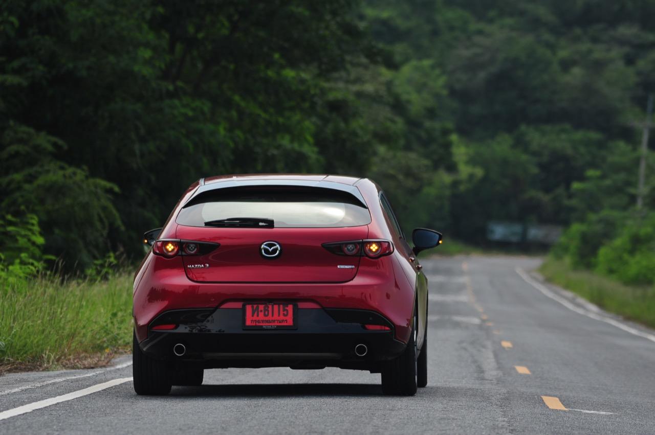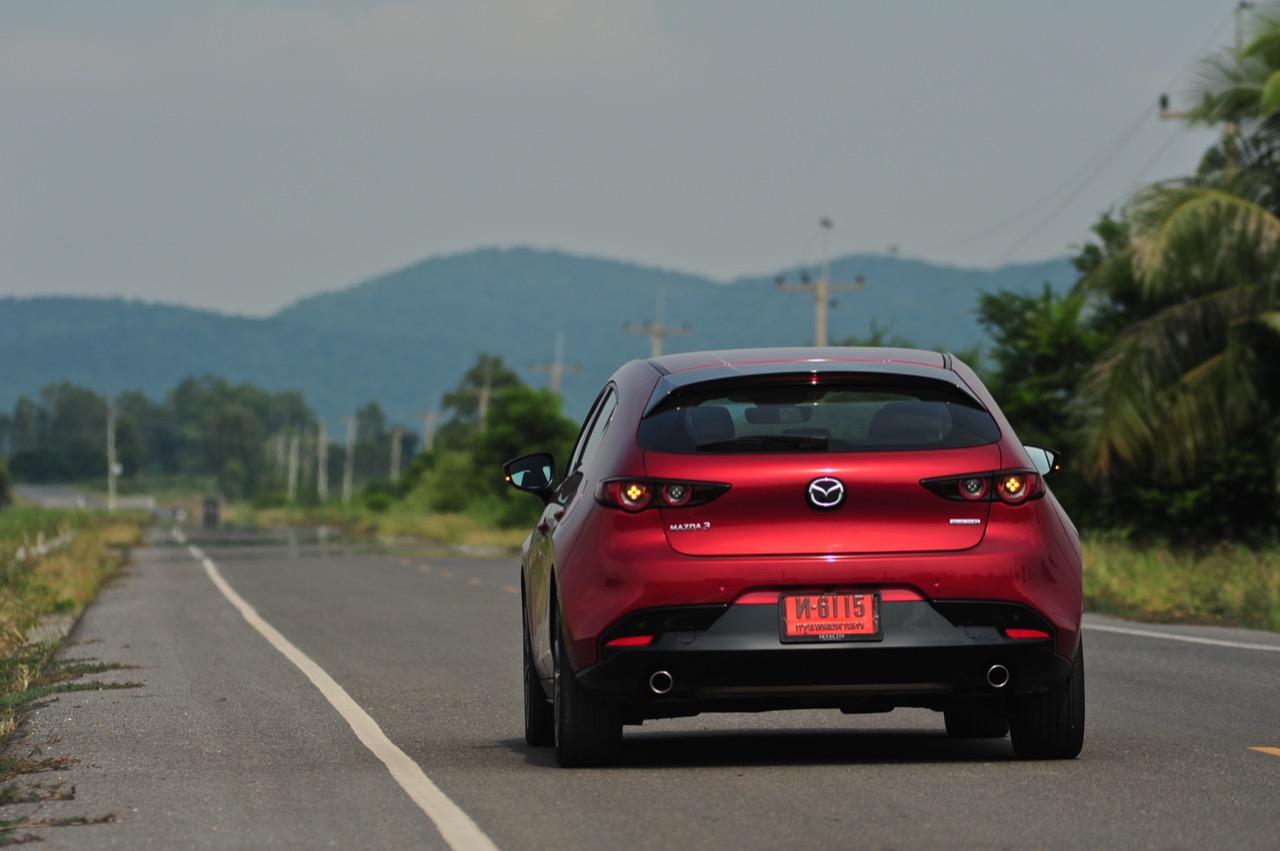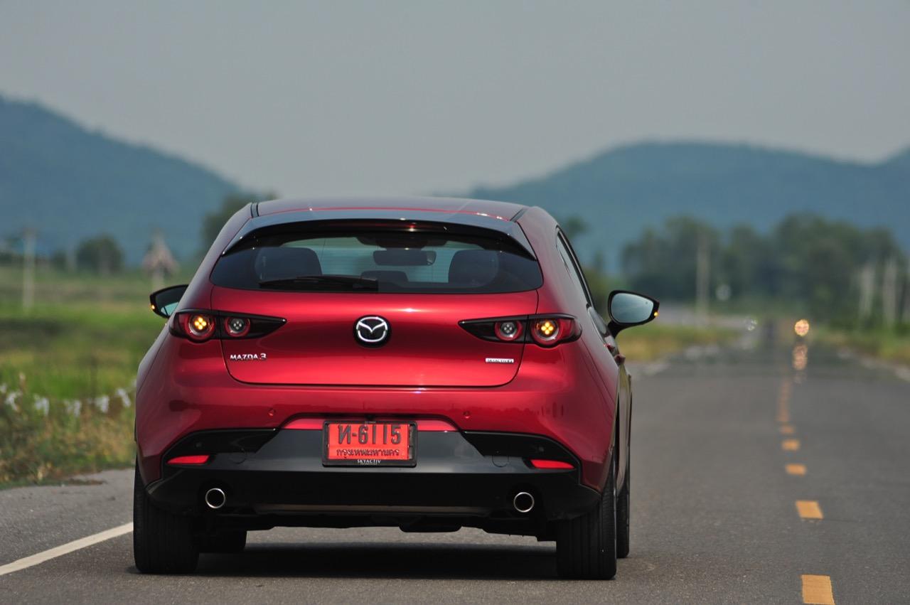 Mazda ปรับเปลี่ยนช่วงล่างของ 3 ใหม่ จากที่ระบบรองรับด้านหลังเคยเป็นแบบมัลติลิงก์ก็เปลี่ยนมาเป็นคานแข็งทอร์ชั่นบีม หลายคนพอเห็นเข้ายังไม่ได้เคยลองขับก็ร้องยี้ คิดว่าชิ้นส่วนที่ลดลงจากการเปลี่ยนมาใช้ระบบคานแข็งน่าจะทำให้การทรงตัวแย่ลง แต่กลับไม่ใช่ ทอร์ชั่นบีมที่เซตมาให้นั้นลงตัวกับแพลตฟอร์มใหม่จนไม่ส่งผลกระทบหรือทำให้การทรงตัวเปลี่ยนไปในทางที่แย่ คุณสามารถเข้าโค้งได้เร็วขึ้นด้วยการยึดเกาะทั้งส่วนหน้าและหลังที่หลอมรวมเป็นหนึ่งเดียว มันเป็นรถแฮตช์แบ็คที่สามารถขับเข้าออกโค้งได้อย่างเมามันและสามารถสนุกกับสไตล์การขับของรถรุ่นนี้ได้ทุกเมื่อ ช่วงล่างแบบสปอร์ตของ New Mazda 3 หนึบแน่นมากขึ้น มีแอบกระด้างในบางจังหวะจะโคนที่เจอกับผิวถนนไม่เรียบ แต่ไม่ได้ทำให้สะเทือนจนรู้สึกแย่ ยาง DB เมื่อขับบนทางปูนซีเมนต์มีเสียงการทำงานที่เงียบขึ้น ความหนึบของช่วงล่างทำให้เข้าโค้งได้มั่นใจ โดยเฉพาะถนนที่มีโค้งแคบๆ วกไปวนมา บางโค้งก็พร้อมจะเหวี่ยงรถออกไปนอกถนนหากใช้ความเร็วสูงเกินไป แต่การยึดเกาะที่ยอดเยี่ยมของมันทำให้คุณรู้สึกดี