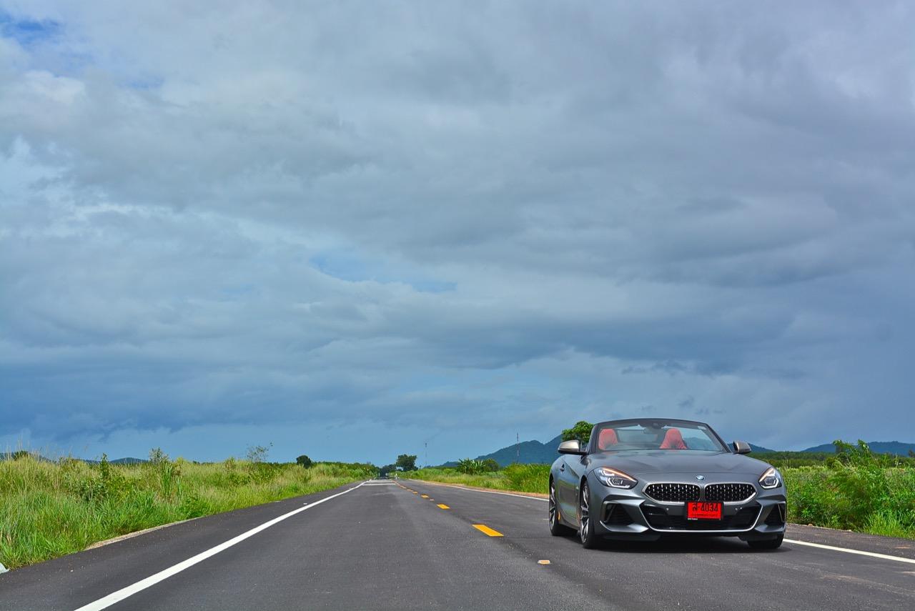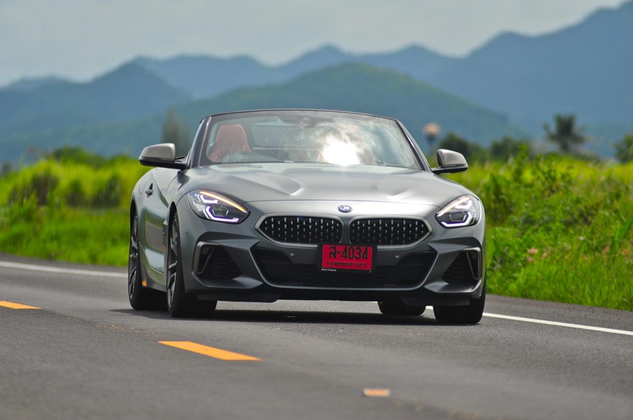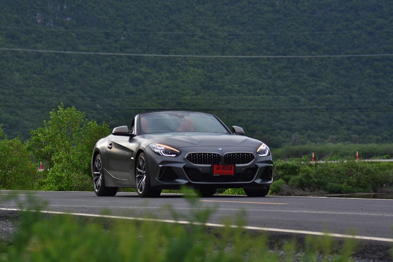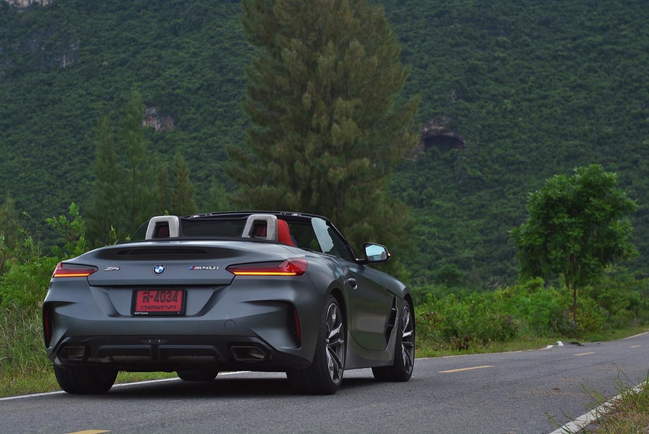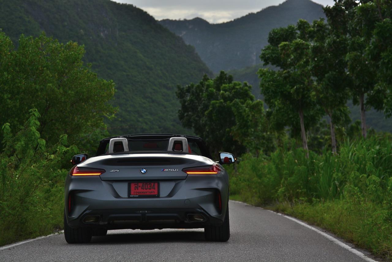 การทดสอบ 8 วัน โดยขับในเมืองแค่นิดเดียว ส่วนใหญ่ เจ้า M40i เปิดหลังคาจะโลดโผนโจนทะยานอยู่บนเส้นทางของอุทยานสามร้อยยอดต่อเชื่อมกับอำเภอกุยบุรี ผมคิดว่า BMW New Z4 M40i เป็นรถที่ขับง่ายกว่า เร่งได้เร็ว เบรกดี คุมแรงให้เบรกตามใจได้เนียนเหมือนหงส์ร่อนลงผิวน้ำ มันมีชุดบังคับเลี้ยวไฟฟ้าที่สามารถหักเลี้ยวไปตามโค้งอย่างว่านอนสอนง่าย เล็งไปทางไหนก็ไปตามสั่ง พร้อมกับน้ำหนักของพวงมาลัยที่แสนจะพอดิบพอดีไม่มีขาดหรือเกิน ไม่เบาจนขาดสัมผัสที่ดีและไม่หนักเหมือน M4 CS ที่มีน้ำหนักของพวงมาลัยราวกับรถแข่ง การที่คุณสามารถใช้ความเร็วในโค้งได้สูงมากนั้นมีส่วนช่วยทำให้เกิดความมั่นใจในการขับและจะยิ่งจัดหนักมากขึ้นเรื่อยๆ ขับในฤดูฝน เมื่อพบเจอกับถนนเปียกแล้วอยากสนุกแต่ก็ต้องระวังให้ดีๆ เพราะการปล่อยแรงบิด 500 นิวตันเมตรลงบนผิวถนนที่เปียกชื้น เป็นเรื่องที่อาจก่อให้เกิดอุบัติเหตุได้ง่ายๆ แค่เข้าโค้งด้วยความเร็วที่เหมาะสม ปล่อยให้ระบบทุกอย่างทำหน้าที่ของมันไปตามเรื่องตามราว ถ้าแน่ใจว่ามีฝีมือมากพอก็เลือกได้เลยว่าจะกดคันเร่งเป็น Power slide หรือจะมาเร็วแล้วยกคันเร่งหมดเป็น Lift-off oversteer รถจะทำตามอย่างว่าง่าย แต่ถ้าถนนแห้ง มันจะไม่ใช่รถที่ท้ายออกง่ายอย่างที่คุณคิดถ้าไม่ใช่ว่าเหยียบคันเร่งเยอะจริงๆ ที่เป็นอย่างนั้นก็เพราะมันใส่ยางที่เกาะสุดๆ อย่าง Pilot Super Sport นั่นเอง