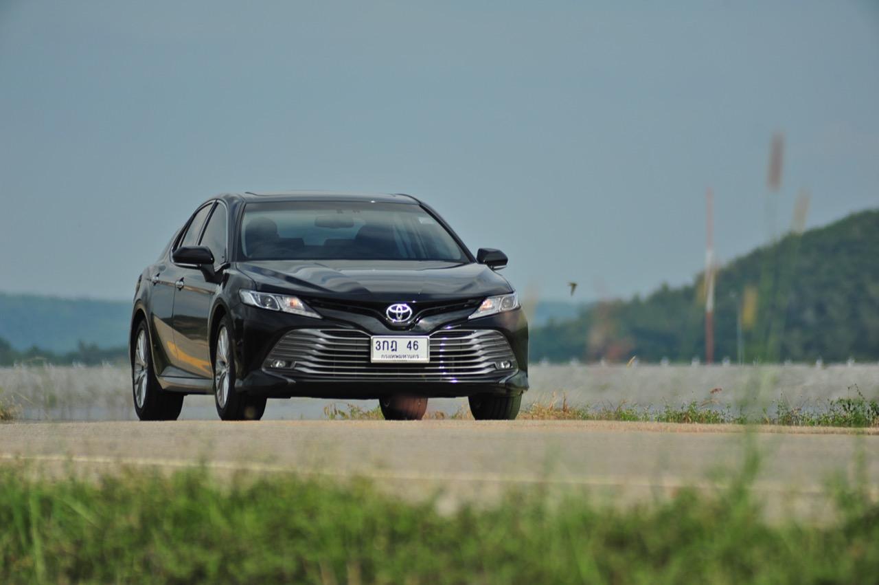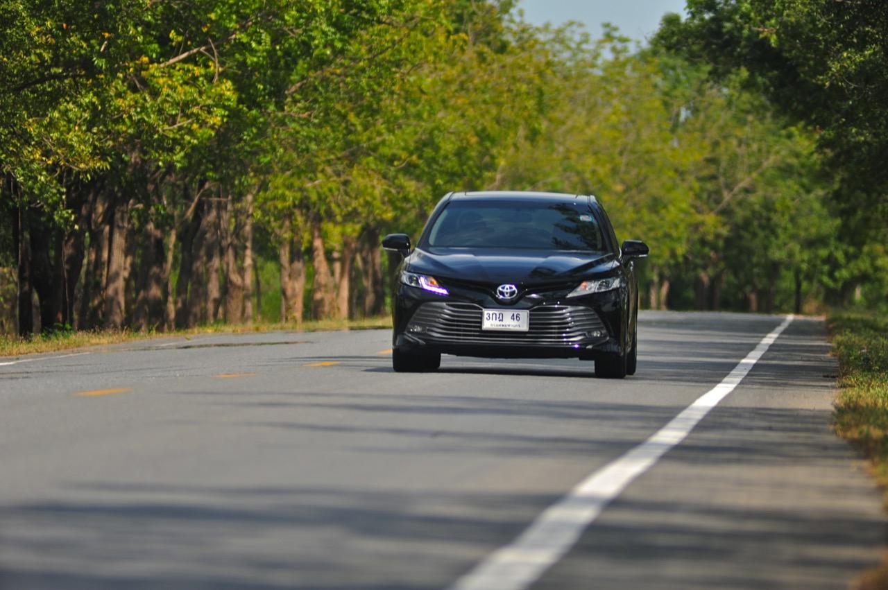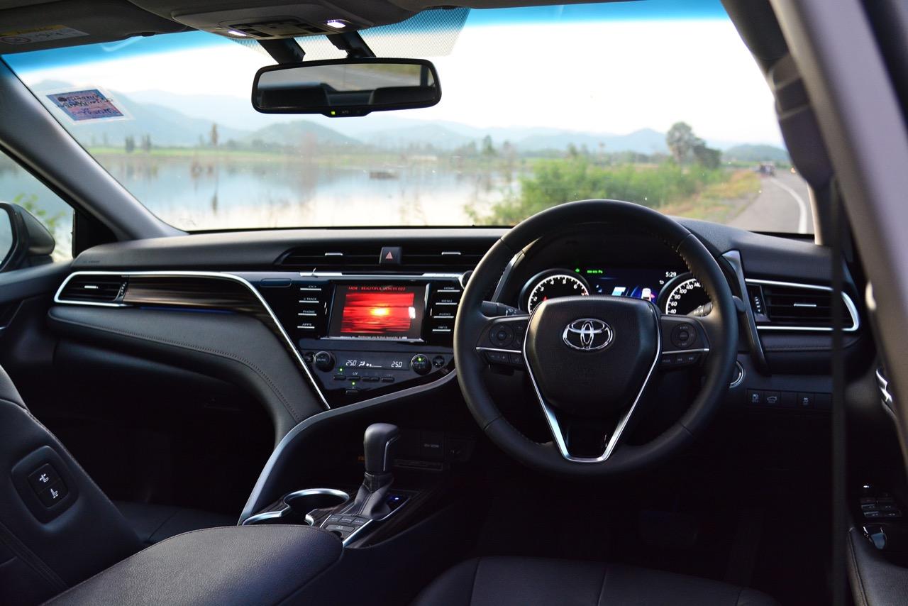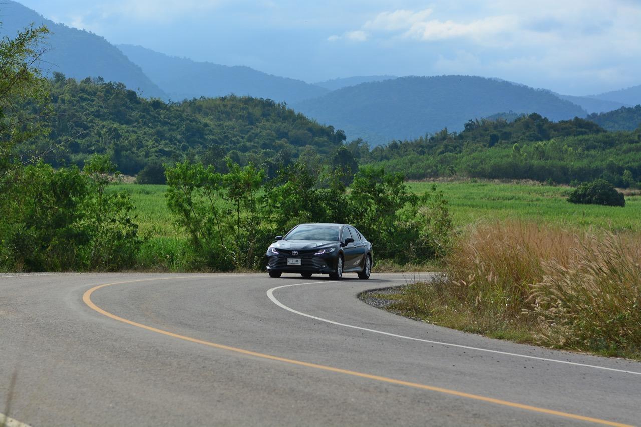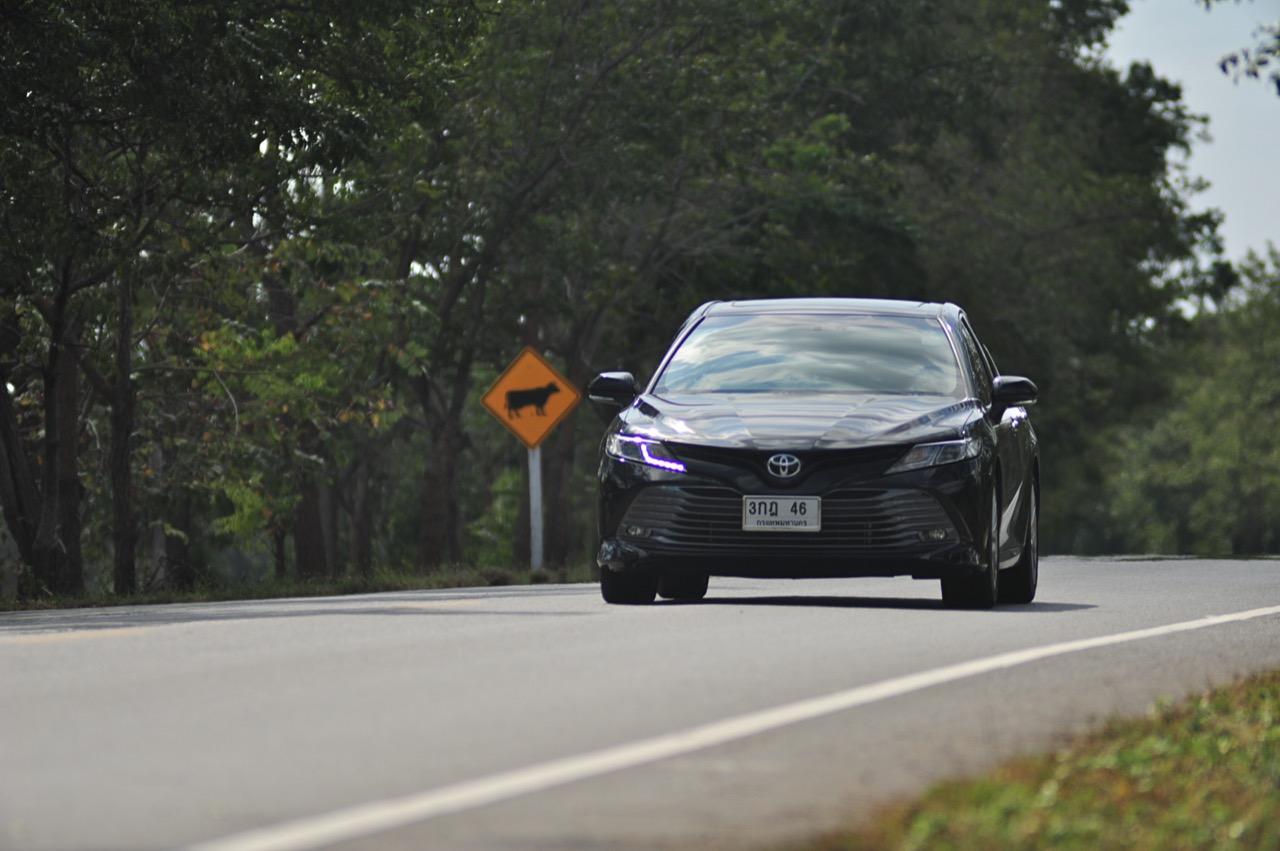 ลองในเมืองไปแล้วก็ถือว่าเป็นรถคันโตที่คล่องตัว พอเอาออกมาลองทางไกลลากกันยาวๆ จากสุพรรณฯ ไปเมืองกาญจนบุรี ก็พบกับความดีงามของแชสซีใหม่ TNGA ที่ปรับให้การควบคุมมีความสมดุลสูง การใช้แพลตฟอร์มใหม่ที่มีความยืดหยุ่นผลิตเป็นรถหลายรุ่นโดยไม่ต้องปรับเปลี่ยนมากนักแถมยังขับดีขึ้นกว่าเดิมคือความสำเร็จของ TNGA หรือ Toyota new Global Architecture กดปุ่มสตาร์ตเครื่องยนต์แต่ละทีมีเสียงเบาๆ จากการทำงานของเครื่อง 2.5 ลิตร Dynamic Force 8AT ที่มีฝูงม้าประจำการถึง 209 ตัว เมื่อทะยานไปบนไฮเวย์คุณก็จะเริ่มเข้าใจจุดประสงค์หลักของ new Camry ที่เน้นความสบายไม่ว่าจะขับหรือนั่งก็จะพบกับคำว่าผ่อนคลายทั้งสิ้นชุดบังคับเลี้ยวในรถยนต์สมัยใหม่เป็นอีกจุดที่ได้รับการใส่ใจ เนื่องจากมันจะส่งผลโดยตรงกับการบังคับควบคุมทิศทาง ถ้าทำออกมาไม่ดีการขับก็จะแย่ตามไปด้วยแบบช่วยไม่ได้ พวงมาลัยไฟฟ้าที่ได้รับการปรับเซตน้ำหนักมาใหม่หมดของ Camry 2.5G ทำให้น้ำหนักของพวงมาลัยใน new Camry 2.5G มากกว่า Camry รุ่นเก่าอย่างชัดเจน เมื่อลองหักพวงมาลัยไปมา สลับซ้ายที-ขวาที ก็จะพบว่ามันตอบสนองต่อการหักเลี้ยวได้ดีมาก ทั้งแรงต้านเบาๆ กับความแม่นยำที่ดีขึ้นกว่าเดิม เป็นรถที่พวงมาลัยดีงาม ทำให้ขับได้คล่องเหมือนกับตั้งใจจะเซตน้ำหนักของพวงมาลัยให้ออกมาเป็นแบบนี้ พวงมาลัยคล้ายรุ่นไฮบริดทั้งการหน่วงน้ำหนักไปตามความเร็วและความคมของการเปลี่ยนช่องทาง เมื่อคุณมีพวงมาลัยที่ดีก็จะทำให้การควบคุมง่ายดายขึ้นไม่ต้องคอยมานั่งแต่งโน่นเติมนี่กับพวงมาลัยเพื่อรักษาทิศทาง