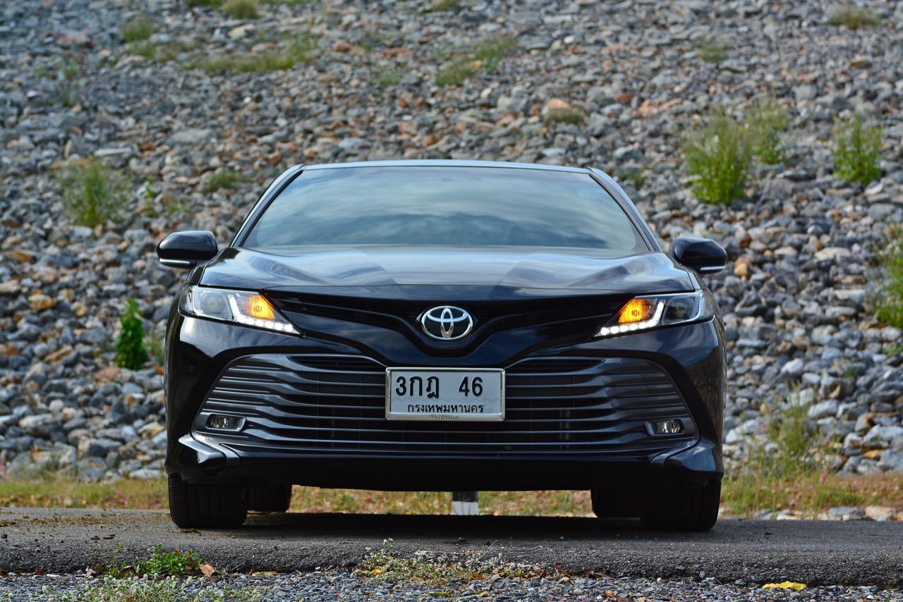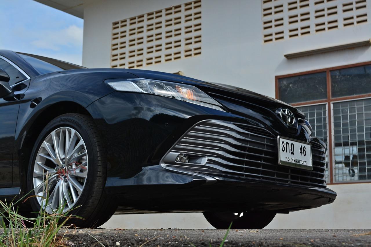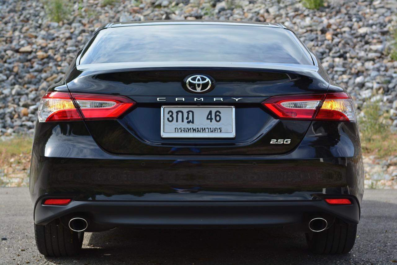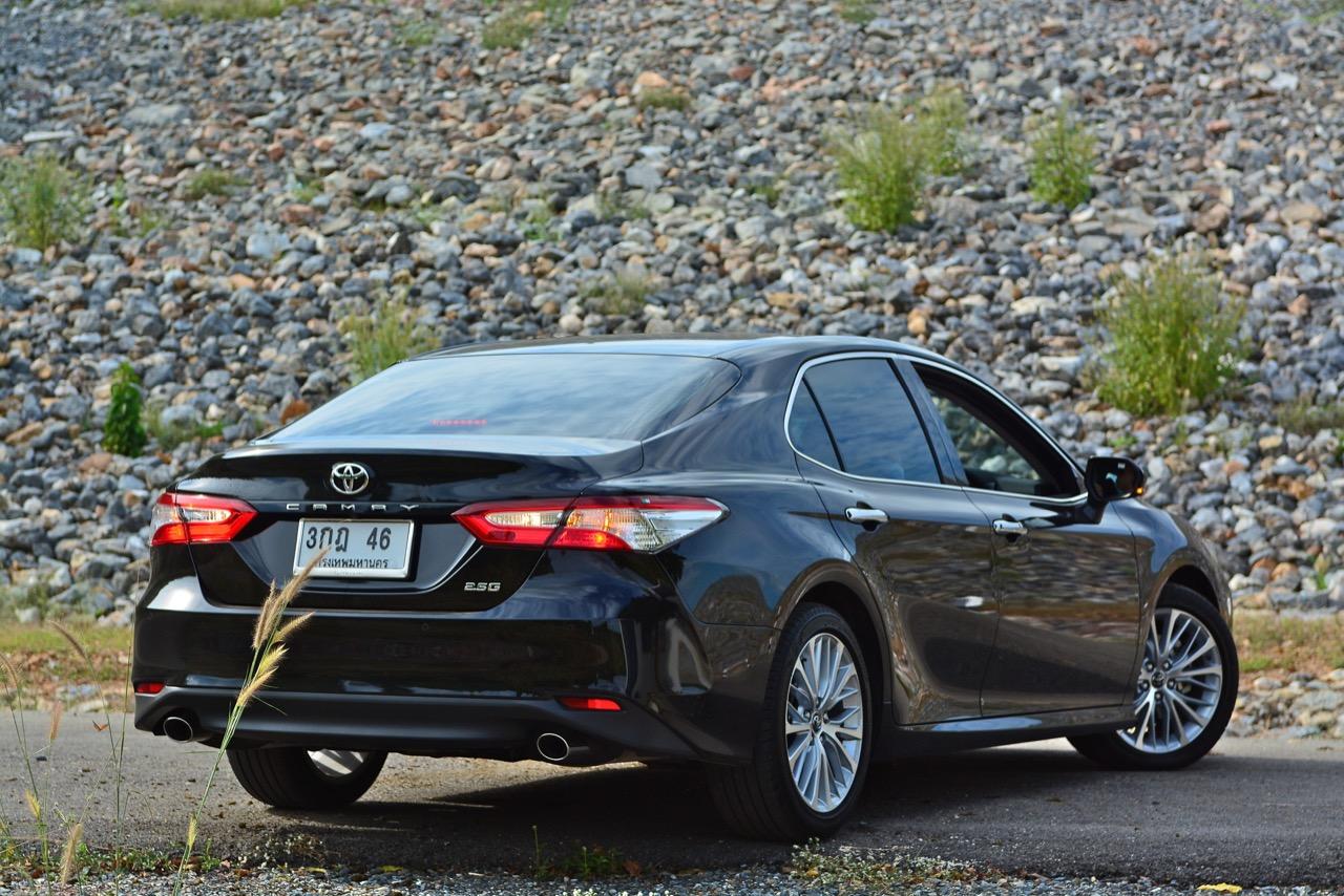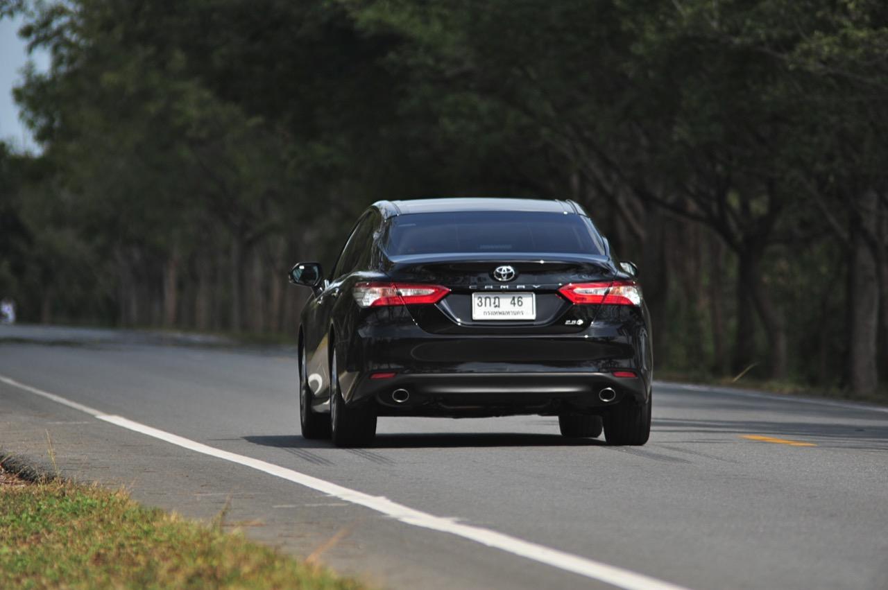 Camry ใหม่ ชูประเด็นแชสซี TNGA - toyota new global architecture ที่ทำให้รถ Toyota ยุคใหม่ขับได้ดีขึ้นอย่างผิดหูผิดตาผิดฝาผิดตัว! มันคือการรื้อฟื้นสภาพการควบคุมที่โดดเด่นผสานไปกับอุปกรณ์อำนวยความสะดวกที่ทำให้การใช้งานมีความสะดวกสบาย ราคา 1.589 ล้านบาท ของ new Camry รุ่น 2.5G อยู่ในเกณฑ์มาตรฐานไม่ได้ถูกหรือแพงแต่ถ้าจะเอาให้สุดก็ต้องไปเล่นรุ่นไฮบริดตัวท็อปที่มีอุปกรณ์เยอะกว่ามากและแพงกว่า (2.5 HV Premium มีราคา 1,799,000 บาท) หน้าตาใหม่ไม่ได้แตกต่างจากรุ่นไฮบริด ไม่ว่าจะเป็นกระจังหน้าทรงยื่นๆ พร้อมซี่ถี่ๆ ของตัวกระจัง ไฟหน้าแบบโปรเจคเตอร์พร้อมไฟหรี่กลางวัน LED Day Time Running Lights ฝากระโปรงมีเหลี่ยมมุมที่เชื่อมโยงกับไฟหน้า แก้มข้างที่มีการดึงโป่งซุ้มล้อออกมาอีกเล็กน้อย มันเป็นรถที่เตี้ยกว่า Camry รุ่นที่แล้วถึง 10 มิลลิเมตร และดูเตี้ยกว่าเดิมเมื่ออยู่ในสีดำ มิติและน้ำหนักของ new Camry 2.5G ยาว 4,885 มิลลิเมตร กว้าง 1,840 มิลลิเมตร สูง 1,445 มิลลิเมตร ฐานล้อ 2,825 มิลลิเมตร ระยะต่ำสุดจากพื้นถึงใต้ท้อง 140 มิลลิเมตร น้ำหนักรถ 1,550 กิโลกรัม ความจุถังเชื้อเพลิง 50 ลิตร ล้ออัลลอยขอบ 18 นิ้วห่อรัดด้วยยาง bridgestone turanza ไซส์ 235/45R18 94W เป็นยางที่ออกแบบมาสำหรับเพิ่มสมรรถนะของซาลูนไซส์กลาง เน้นความนุ่มเงียบและคงทน บั้นท้ายเรียบๆ พร้อมไฟท้ายทรงยาวแบบรถผู้บริหารทำออกมาได้ดี ฝาท้ายแบบแมนนวลเปิด-ปิดด้วยมือ ยกขึ้น-ลง หรือเปิด-ปิดได้ง่าย สำหรับพื้นที่เก็บสัมภาระใต้ฝากระโปรงหลังก็มากพอที่จะยัดกระเป๋าเดินทางหรือถุง Golf ได้อย่างสบาย พร้อมกระเป๋าเดินทางใบโต