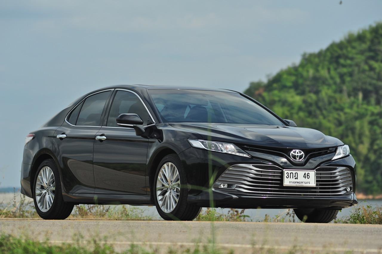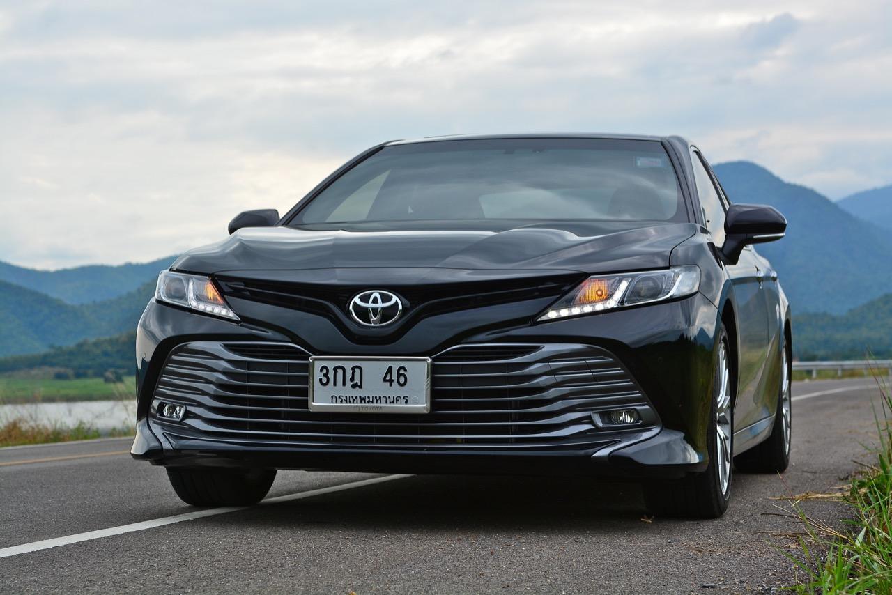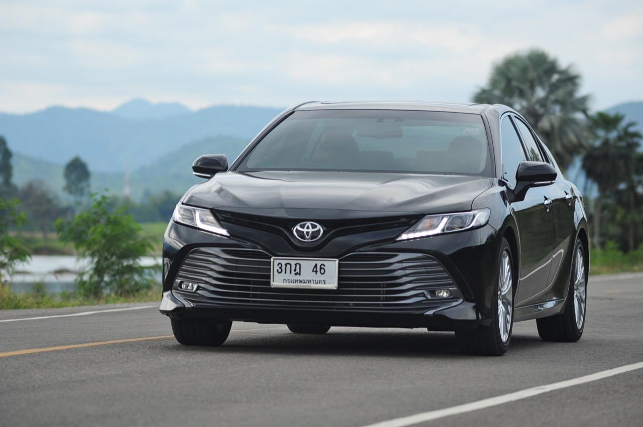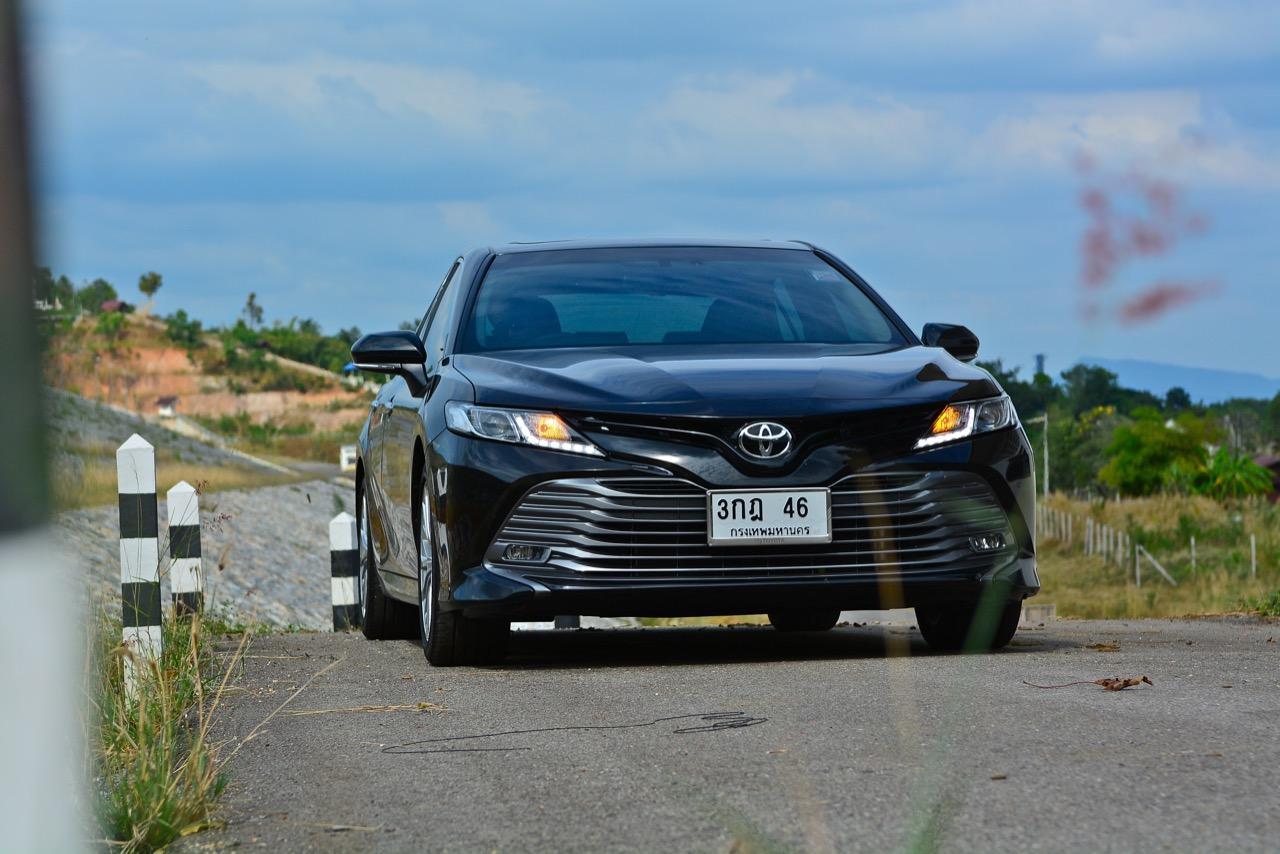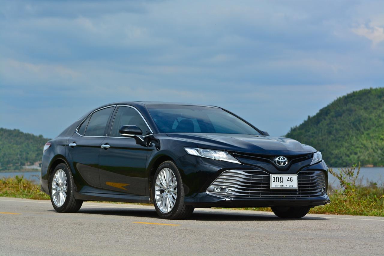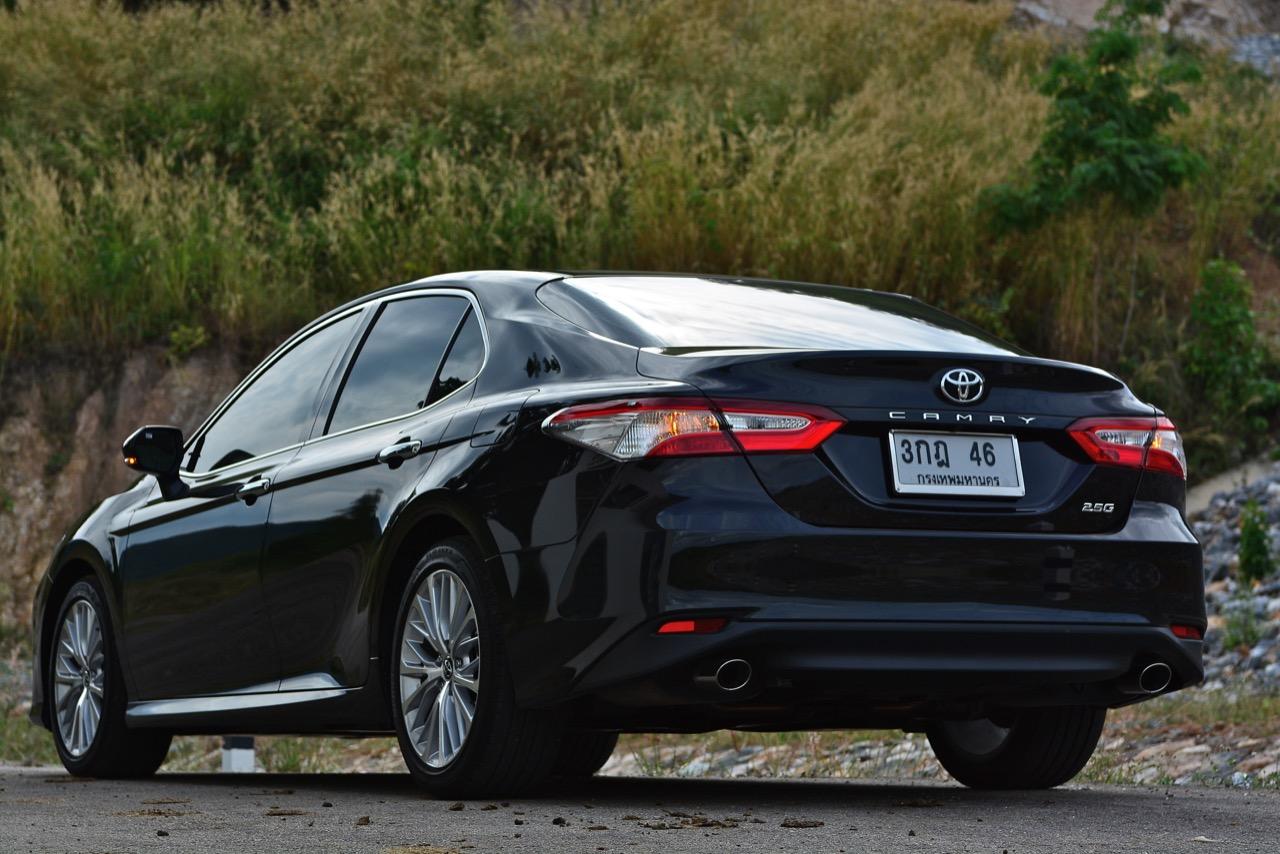 Camry ใหม่ ชูประเด็นแชสซี TNGA - toyota new global architecture ที่ทำให้รถ Toyota ยุคใหม่ขับได้ดีขึ้นอย่างผิดหูผิดตาผิดฝาผิดตัว! มันคือการรื้อฟื้นสภาพการควบคุมที่โดดเด่นผสานไปกับอุปกรณ์อำนวยความสะดวกที่ทำให้การใช้งานมีความสะดวกสบาย ราคา 1.589 ล้านบาท ของ new Camry รุ่น 2.5G อยู่ในเกณฑ์มาตรฐานไม่ได้ถูกหรือแพงแต่ถ้าจะเอาให้สุดก็ต้องไปเล่นรุ่นไฮบริดตัวท็อปที่มีอุปกรณ์เยอะกว่ามากและแพงกว่า (2.5 HV Premium มีราคา 1,799,000 บาท) หน้าตาใหม่ไม่ได้แตกต่างจากรุ่นไฮบริด ไม่ว่าจะเป็นกระจังหน้าทรงยื่นๆ พร้อมซี่ถี่ๆ ของตัวกระจัง ไฟหน้าแบบโปรเจคเตอร์พร้อมไฟหรี่กลางวัน LED Day Time Running Lights ฝากระโปรงมีเหลี่ยมมุมที่เชื่อมโยงกับไฟหน้า แก้มข้างที่มีการดึงโป่งซุ้มล้อออกมาอีกเล็กน้อย มันเป็นรถที่เตี้ยกว่า Camry รุ่นที่แล้วถึง 10 มิลลิเมตร และดูเตี้ยกว่าเดิมเมื่ออยู่ในสีดำ มิติและน้ำหนักของ new Camry 2.5G ยาว 4,885 มิลลิเมตร กว้าง 1,840 มิลลิเมตร สูง 1,445 มิลลิเมตร ฐานล้อ 2,825 มิลลิเมตร ระยะต่ำสุดจากพื้นถึงใต้ท้อง 140 มิลลิเมตร น้ำหนักรถ 1,550 กิโลกรัม ความจุถังเชื้อเพลิง 50 ลิตร ล้ออัลลอยขอบ 18 นิ้วห่อรัดด้วยยาง bridgestone turanza ไซส์ 235/45R18 94W เป็นยางที่ออกแบบมาสำหรับเพิ่มสมรรถนะของซาลูนไซส์กลาง เน้นความนุ่มเงียบและคงทน บั้นท้ายเรียบๆ พร้อมไฟท้ายทรงยาวแบบรถผู้บริหารทำออกมาได้ดี ฝาท้ายแบบแมนนวลเปิด-ปิดด้วยมือ ยกขึ้น-ลง หรือเปิด-ปิดได้ง่าย สำหรับพื้นที่เก็บสัมภาระใต้ฝากระโปรงหลังก็มากพอที่จะยัดกระเป๋าเดินทางหรือถุง Golf ได้อย่างสบาย พร้อมกระเป๋าเดินทางใบโต