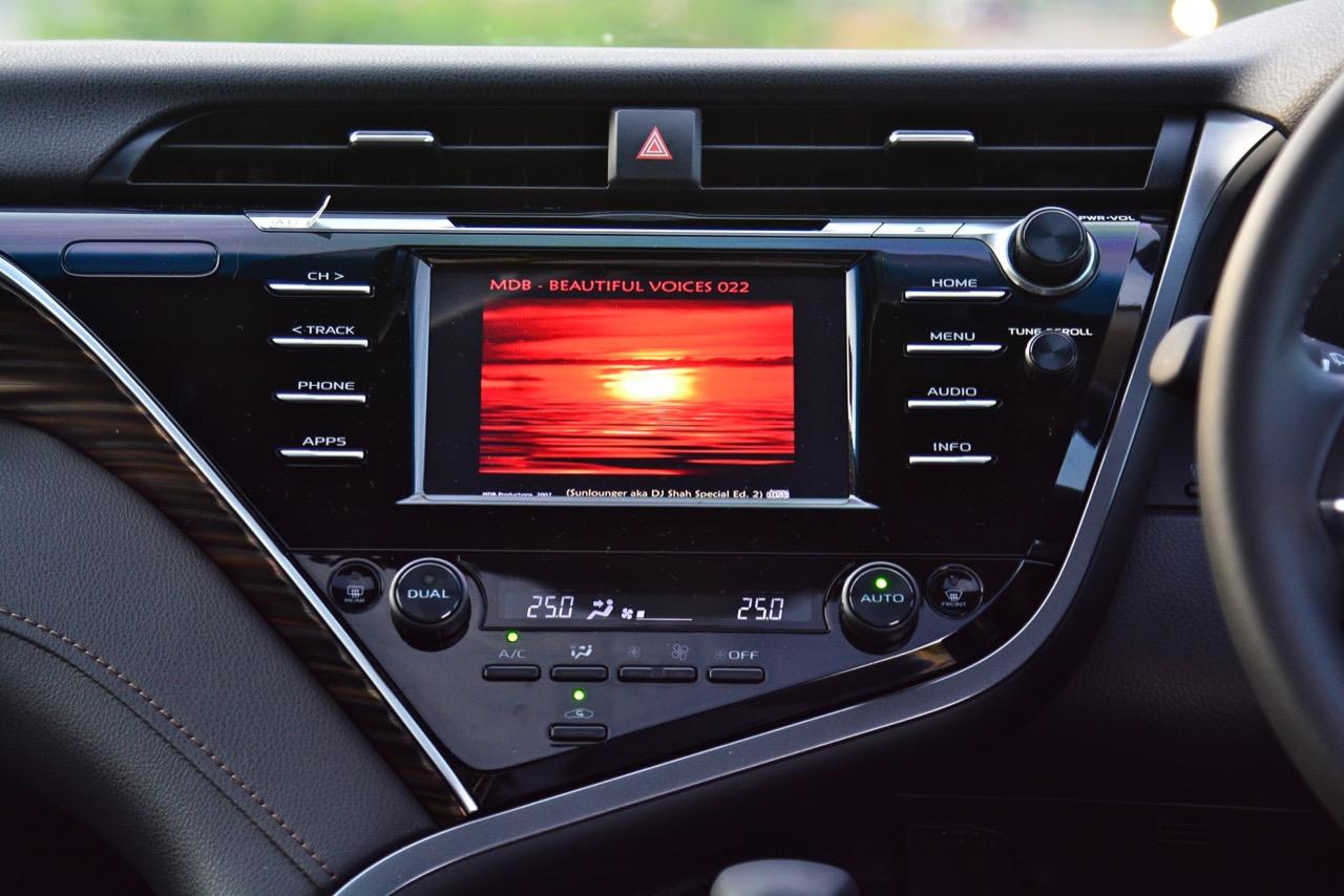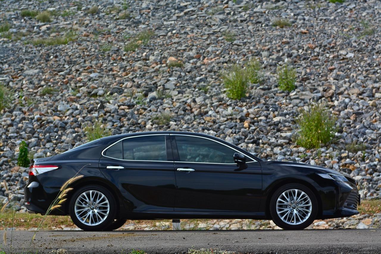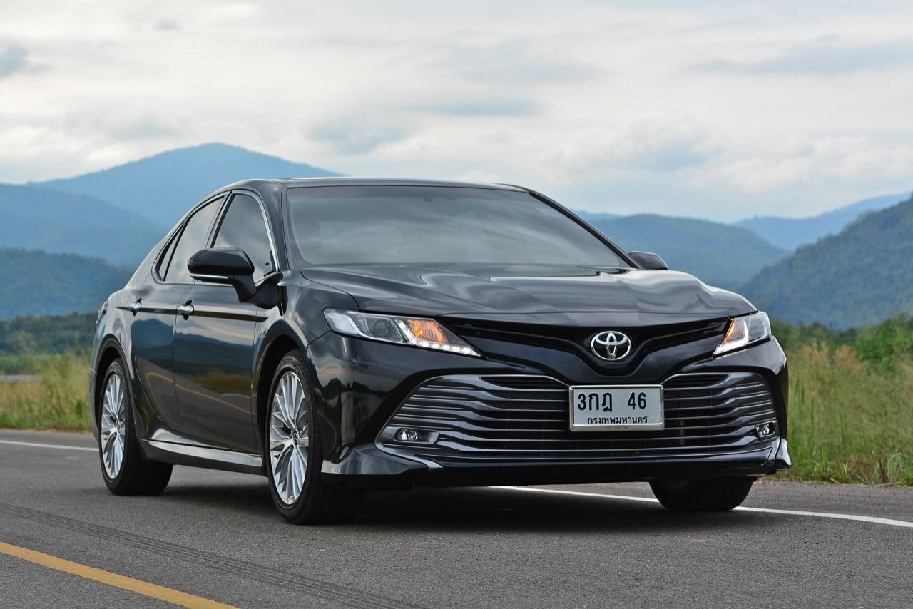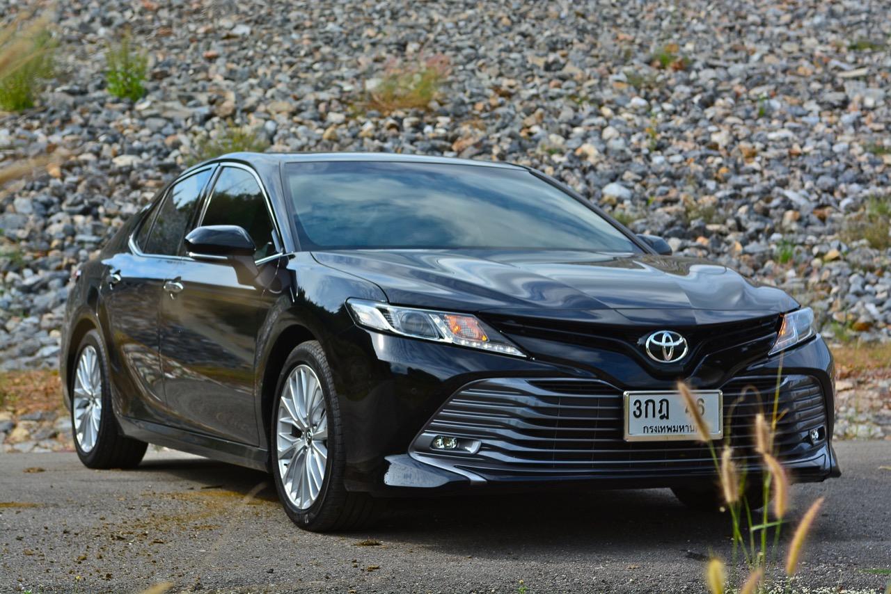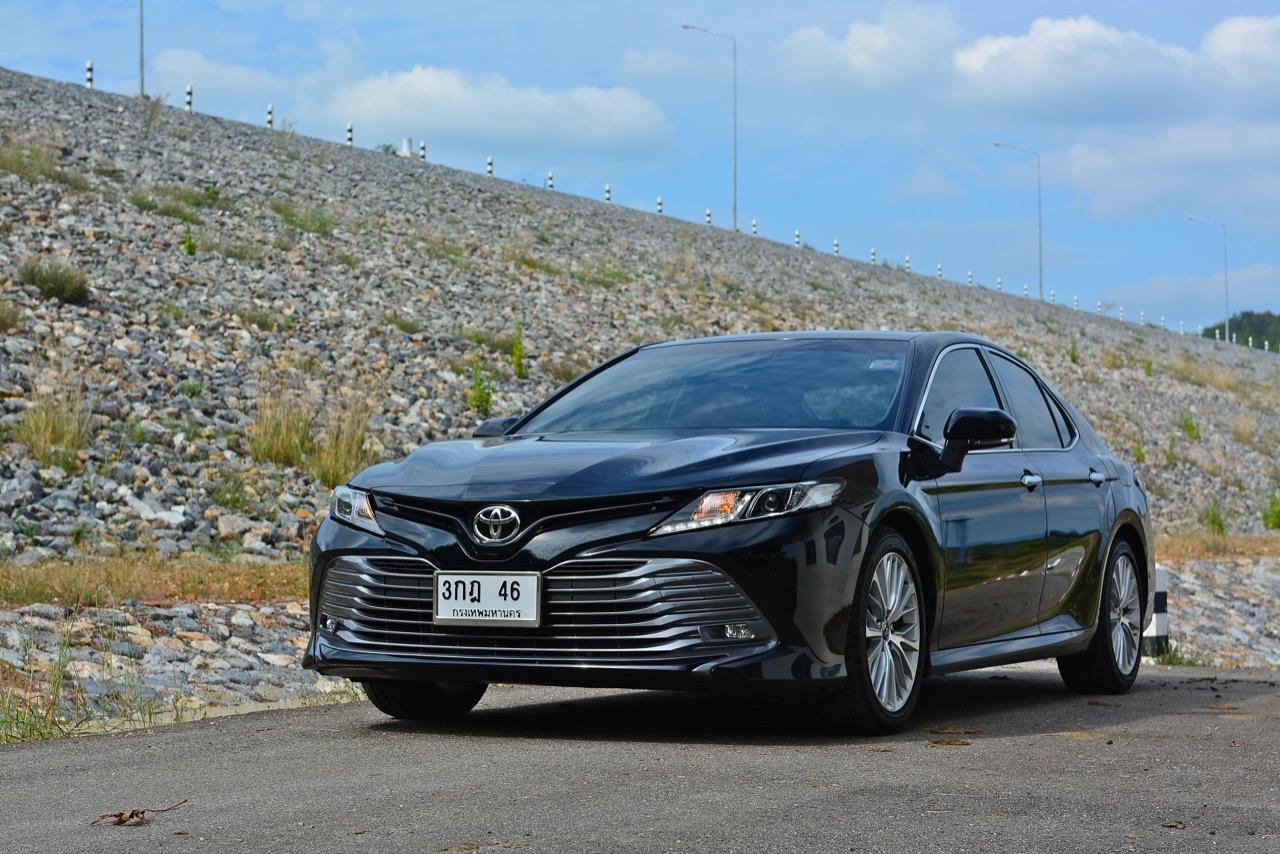 Camry ใหม่ ชูประเด็นแชสซี TNGA - toyota new global architecture ที่ทำให้รถ Toyota ยุคใหม่ขับได้ดีขึ้นอย่างผิดหูผิดตาผิดฝาผิดตัว! มันคือการรื้อฟื้นสภาพการควบคุมที่โดดเด่นผสานไปกับอุปกรณ์อำนวยความสะดวกที่ทำให้การใช้งานมีความสะดวกสบาย ราคา 1.589 ล้านบาท ของ new Camry รุ่น 2.5G อยู่ในเกณฑ์มาตรฐานไม่ได้ถูกหรือแพงแต่ถ้าจะเอาให้สุดก็ต้องไปเล่นรุ่นไฮบริดตัวท็อปที่มีอุปกรณ์เยอะกว่ามากและแพงกว่า (2.5 HV Premium มีราคา 1,799,000 บาท) หน้าตาใหม่ไม่ได้แตกต่างจากรุ่นไฮบริด ไม่ว่าจะเป็นกระจังหน้าทรงยื่นๆ พร้อมซี่ถี่ๆ ของตัวกระจัง ไฟหน้าแบบโปรเจคเตอร์พร้อมไฟหรี่กลางวัน LED Day Time Running Lights ฝากระโปรงมีเหลี่ยมมุมที่เชื่อมโยงกับไฟหน้า แก้มข้างที่มีการดึงโป่งซุ้มล้อออกมาอีกเล็กน้อย มันเป็นรถที่เตี้ยกว่า Camry รุ่นที่แล้วถึง 10 มิลลิเมตร และดูเตี้ยกว่าเดิมเมื่ออยู่ในสีดำ มิติและน้ำหนักของ new Camry 2.5G ยาว 4,885 มิลลิเมตร กว้าง 1,840 มิลลิเมตร สูง 1,445 มิลลิเมตร ฐานล้อ 2,825 มิลลิเมตร ระยะต่ำสุดจากพื้นถึงใต้ท้อง 140 มิลลิเมตร น้ำหนักรถ 1,550 กิโลกรัม ความจุถังเชื้อเพลิง 50 ลิตร ล้ออัลลอยขอบ 18 นิ้วห่อรัดด้วยยาง bridgestone turanza ไซส์ 235/45R18 94W เป็นยางที่ออกแบบมาสำหรับเพิ่มสมรรถนะของซาลูนไซส์กลาง เน้นความนุ่มเงียบและคงทน บั้นท้ายเรียบๆ พร้อมไฟท้ายทรงยาวแบบรถผู้บริหารทำออกมาได้ดี ฝาท้ายแบบแมนนวลเปิด-ปิดด้วยมือ ยกขึ้น-ลง หรือเปิด-ปิดได้ง่าย สำหรับพื้นที่เก็บสัมภาระใต้ฝากระโปรงหลังก็มากพอที่จะยัดกระเป๋าเดินทางหรือถุง Golf ได้อย่างสบาย พร้อมกระเป๋าเดินทางใบโต