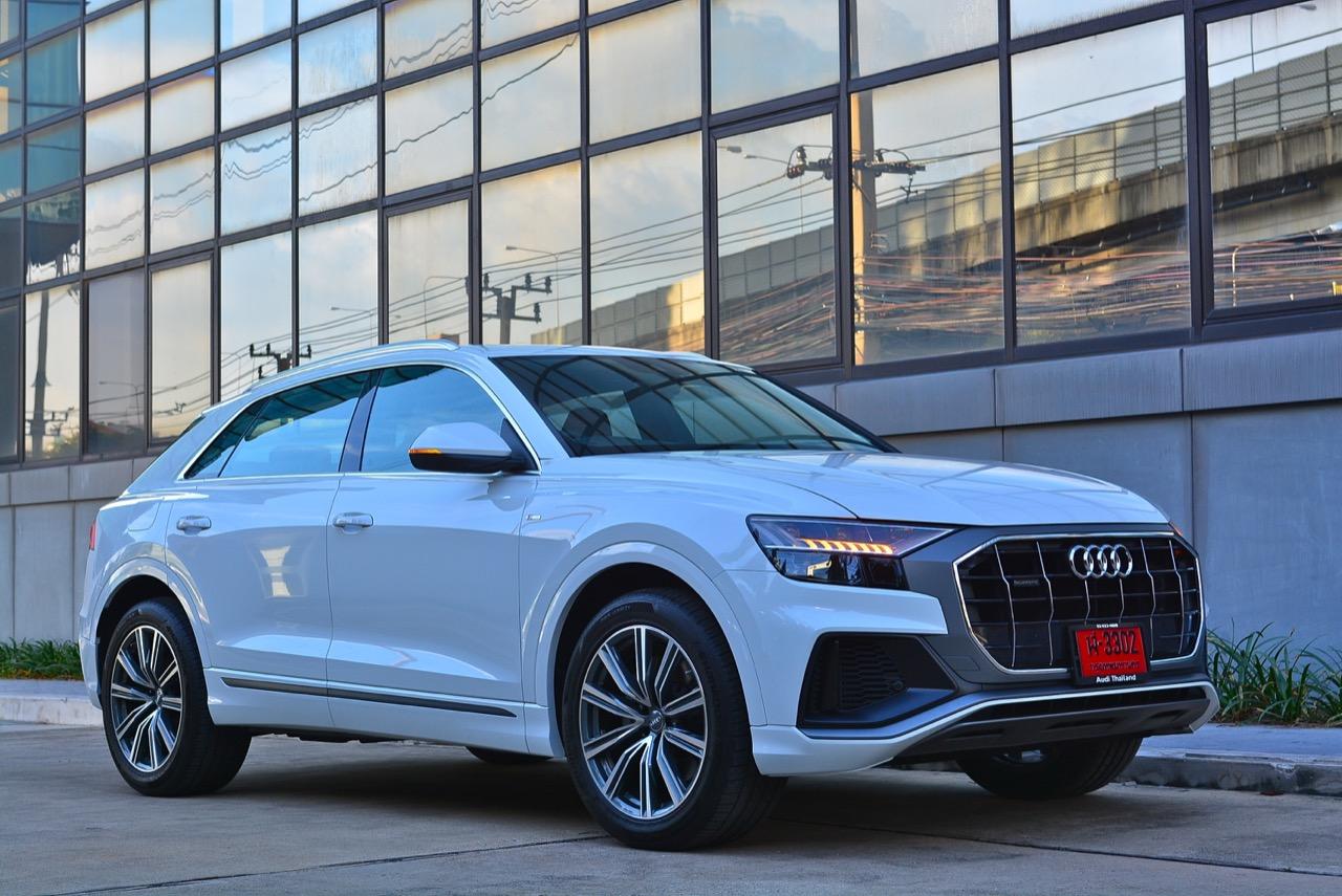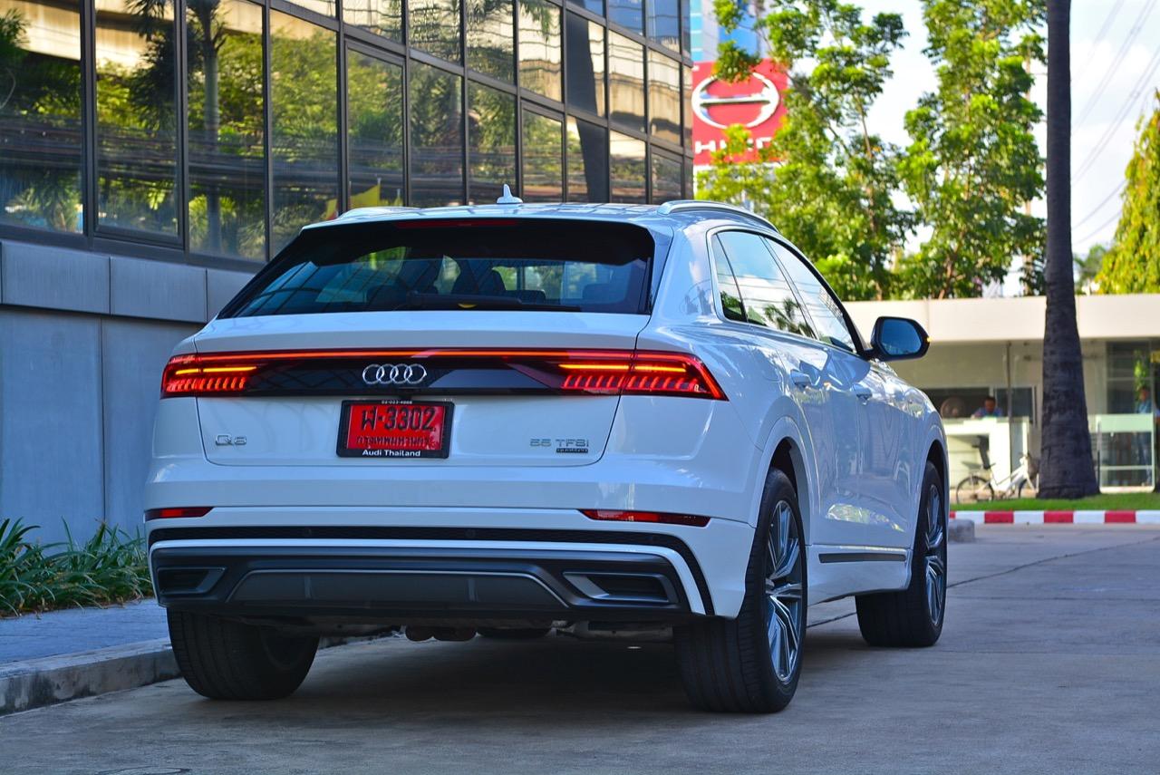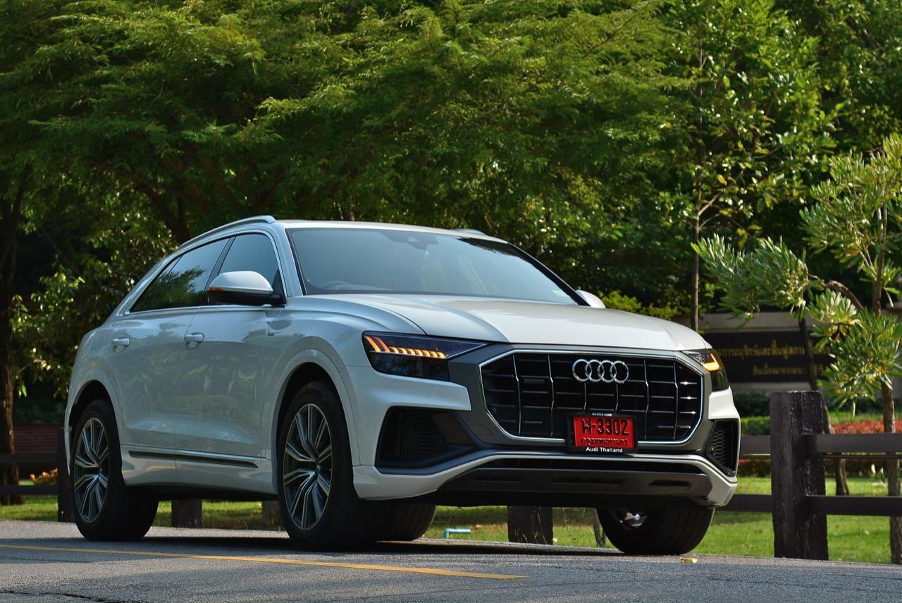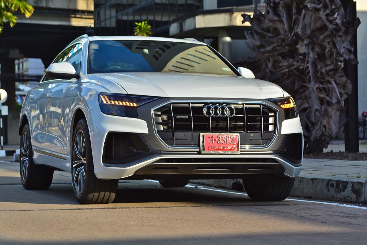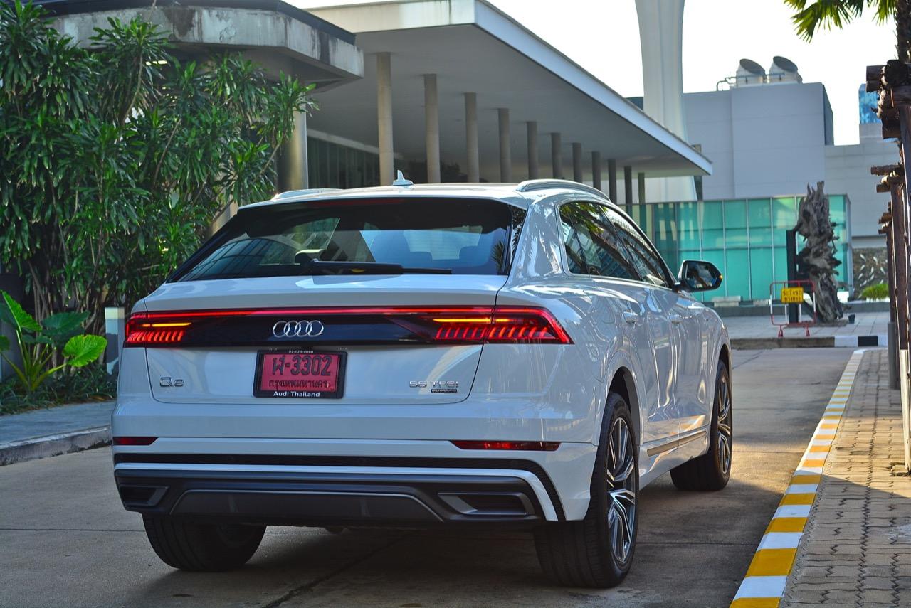 Audi Q8 เป็นรถที่มีความสุดยอดในหลายด้าน เริ่มจากขนาดตัวถังที่ใหญ่โต ระบบขับเคลื่อนที่มีประสิทธิภาพสูง (มาก) ช่วงล่างที่ถูกจูนมาอย่างดีจากมืออาชีพที่เข้าอกเข้าใจในความต้องการของเจ้าของรถ สำหรับบริษัทที่ให้ความสำคัญกับการขับอย่าง Audi ทุกอย่างต้องดีกว่าเสมอ เวอร์ชั่นต้นแบบที่เปิดตัวตามด้วยรุ่นผลิตจริงที่คลอดออกมาในช่วงปลายปี 2018 หลังจากออกขายไม่นาน Audi Q8 ก็ประสบความสำเร็จจากเสียงตอบรับของลูกค้าที่บรรยายถึงการขับขี่ที่ดีของมัน จากการที่เป็นรถเอสยูวีคันใหญ่ หน้าตาทันสมัยพร้อมอุปกรณ์ภายในที่เน้นความหรูหราเพื่อจับลูกค้ามหาเศรษฐี แม้จะมีขนาดเท่ากับ Q7 แต่ Q8 55TFSi สวยกว่าในด้านของหน้าตา กระจังหน้าทรง 8 เหลี่ยมขนาดใหญ่ที่โดนใจคนรวย ไฟหน้าออกแนวดุดันคอยเตือนให้รถที่วิ่งช้ากว่าหลีกทางให้โดยที่คุณไม่ต้องยกไฟเตือน Audi พยายามวางตำแหน่งของ Q8 ให้มีความเหนือชั้นกว่ารถรุ่นพี่อย่าง Q7 ด้วยอุปกรณ์ภายในยุคใหม่ของแบรนด์ 4 ห่วง ราคา 6.7 ล้านของมันแพงกว่า Porsche Cayenne E-Hybrid เล็กน้อย มันเป็นเอสยูวีรุ่นเดียวของ Audi ที่ให้ของมาครบไม่ว่าจะเป็นหลังคากระจก Panoramic ช่วงล่างแบบถุงลม Air Suspension ทำงานแบบ Active ระบบ MMI Navigation plus with MMI touch response ที่แม้แต่นักวิทยาศาสตร์รุ่นใหม่ก็ยังต้องทึ่งในความไฮเทค Audi Q8 55TFSi Quattro S-Line ใช้ล้ออะลูมิเนียมขนาด 21 นิ้วทั้ง 4 ล้อ เป็นล้อลายใหม่ล่าสุด ห่อรัดด้วยยางเกาหลีประสิทธิภาพระดับโลกยี่ห้อ Hankook รุ่น Ventus s1 evo 3 SUV ไซส์ 285/45R21 113Y ระบบกันสะเทือนติดตั้งโช้คอัพและสปริงแบบถุงลมหรือ Air Suspension ทำงานในระบบ Adaptive สามารถปรับหรือลดระดับความสูงได้อย่างหลากหลาย ในส่วนของระบบเบรก เนื่องจากมีน้ำหนักตัวมากถึง 2 ตัน เบรกหน้าของ Q8 เป็นแบบ 6 พอต คาร์ลิปเปอร์อะลูมิเนียมสีเทาไม่มีการพ่นสีที่คาร์ลิปเปอร์