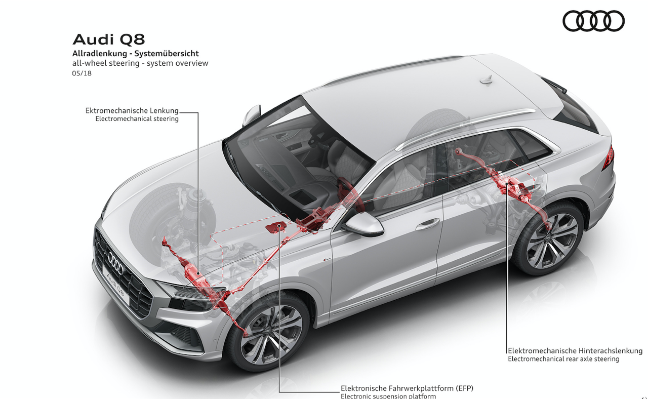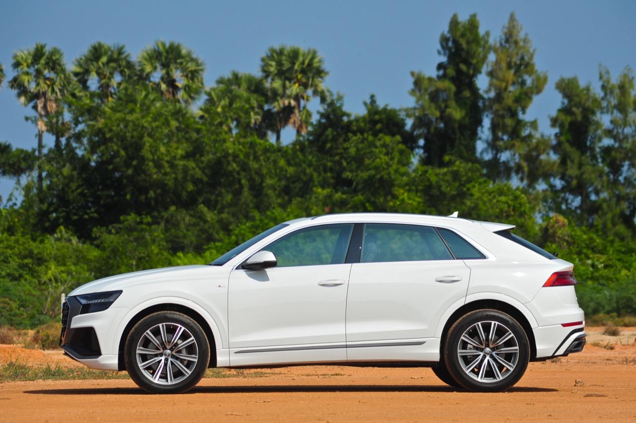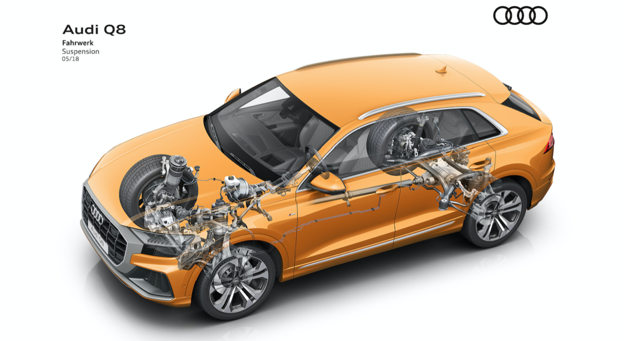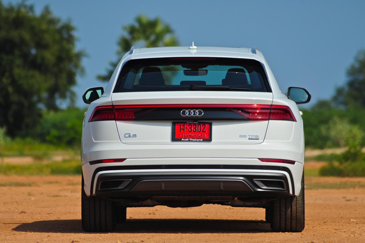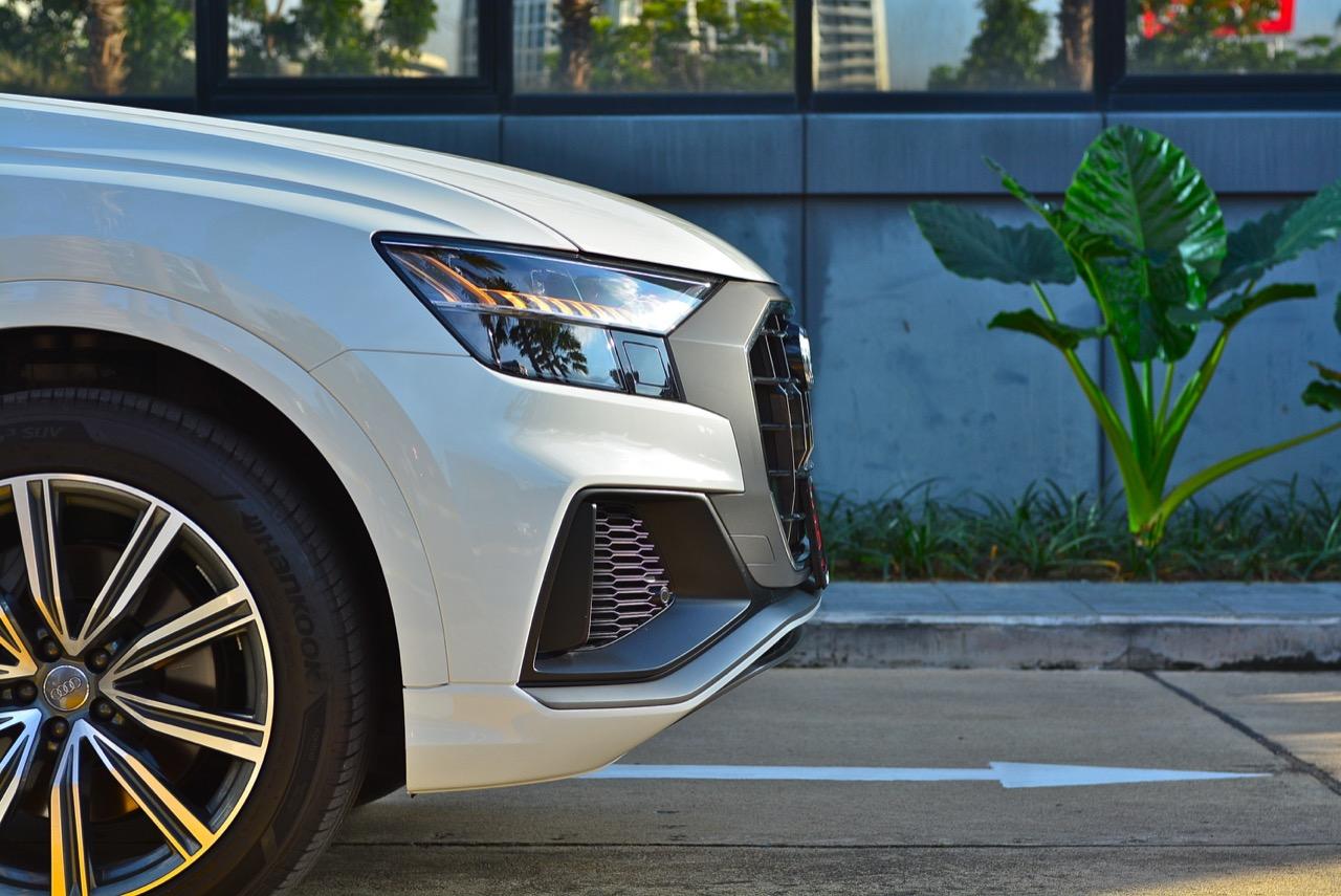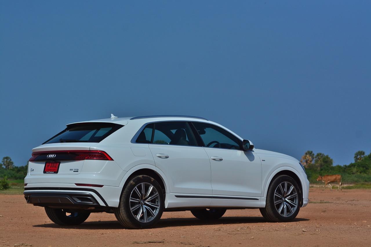 Audi Q8 เป็นรถที่มีความสุดยอดในหลายด้าน เริ่มจากขนาดตัวถังที่ใหญ่โต ระบบขับเคลื่อนที่มีประสิทธิภาพสูง (มาก) ช่วงล่างที่ถูกจูนมาอย่างดีจากมืออาชีพที่เข้าอกเข้าใจในความต้องการของเจ้าของรถ สำหรับบริษัทที่ให้ความสำคัญกับการขับอย่าง Audi ทุกอย่างต้องดีกว่าเสมอ เวอร์ชั่นต้นแบบที่เปิดตัวตามด้วยรุ่นผลิตจริงที่คลอดออกมาในช่วงปลายปี 2018 หลังจากออกขายไม่นาน Audi Q8 ก็ประสบความสำเร็จจากเสียงตอบรับของลูกค้าที่บรรยายถึงการขับขี่ที่ดีของมัน จากการที่เป็นรถเอสยูวีคันใหญ่ หน้าตาทันสมัยพร้อมอุปกรณ์ภายในที่เน้นความหรูหราเพื่อจับลูกค้ามหาเศรษฐี แม้จะมีขนาดเท่ากับ Q7 แต่ Q8 55TFSi สวยกว่าในด้านของหน้าตา กระจังหน้าทรง 8 เหลี่ยมขนาดใหญ่ที่โดนใจคนรวย ไฟหน้าออกแนวดุดันคอยเตือนให้รถที่วิ่งช้ากว่าหลีกทางให้โดยที่คุณไม่ต้องยกไฟเตือน Audi พยายามวางตำแหน่งของ Q8 ให้มีความเหนือชั้นกว่ารถรุ่นพี่อย่าง Q7 ด้วยอุปกรณ์ภายในยุคใหม่ของแบรนด์ 4 ห่วง ราคา 6.7 ล้านของมันแพงกว่า Porsche Cayenne E-Hybrid เล็กน้อย มันเป็นเอสยูวีรุ่นเดียวของ Audi ที่ให้ของมาครบไม่ว่าจะเป็นหลังคากระจก Panoramic ช่วงล่างแบบถุงลม Air Suspension ทำงานแบบ Active ระบบ MMI Navigation plus with MMI touch response ที่แม้แต่นักวิทยาศาสตร์รุ่นใหม่ก็ยังต้องทึ่งในความไฮเทค Audi Q8 55TFSi Quattro S-Line ใช้ล้ออะลูมิเนียมขนาด 21 นิ้วทั้ง 4 ล้อ เป็นล้อลายใหม่ล่าสุด ห่อรัดด้วยยางเกาหลีประสิทธิภาพระดับโลกยี่ห้อ Hankook รุ่น Ventus s1 evo 3 SUV ไซส์ 285/45R21 113Y ระบบกันสะเทือนติดตั้งโช้คอัพและสปริงแบบถุงลมหรือ Air Suspension ทำงานในระบบ Adaptive สามารถปรับหรือลดระดับความสูงได้อย่างหลากหลาย ในส่วนของระบบเบรก เนื่องจากมีน้ำหนักตัวมากถึง 2 ตัน เบรกหน้าของ Q8 เป็นแบบ 6 พอต คาร์ลิปเปอร์อะลูมิเนียมสีเทาไม่มีการพ่นสีที่คาร์ลิปเปอร์