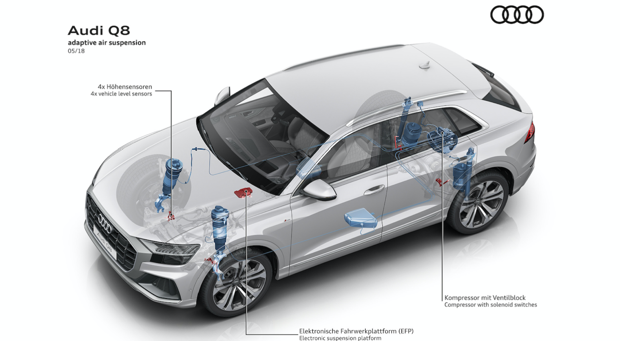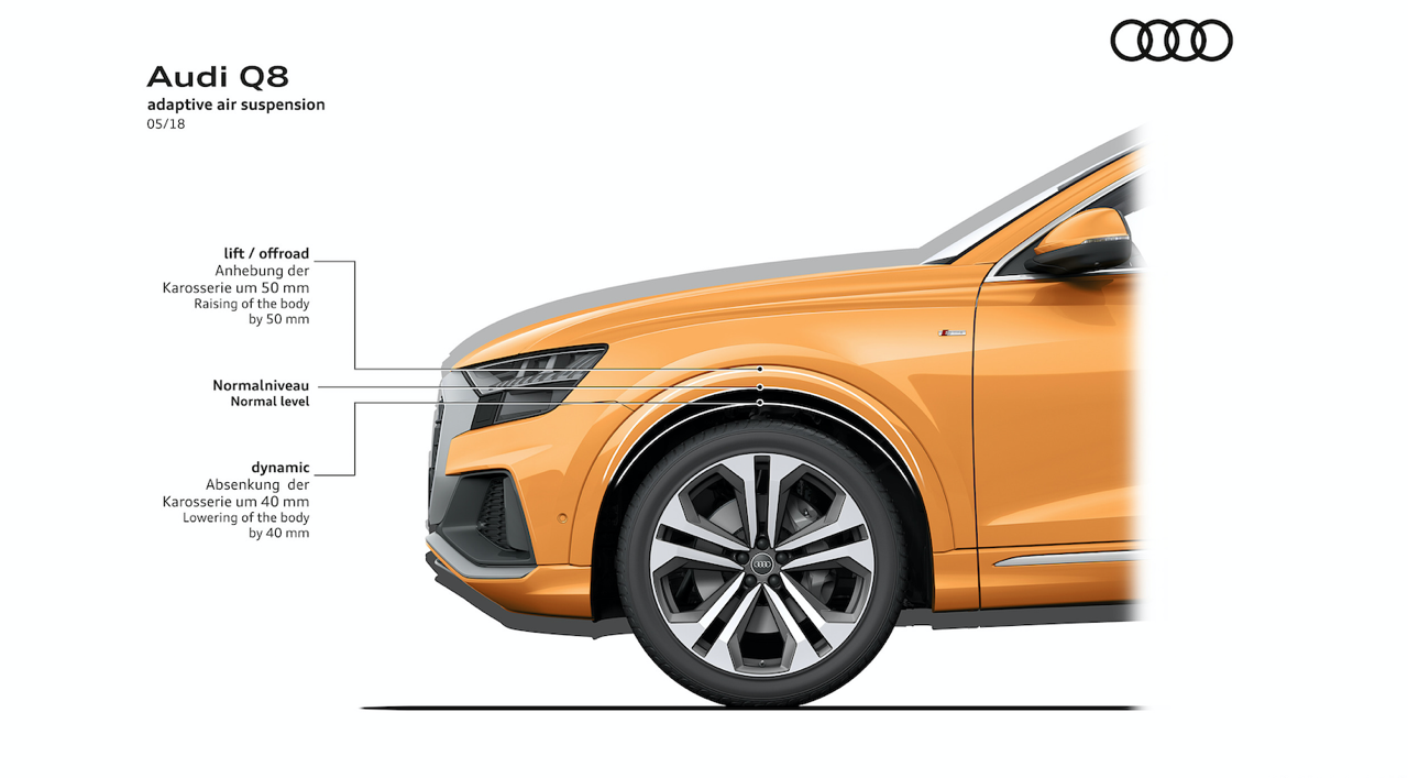 ระบบรองรับใน Audi Q8 55TFSi Quattro S-Line ใช้กันสะเทือนแบบ Five Link ทั้งด้านหน้าและด้านหลัง แขนยึดผลิตจากอะลูมินั่มอัลลอย เพื่อลดน้ำหนักส่วนเกินใต้สปริง ติดตั้งโช้คอัพไฟฟ้ามาพร้อมชุดควบคุม CDC continuous damping control เป็นอุปกรณ์มาตรฐานไม่ต้องควักเงินเพิ่มแต่อย่างใดทั้งสิ้น ระบบ Adaptive Suspension ใช้ถุงลมปรับระดับความสูง-ต่ำของตัวรถได้อย่างหลากหลายเพื่อขับเร็วๆ บนไฮเวย์หรือลุยทางวิบาก ช่วงล่างแบบ Adaptive Air Suspension ของ Q8 ทำให้มันเตี้ยกว่า Q7 55TDi ที่ใช้ช่วงล่างแบบมาตรฐาน 15 มิลลิเมตร มีระยะความสูงจากพื้นถึงใต้ท้องรถ 220 มิลลิเมตร สามารถเลือกปรับตั้งได้ 4 โหมด ตามรูปแบบของการขับขี่ ในโหมด Lift-off Road ที่ความเร็วไม่เกิน 30 กิโลเมตรต่อชั่วโมง ช่วงล่างจะปรับระดับโดยยกความสูงขึ้นอีก 50 มิลลิเมตร และจะปรับเตี้ยลงโดยอัตโนมัติเมื่อใช้ความเร็วเพิ่มขึ้นเพื่อลดแรงต้านของอากาศและเพิ่มประสิทธิภาพด้านการลดอาการโคลงตัว