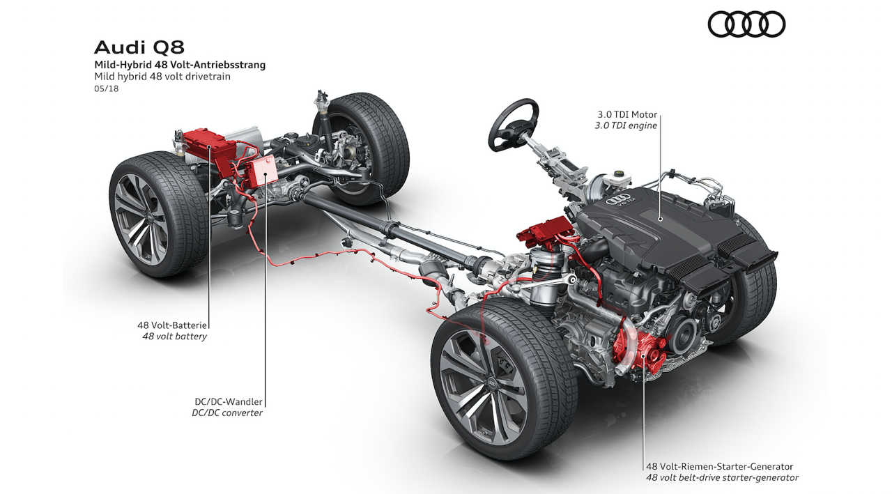 Audi Q8 ติดตั้งระบบ mild hybrid (MHEV) แยกระบบไฟฟ้าออกเป็น 2 วงจร ใช้วงจรไฟ 12 โวลต์แบบดั้งเดิมสำหรับการใช้งานในอุปกรณ์ไฟฟ้าติดรถทั่วไป อีกหนึ่งวงจรนั่นก็คือแบบ 48 โวลต์ รองรับระบบไฮบริด ระบบบังคับเลี้ยว 4 ล้อซึ่งต้องใช้ความเร็วในการตอบสนอง ตัวเลขสมรรถนะของ Q8 เร่งจาก 0-100 กิโลเมตรต่อชั่วโมงใน 6.3 วินาที โดยมีความเร็วสูงสุดมากถึง 250 กิโลเมตรต่อชั่วโมง